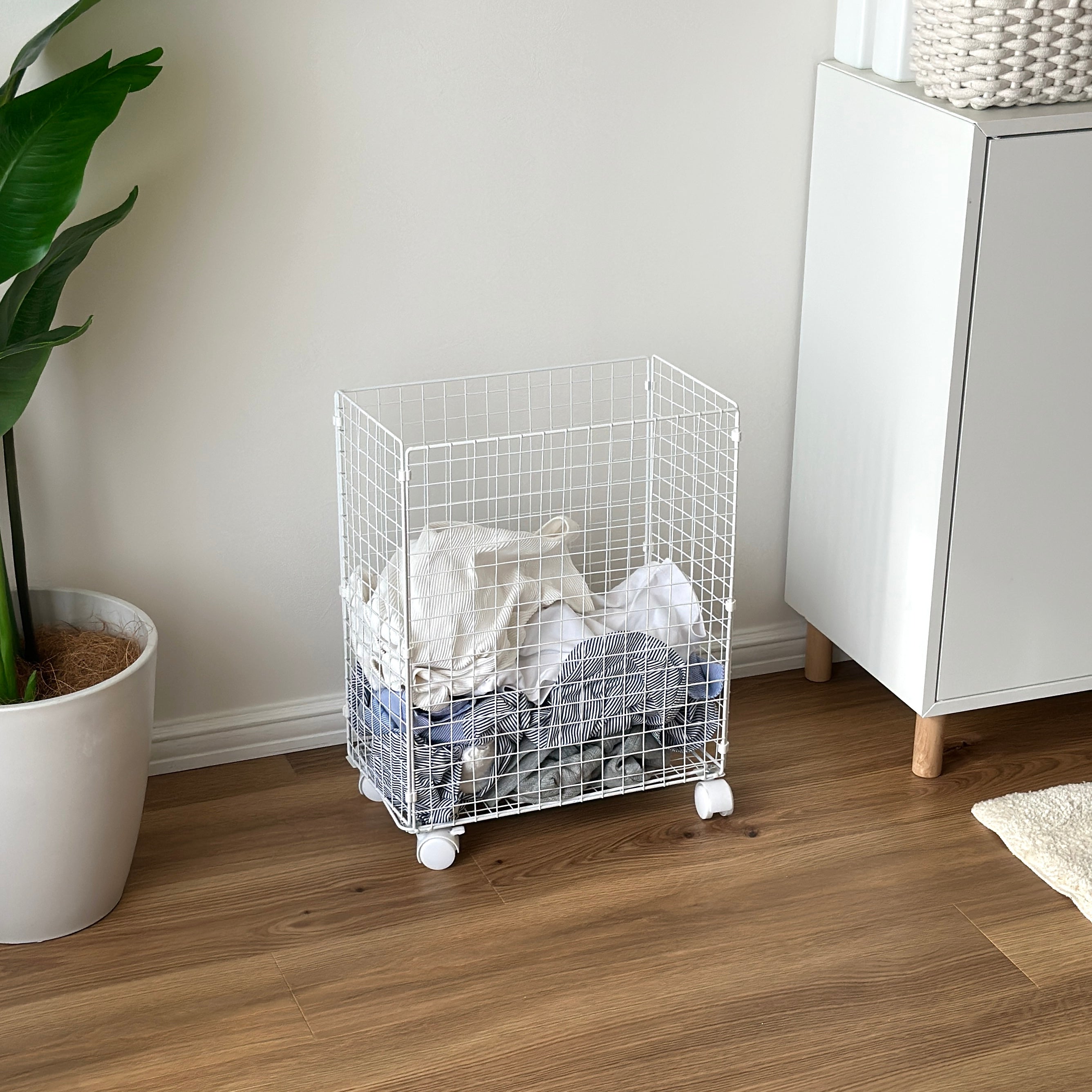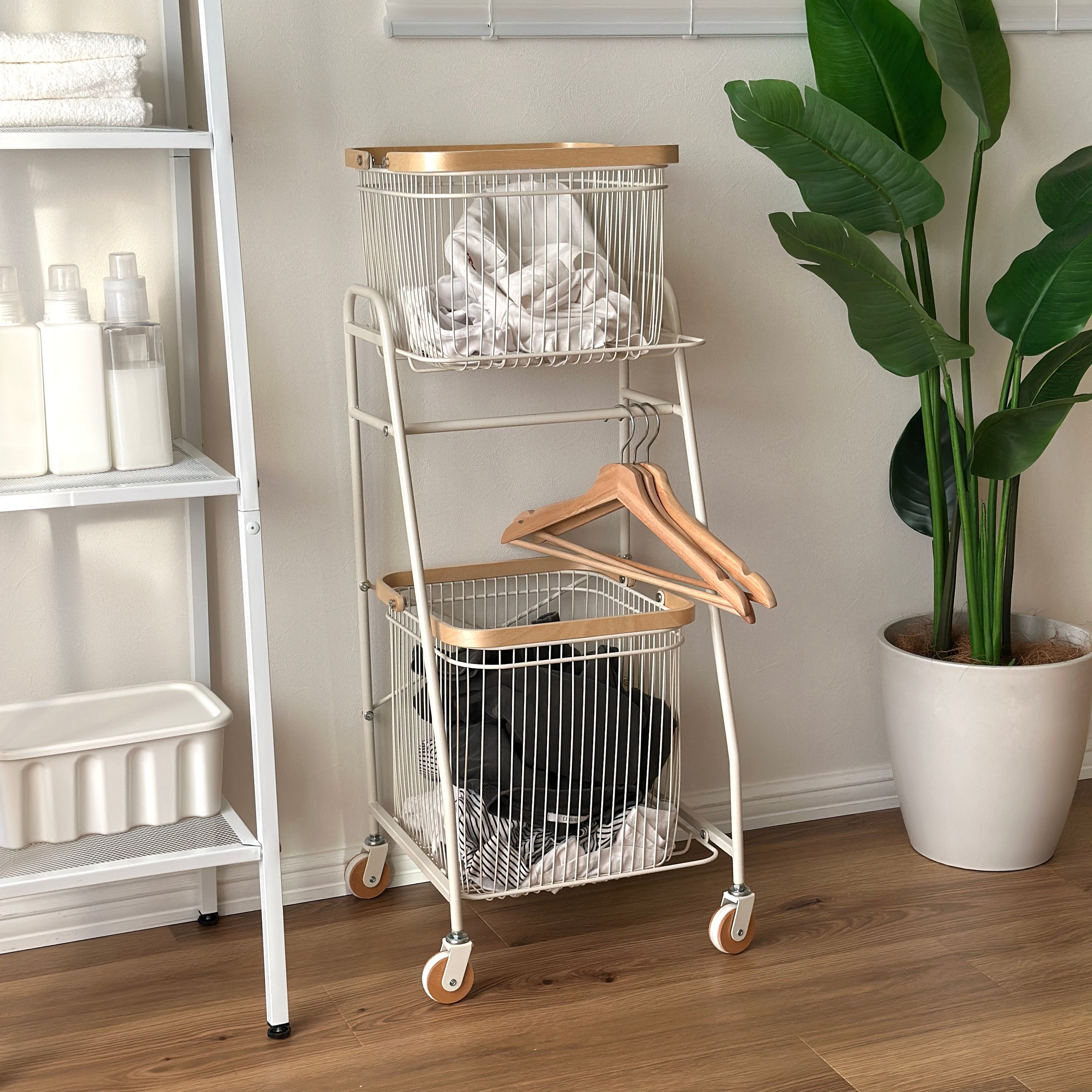 洗濯物をまとめて収納でき、移動もスムーズなキャスター付きワゴン。 ランドリー周りの動線を整えてくれます。