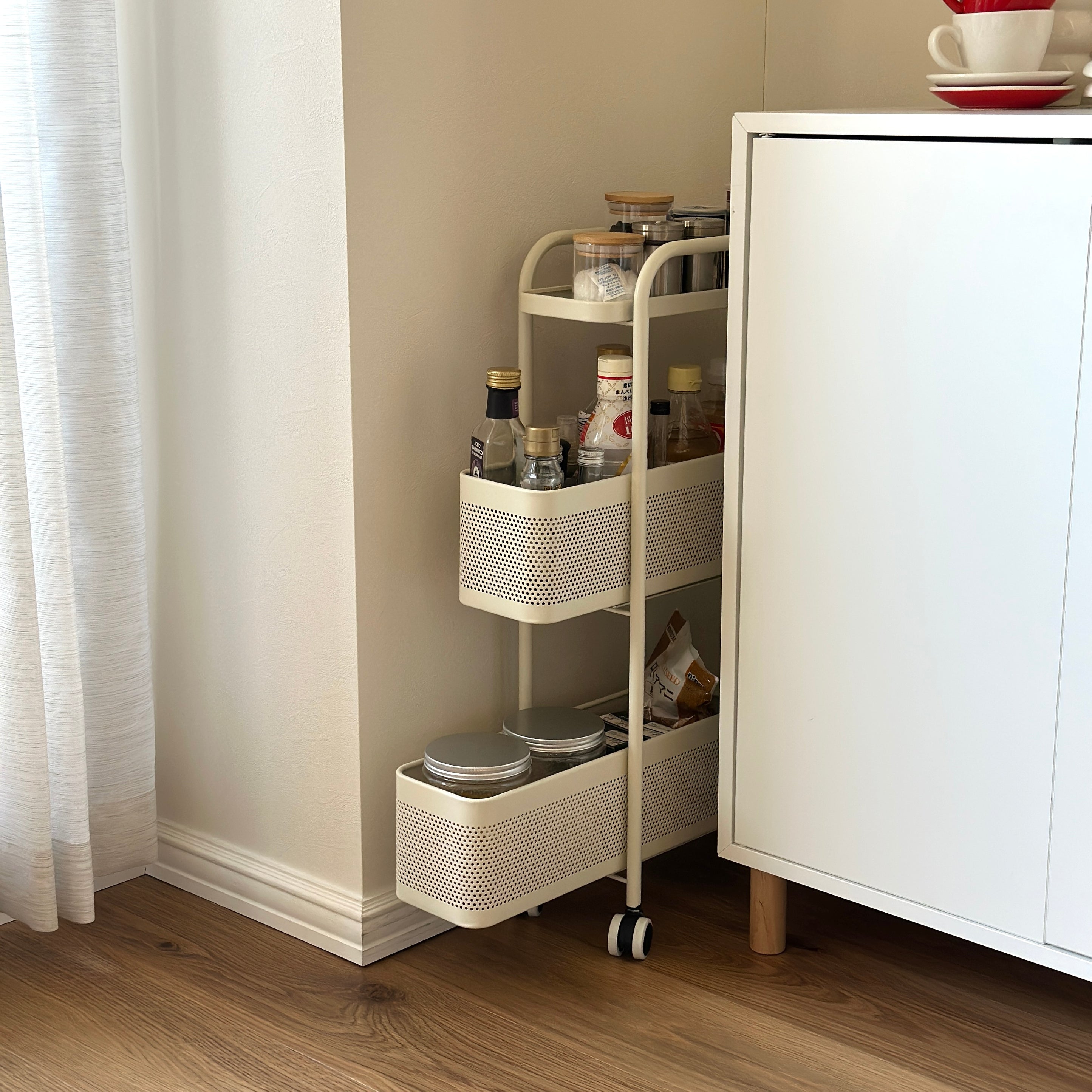 隙間スペースを有効活用できる、スリムなスライド式ワゴン。 キッチン収納をすっきり整えたい方におすすめです。