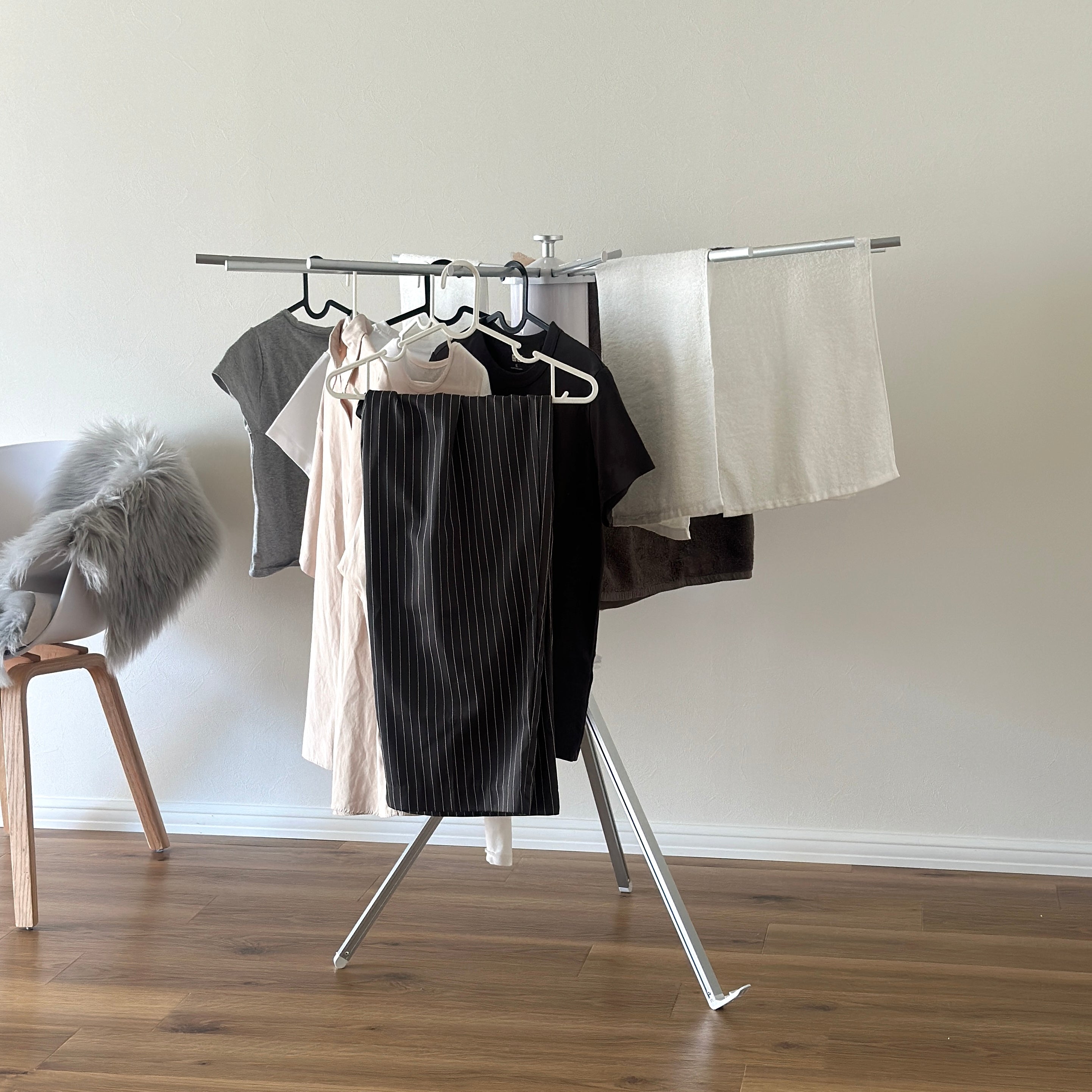 シンプルで無駄のないデザインの物干しスタンド。 部屋干し派の暮らしに取り入れやすい一台です。