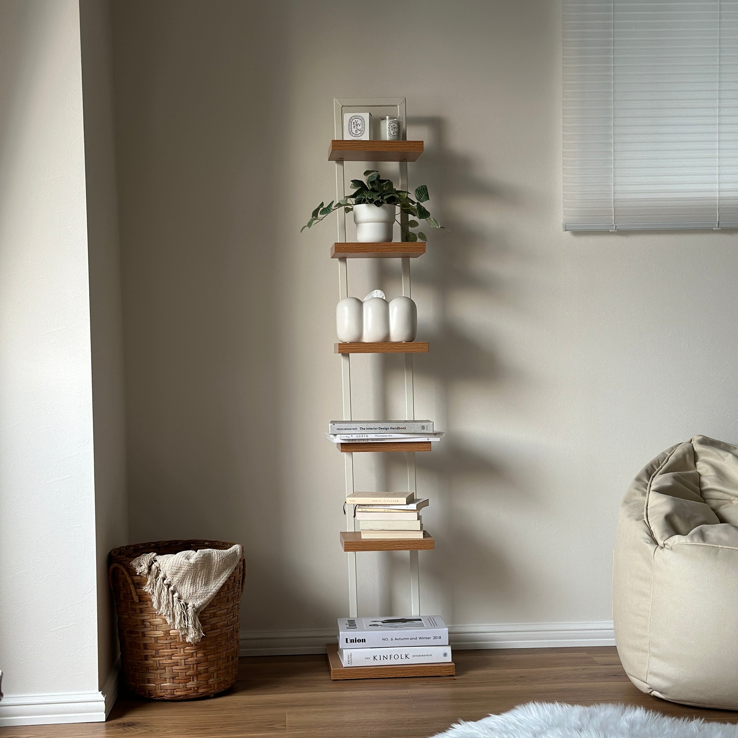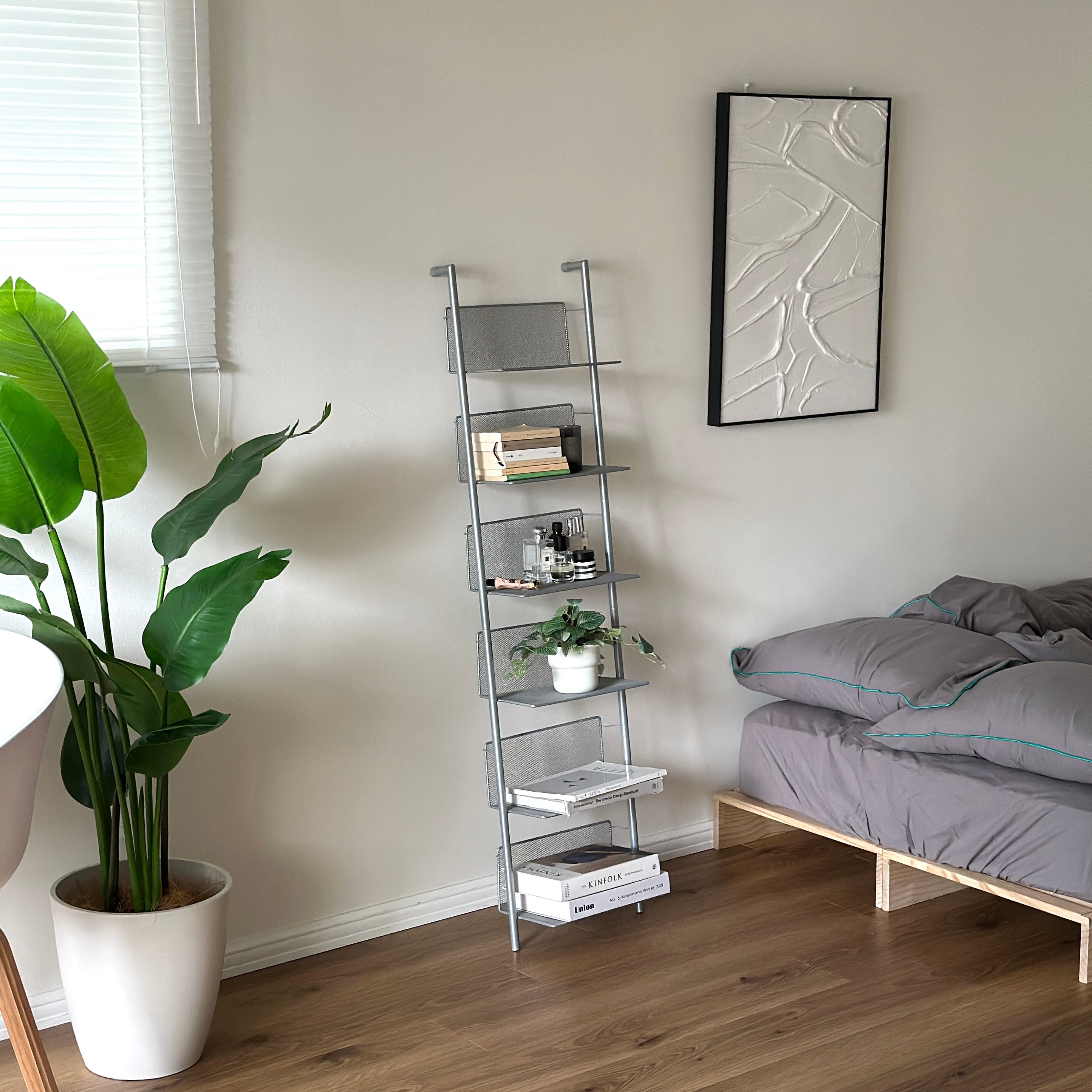 壁面を活かして収納できる、メッシュ素材のウォールシェルフ。 圧迫感を抑えつつ、見せる収納を楽しめるアイテムです。