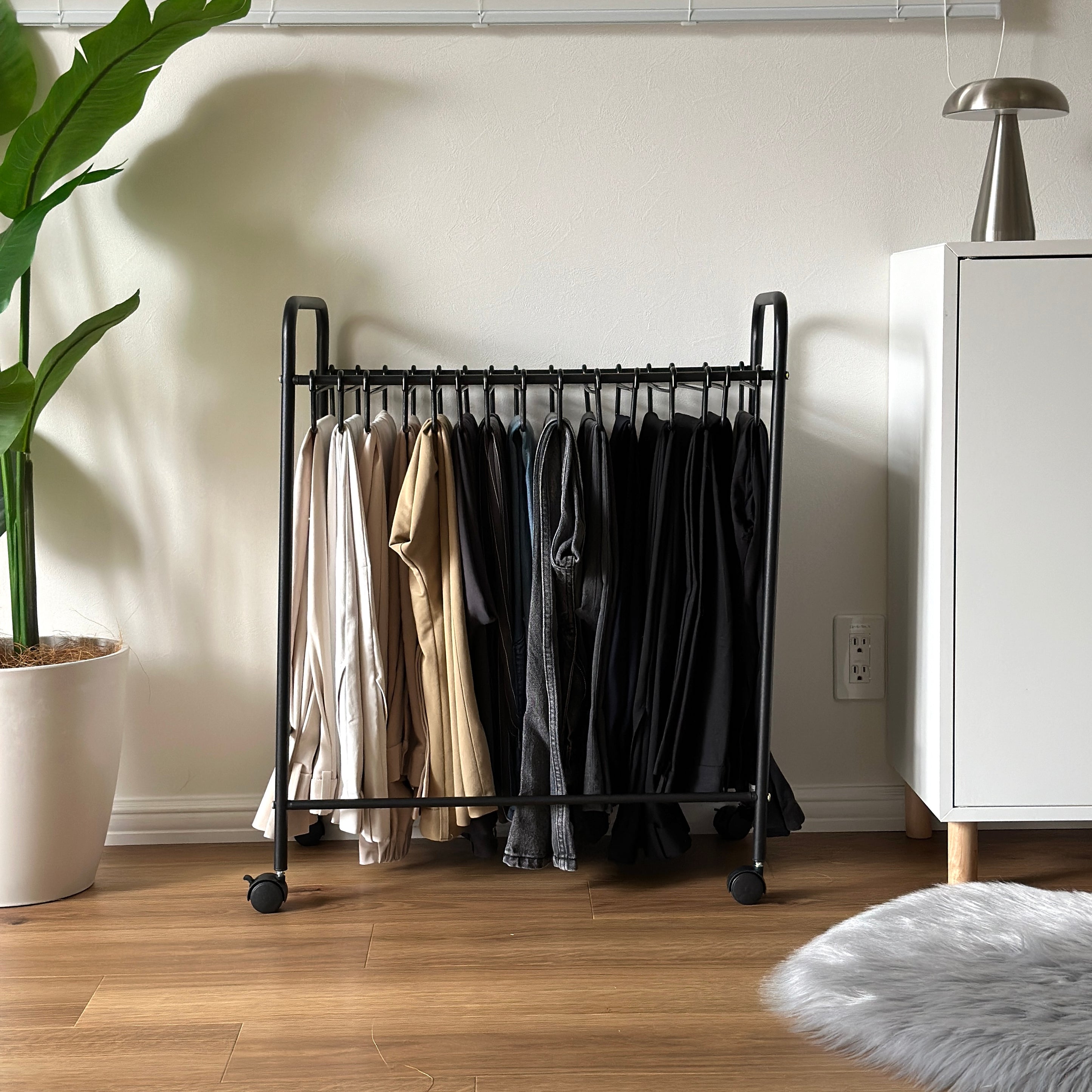 スラックスを掛けたまま収納でき、シワを防ぎながら整えられるハンガーラック。 毎日の身支度がスムーズになり、クローゼット周りをすっきり見せてくれます。