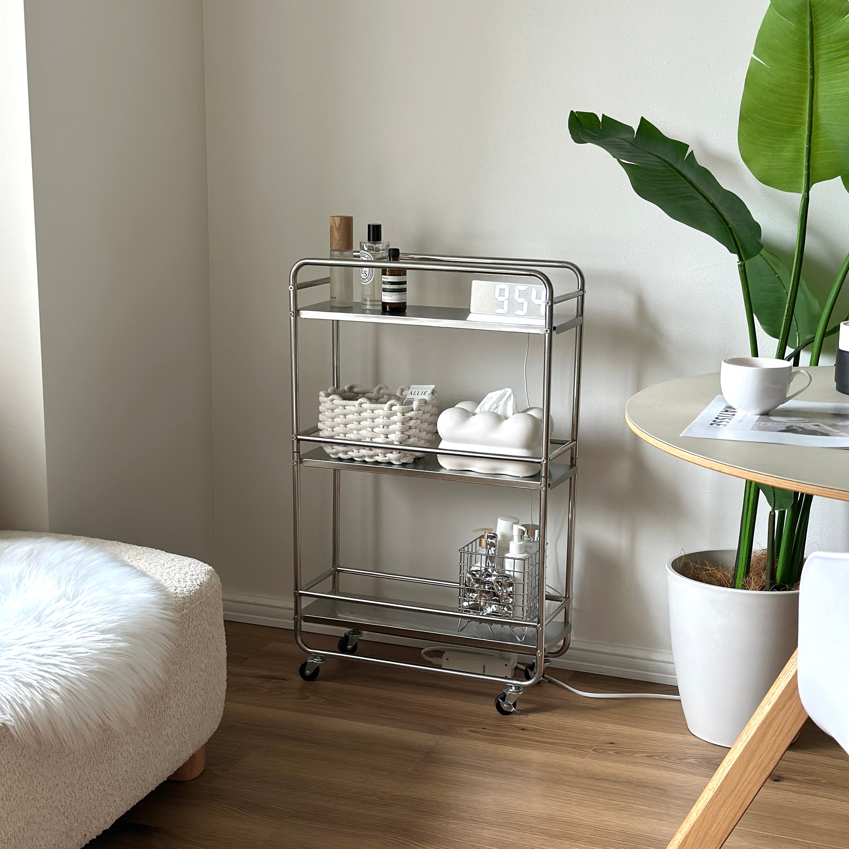 シンプルで清潔感のあるステンレス製ワゴン。 キッチンや洗面所など、幅広い場所で使いやすい一台です。