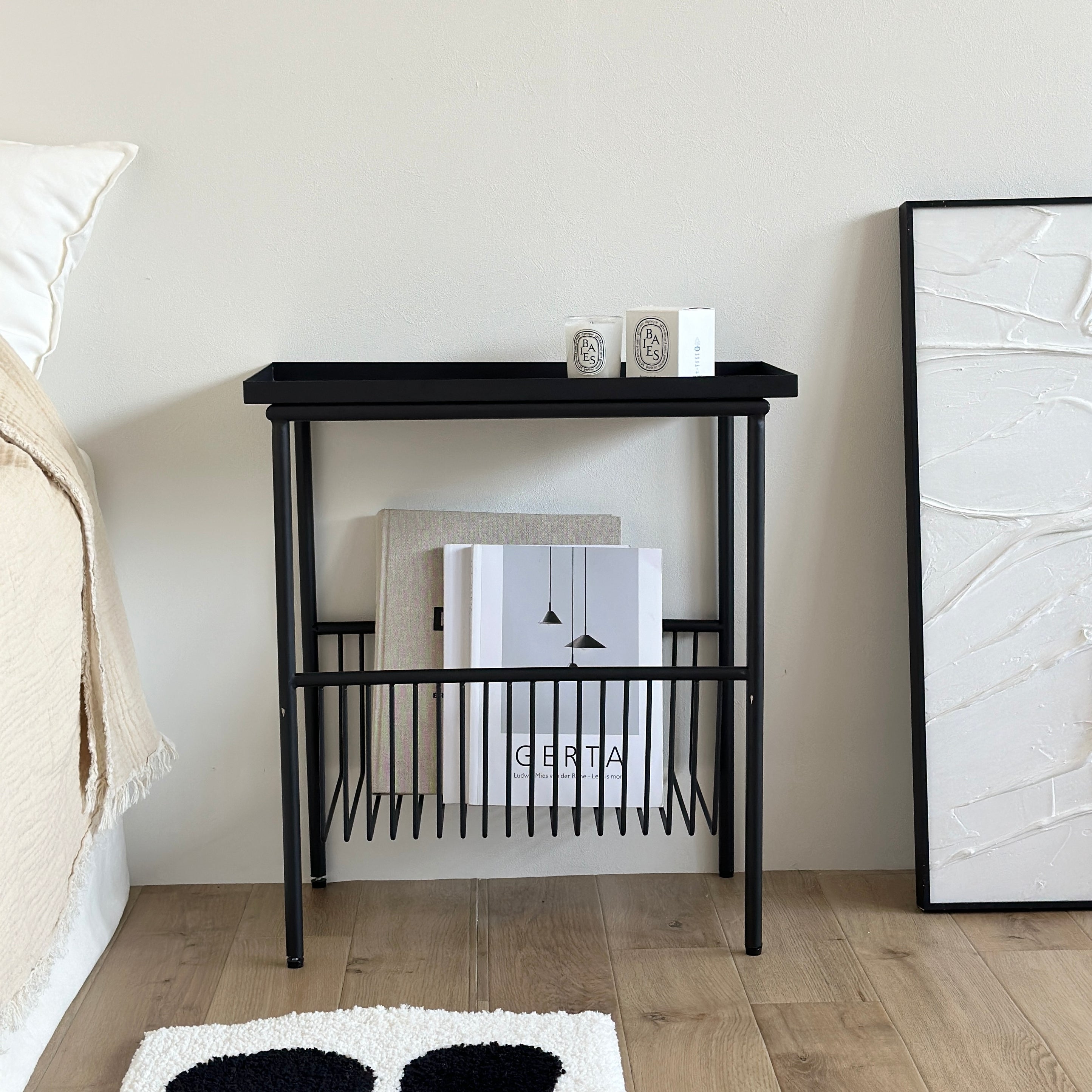 収納とテーブルを兼ね備えた、アイアン素材のサイドテーブル。 ソファ周りのちょい置きに便利です。