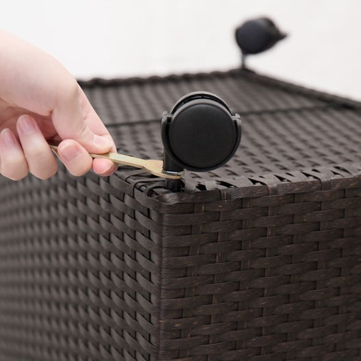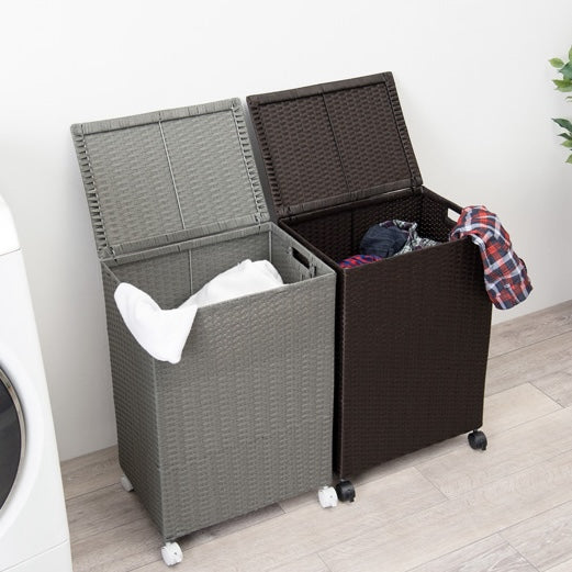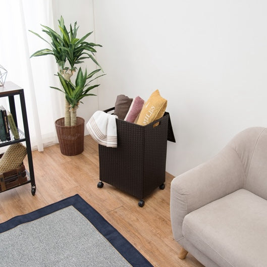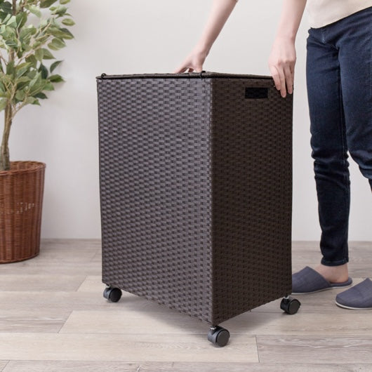 約70リットル大容量の蓋付きの収納ボックスです。ラタン調に編み込まれたデザインにより、通気性を保ちながら中身を適度に隠して収納できます。