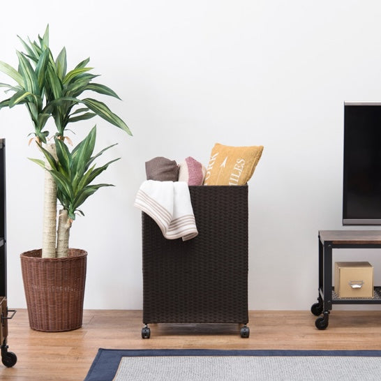 素材には、水に強いポリエチレンを採用しました。本物のラタンと違い水を弾くため、濡れたタオルを入れても傷みにくく、汚れが気になった際も水拭きで簡単にお手入れが可能です。編み目から空気が通る構造は、ヨガマットやダンベルなどのトレーニングアイテムを収める際にも役立ちます。