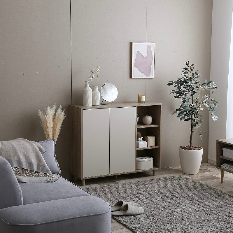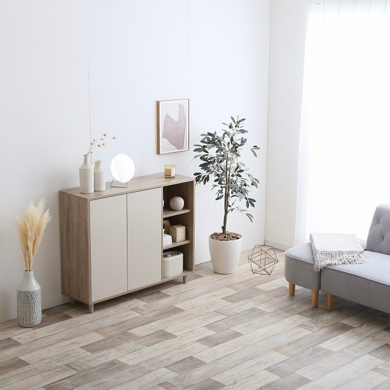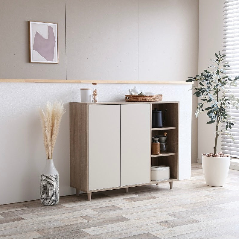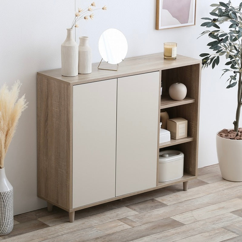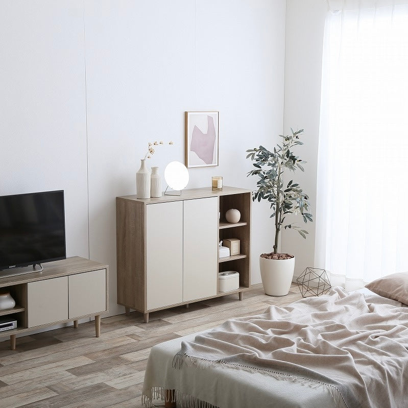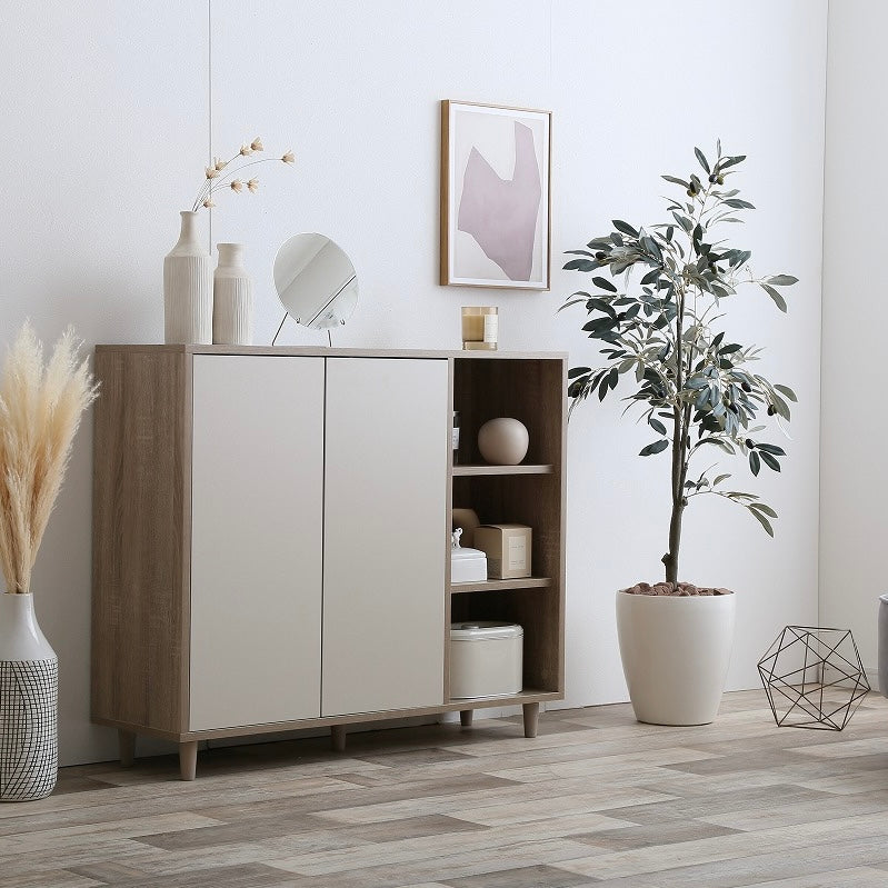 ナチュラルバイカラー縦開きキャビネットは、扉付き収納とオープン棚を組み合わせた、使い分けしやすい収納家具です。