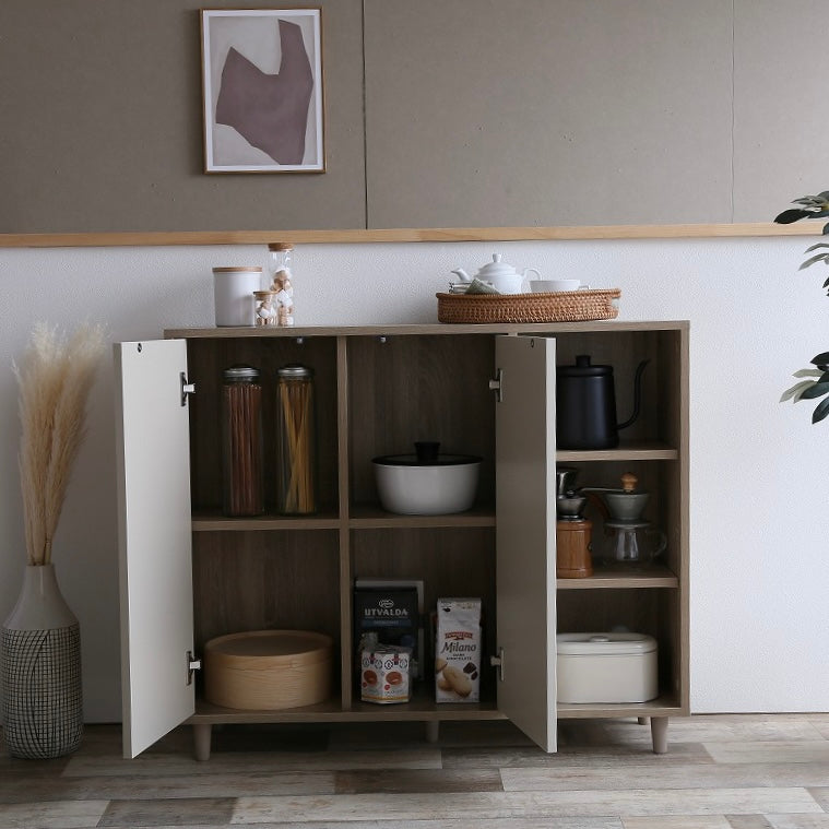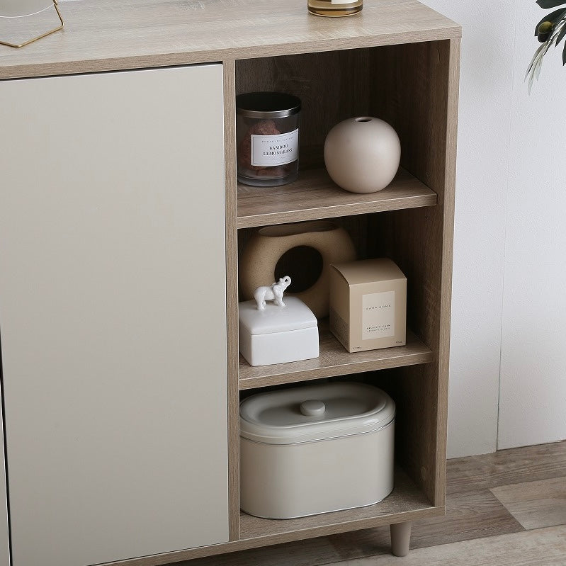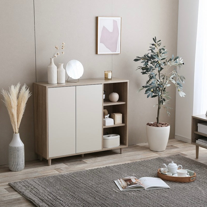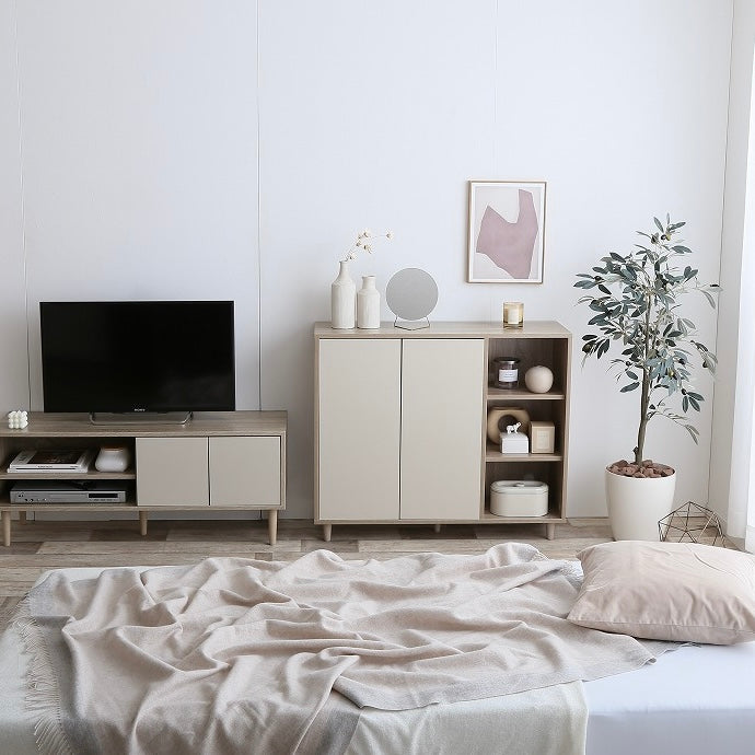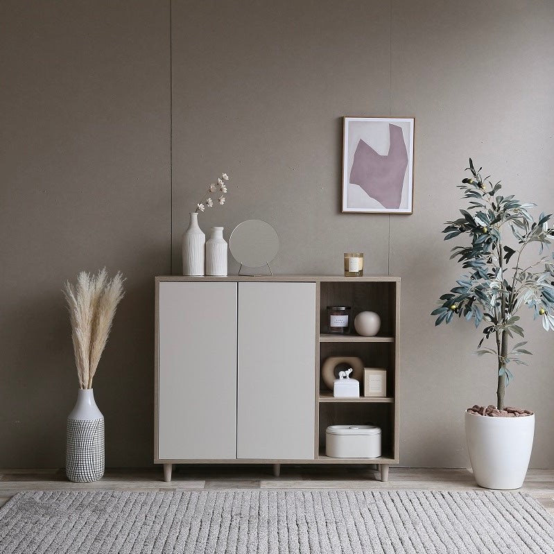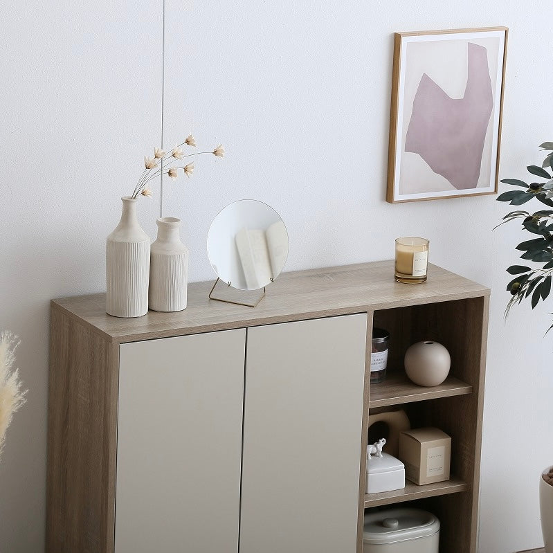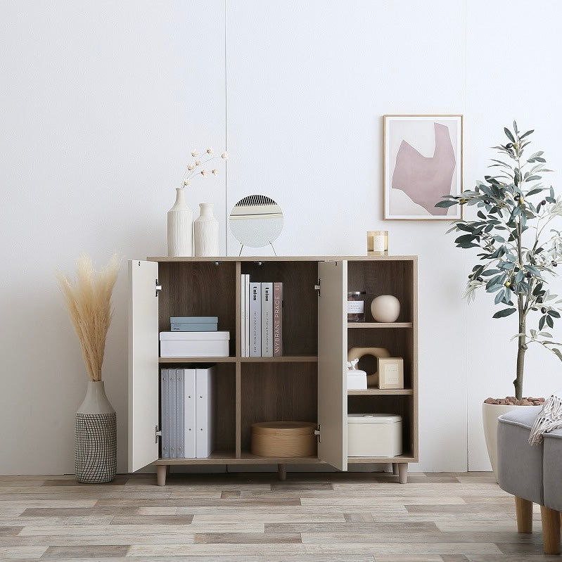 ナチュラルバイカラー縦開きキャビネットは、扉付き収納とオープン棚を組み合わせた、使い分けしやすい収納家具です。