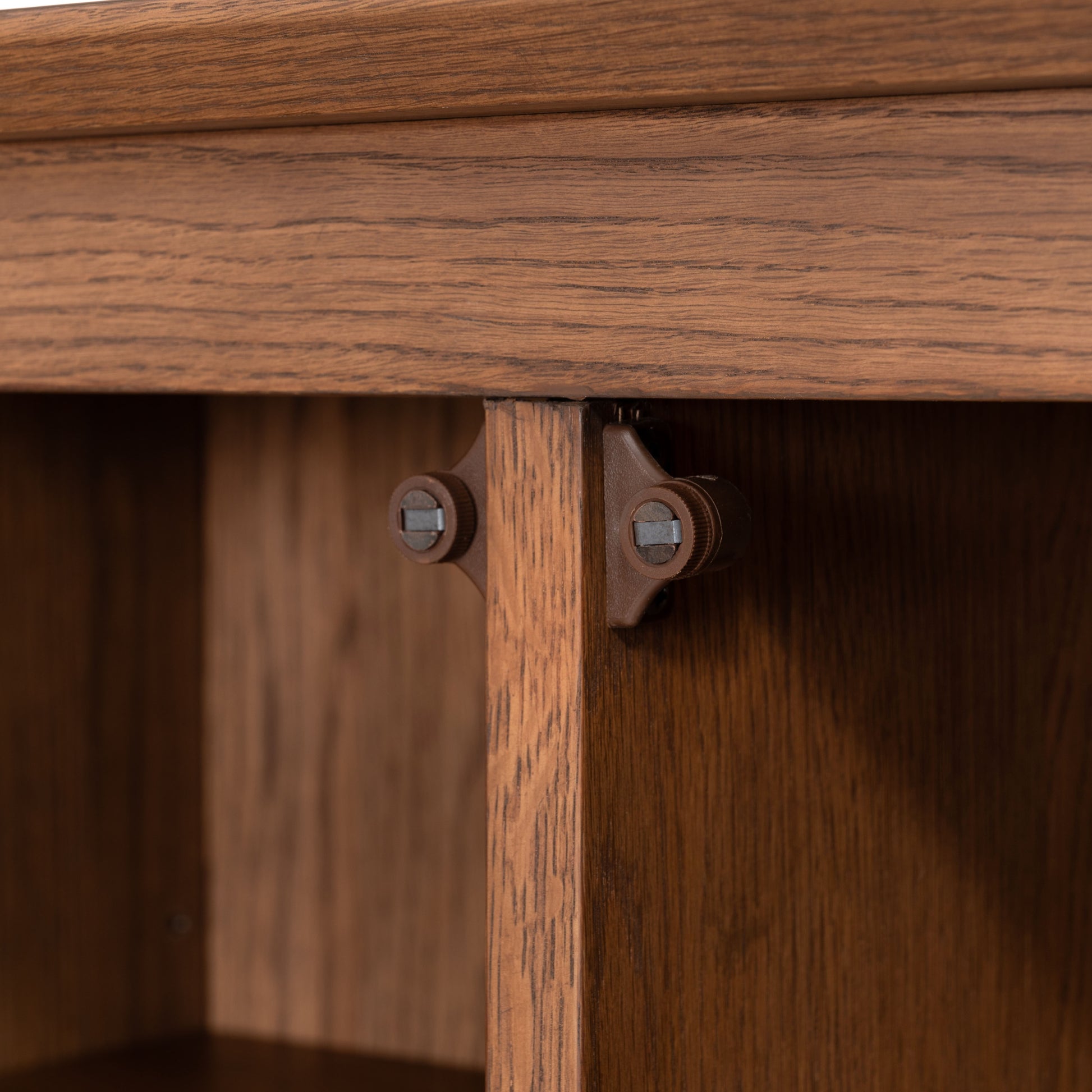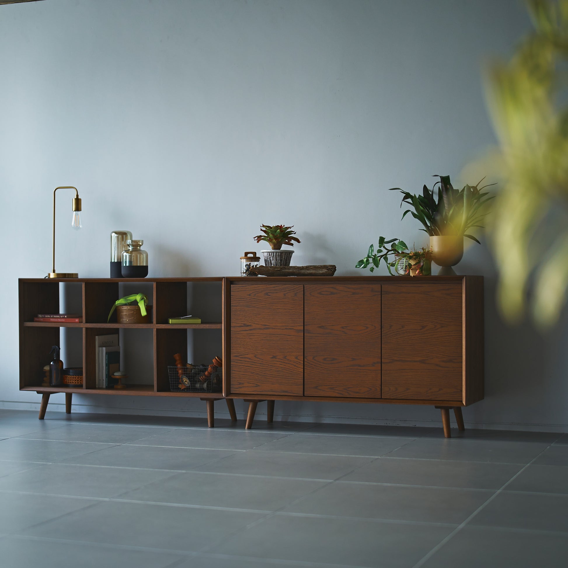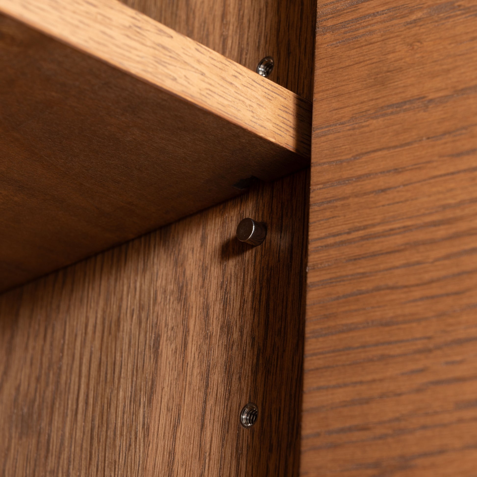 内部の棚板は、収納物の大きさに合わせて3段階で高さを調整できます。背の高い雑誌やボトル類から、細かな文房具まで無駄なく収まる作りです。同シリーズの家具と組み合わせることで、部屋全体の収納量や統一感を調整することもできます。