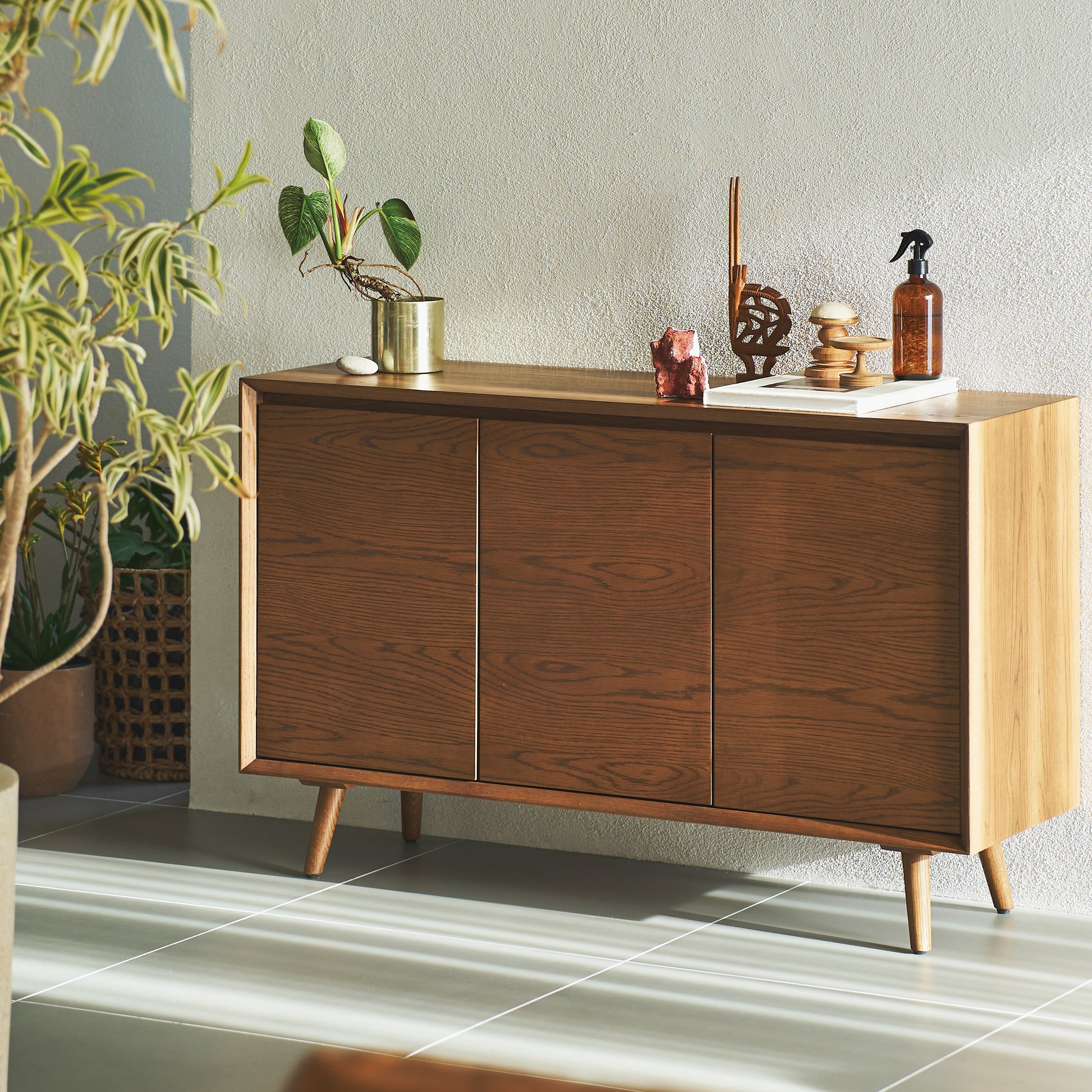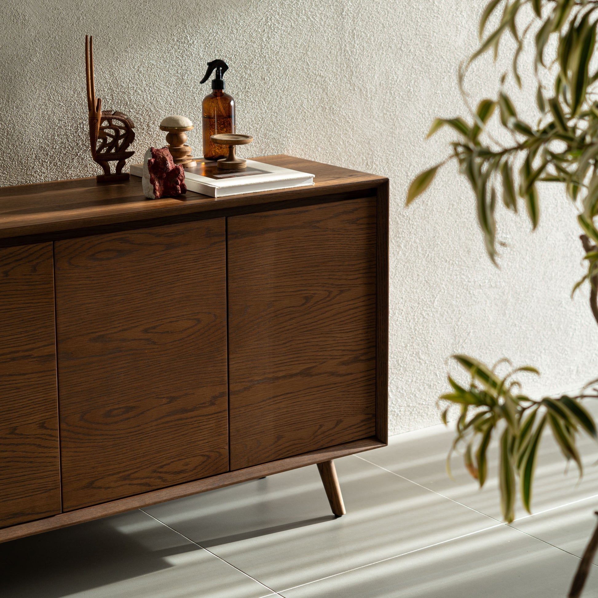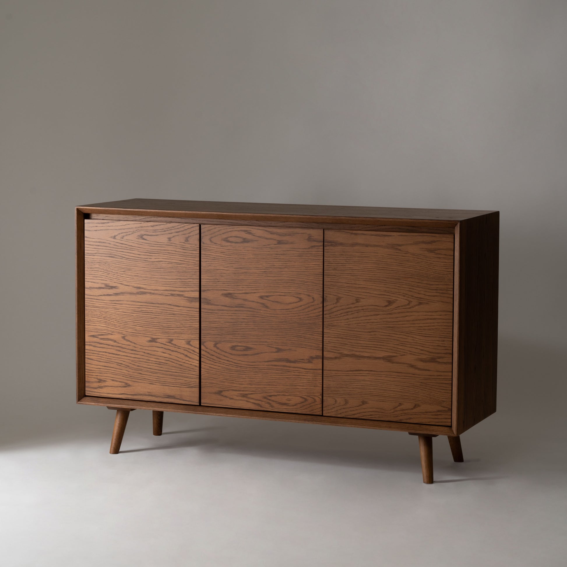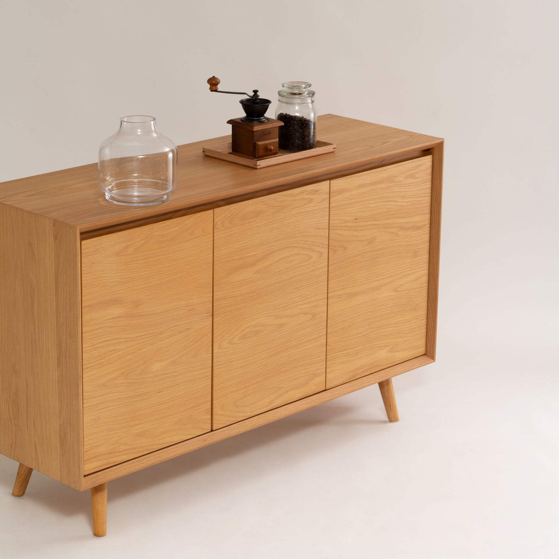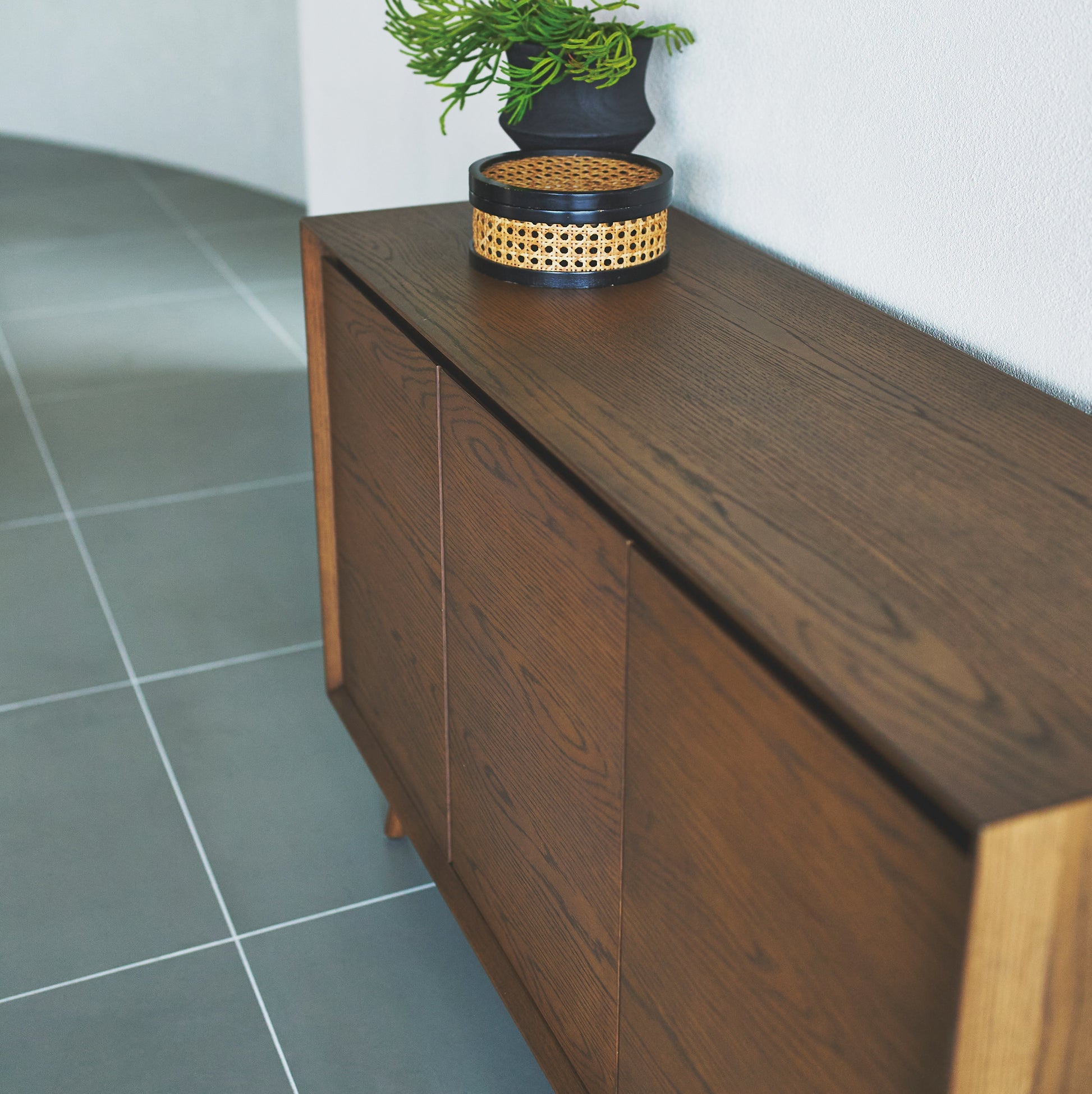 丸みのあるテーパード脚(先端に向けて細くなる脚)が特徴のキャビネットボードです。圧迫感を抑えたコンパクトな設計で、リビングや寝室、ワンルームのわずかな壁面スペースにも無理なく収まります。足元に空間があるため、設置した状態でも床の掃除がしやすく、すっきりとした印象を与えます。