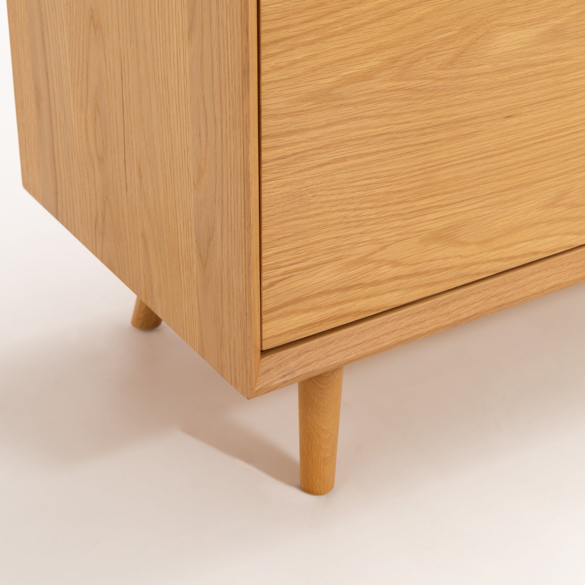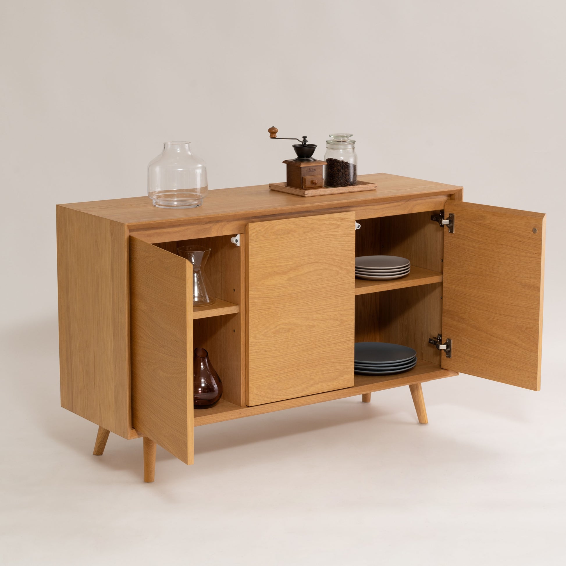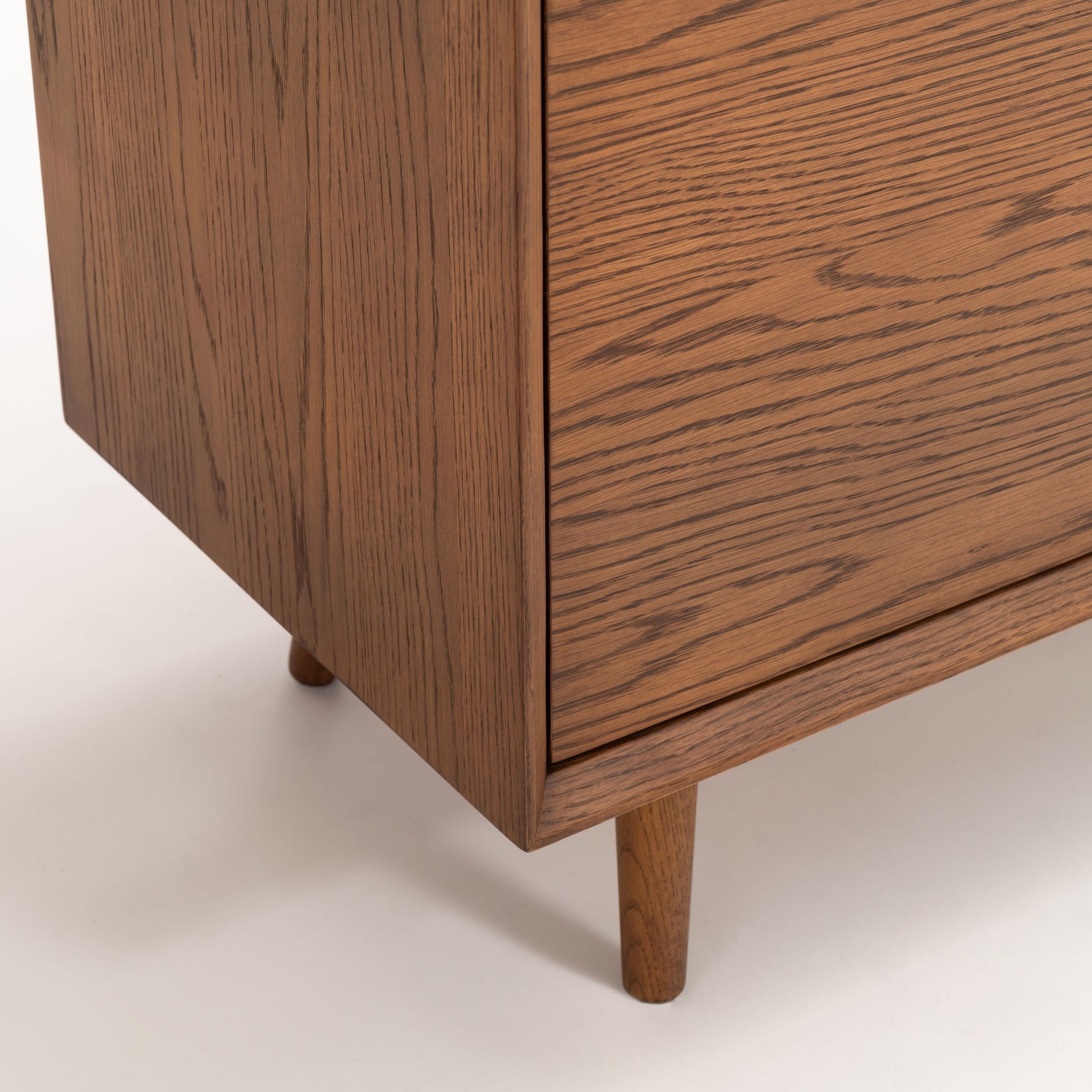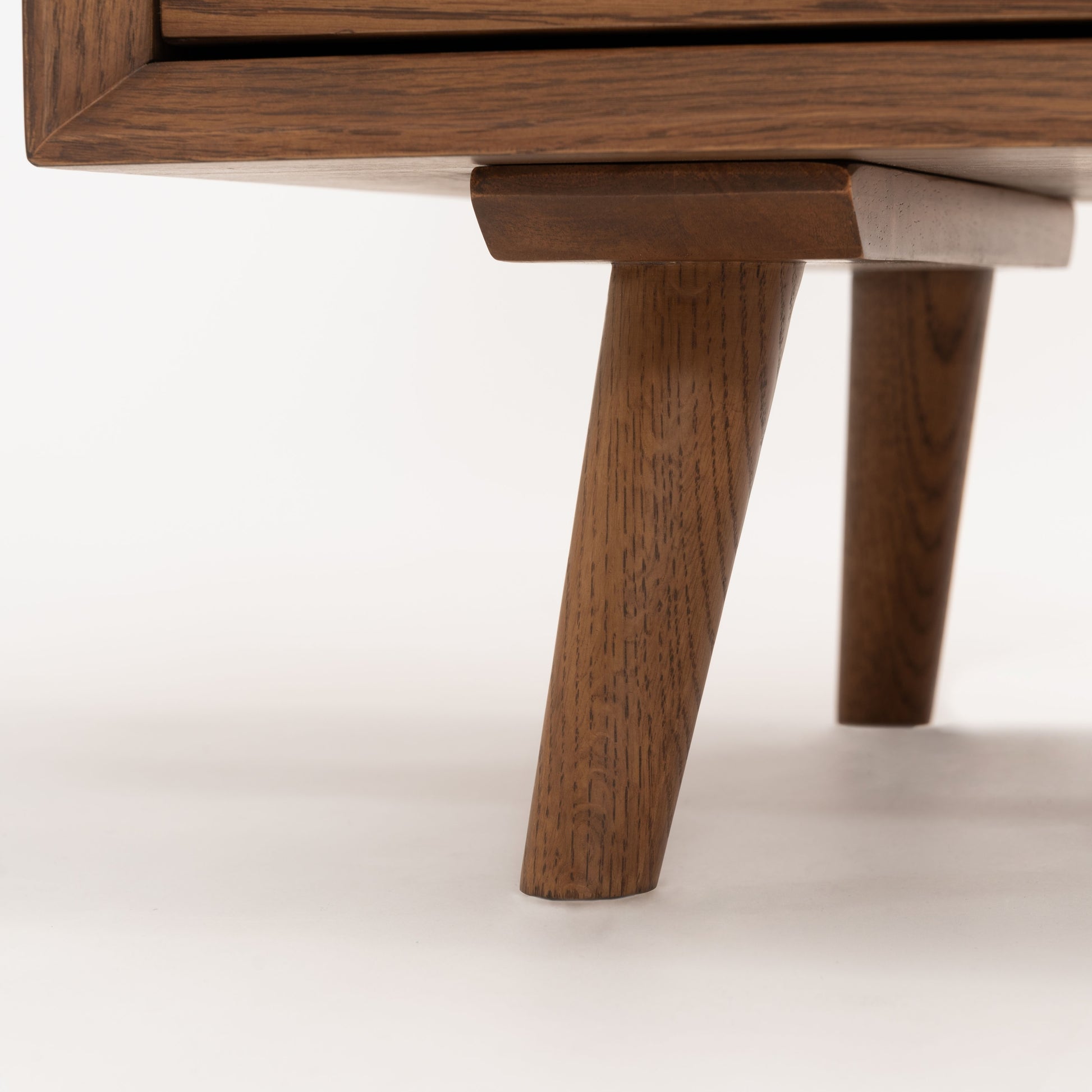 丸みのあるテーパード脚(先端に向けて細くなる脚)が特徴のキャビネットボードです。圧迫感を抑えたコンパクトな設計で、リビングや寝室、ワンルームのわずかな壁面スペースにも無理なく収まります。足元に空間があるため、設置した状態でも床の掃除がしやすく、すっきりとした印象を与えます。