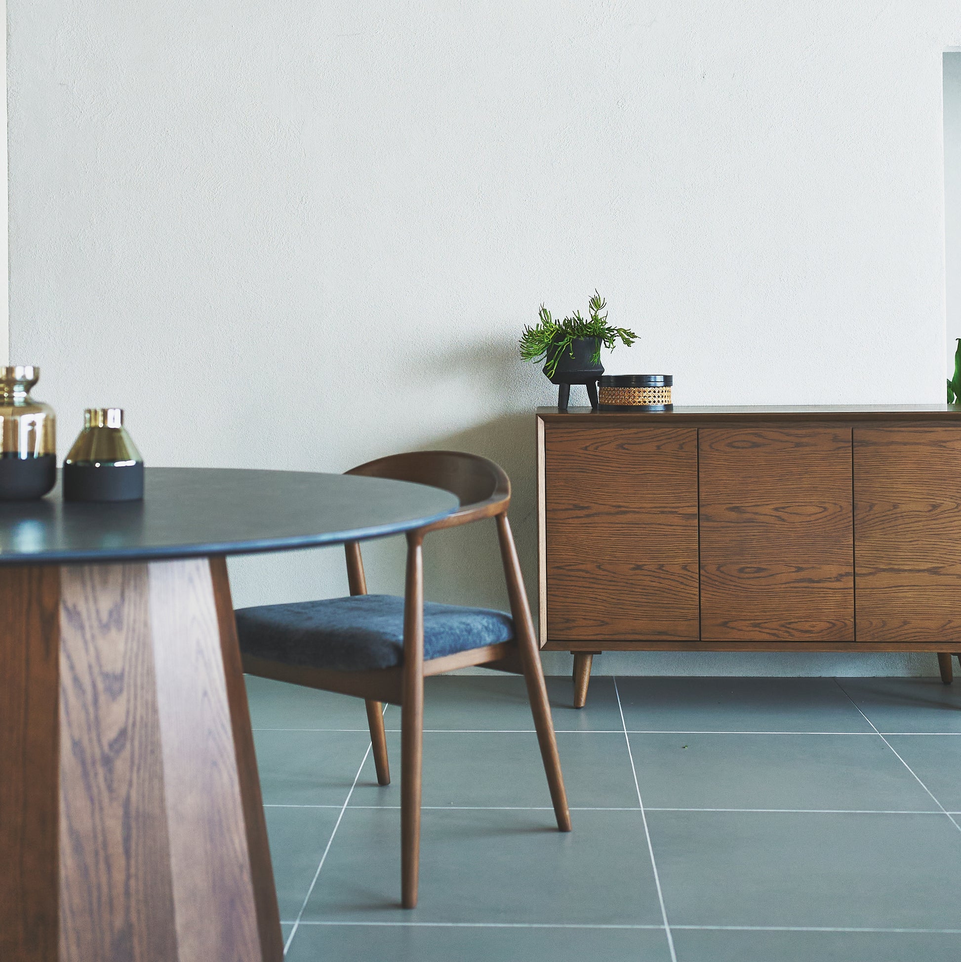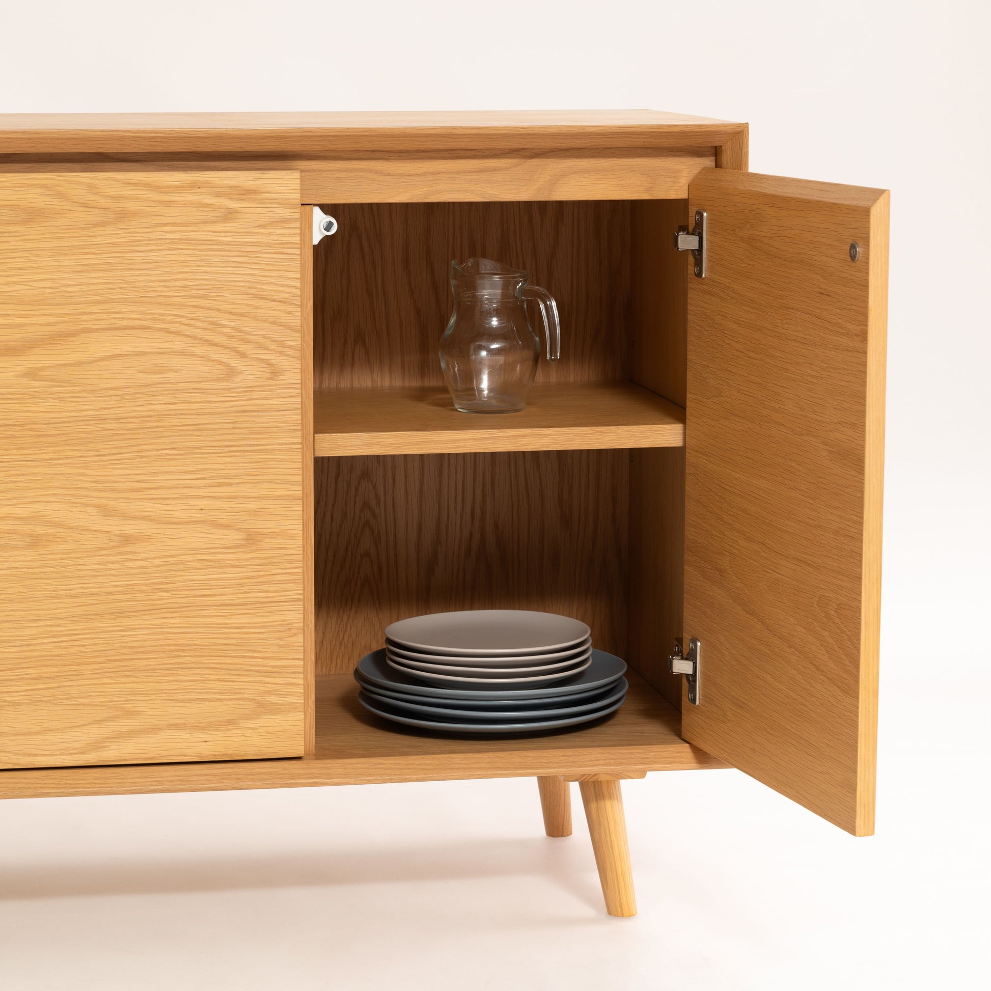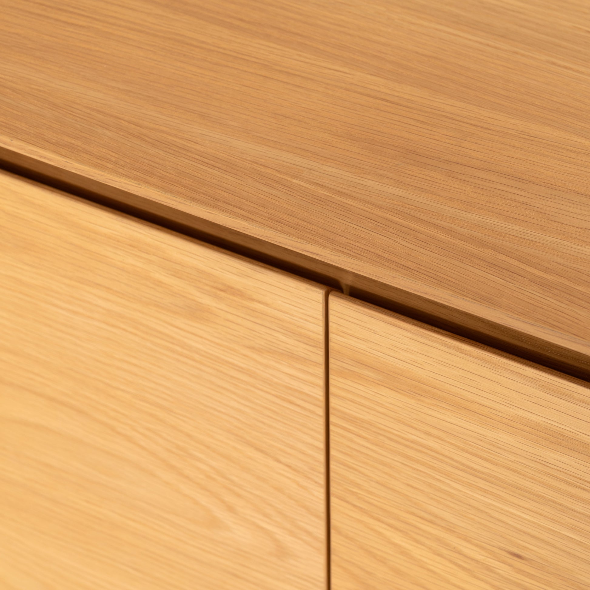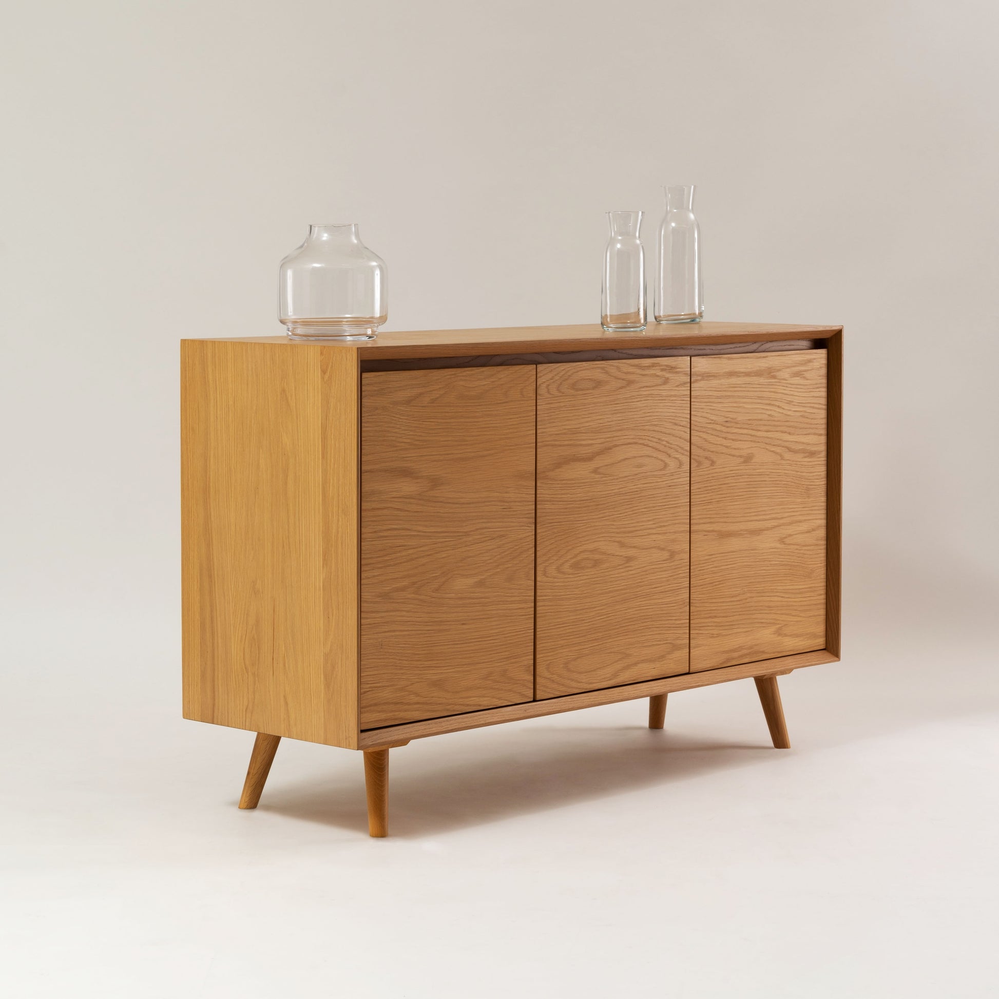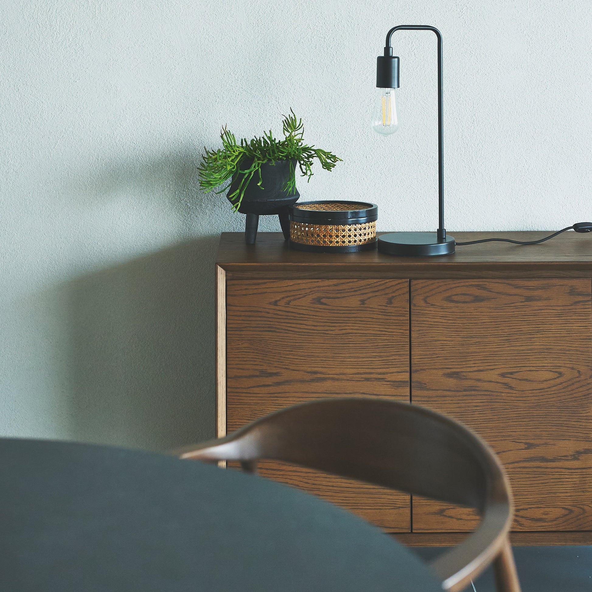 丸みのあるテーパード脚(先端に向けて細くなる脚)が特徴のキャビネットボードです。圧迫感を抑えたコンパクトな設計で、リビングや寝室、ワンルームのわずかな壁面スペースにも無理なく収まります。足元に空間があるため、設置した状態でも床の掃除がしやすく、すっきりとした印象を与えます。