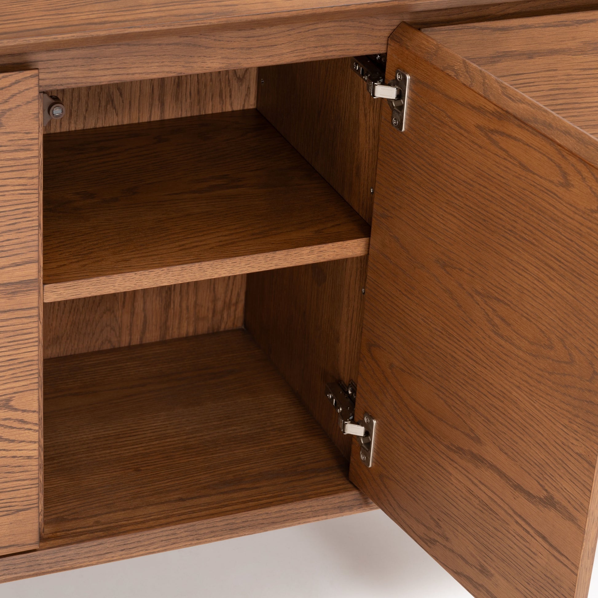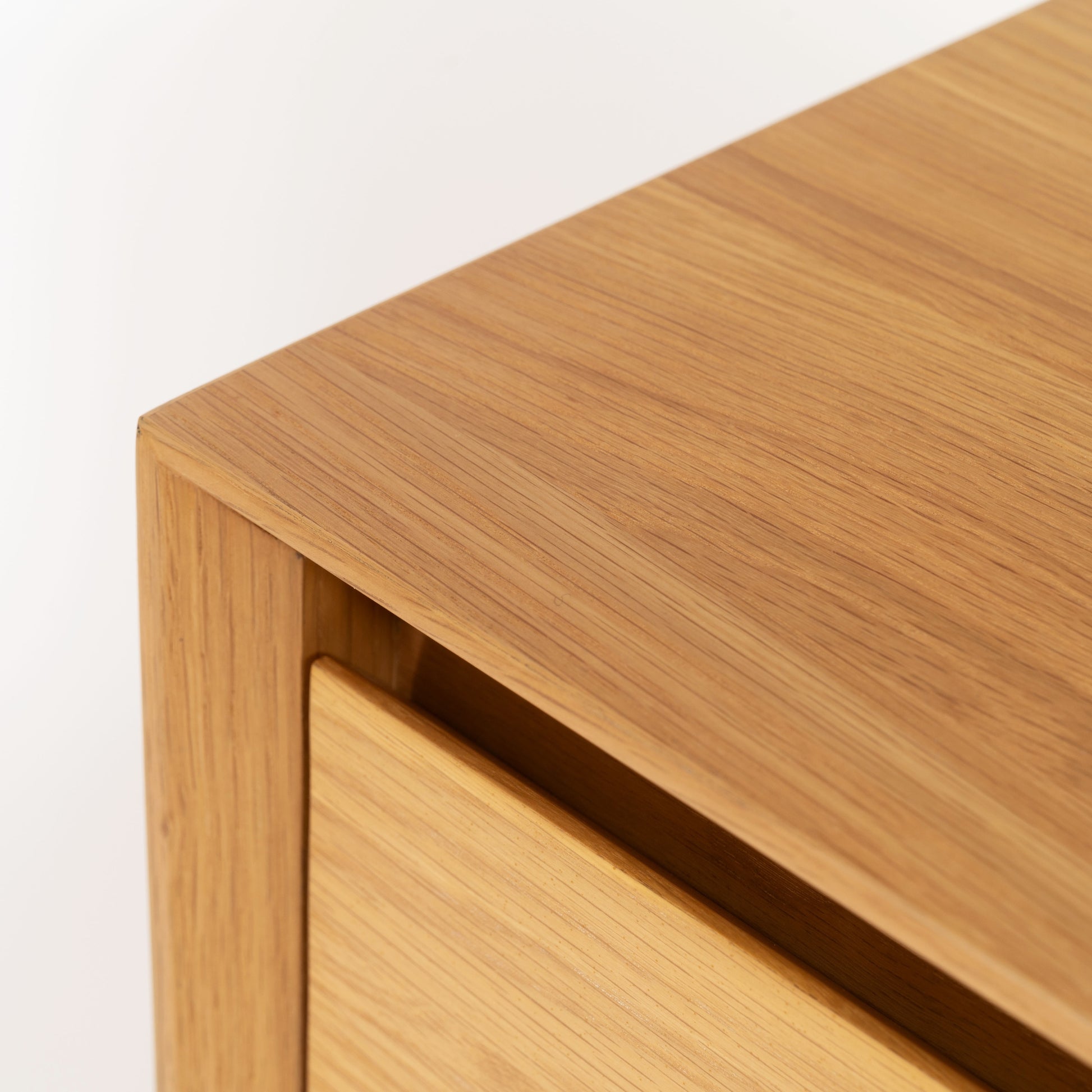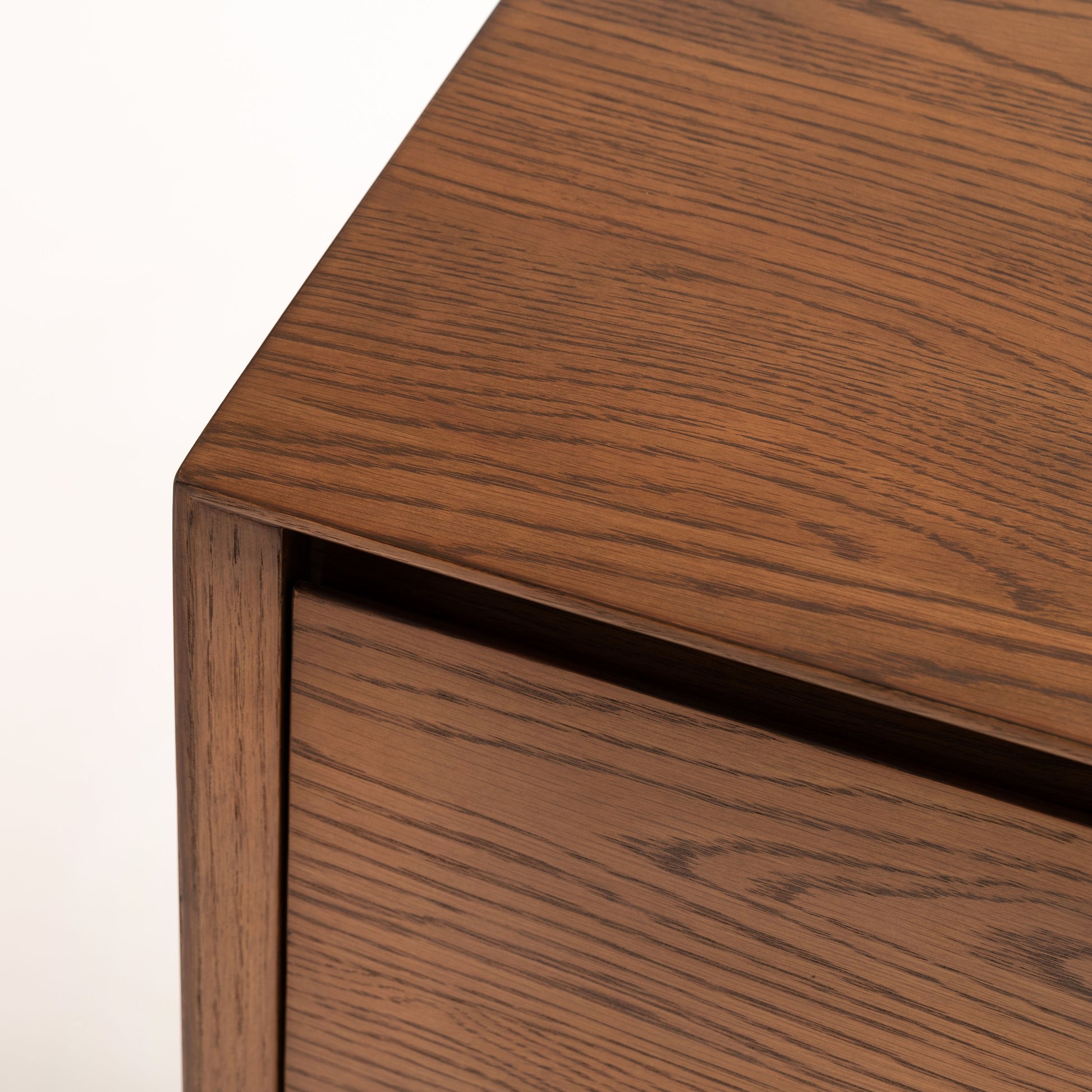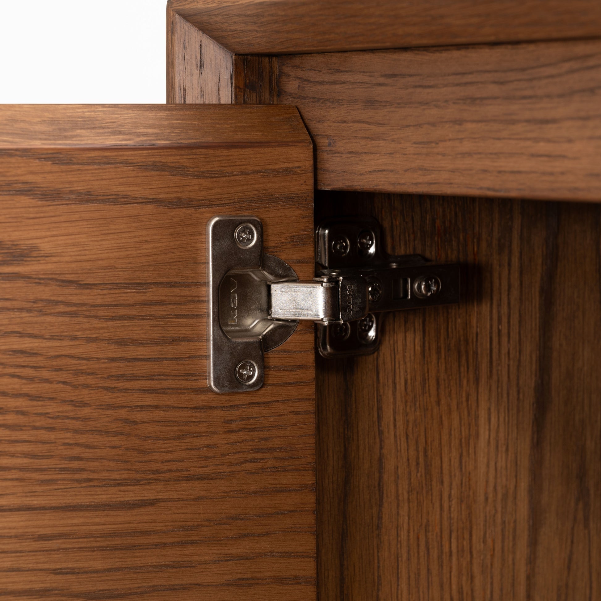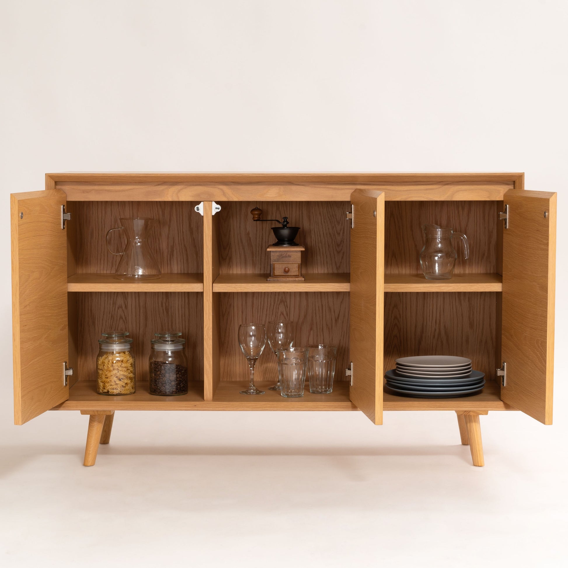 丸みのあるテーパード脚(先端に向けて細くなる脚)が特徴のキャビネットボードです。圧迫感を抑えたコンパクトな設計で、リビングや寝室、ワンルームのわずかな壁面スペースにも無理なく収まります。足元に空間があるため、設置した状態でも床の掃除がしやすく、すっきりとした印象を与えます。