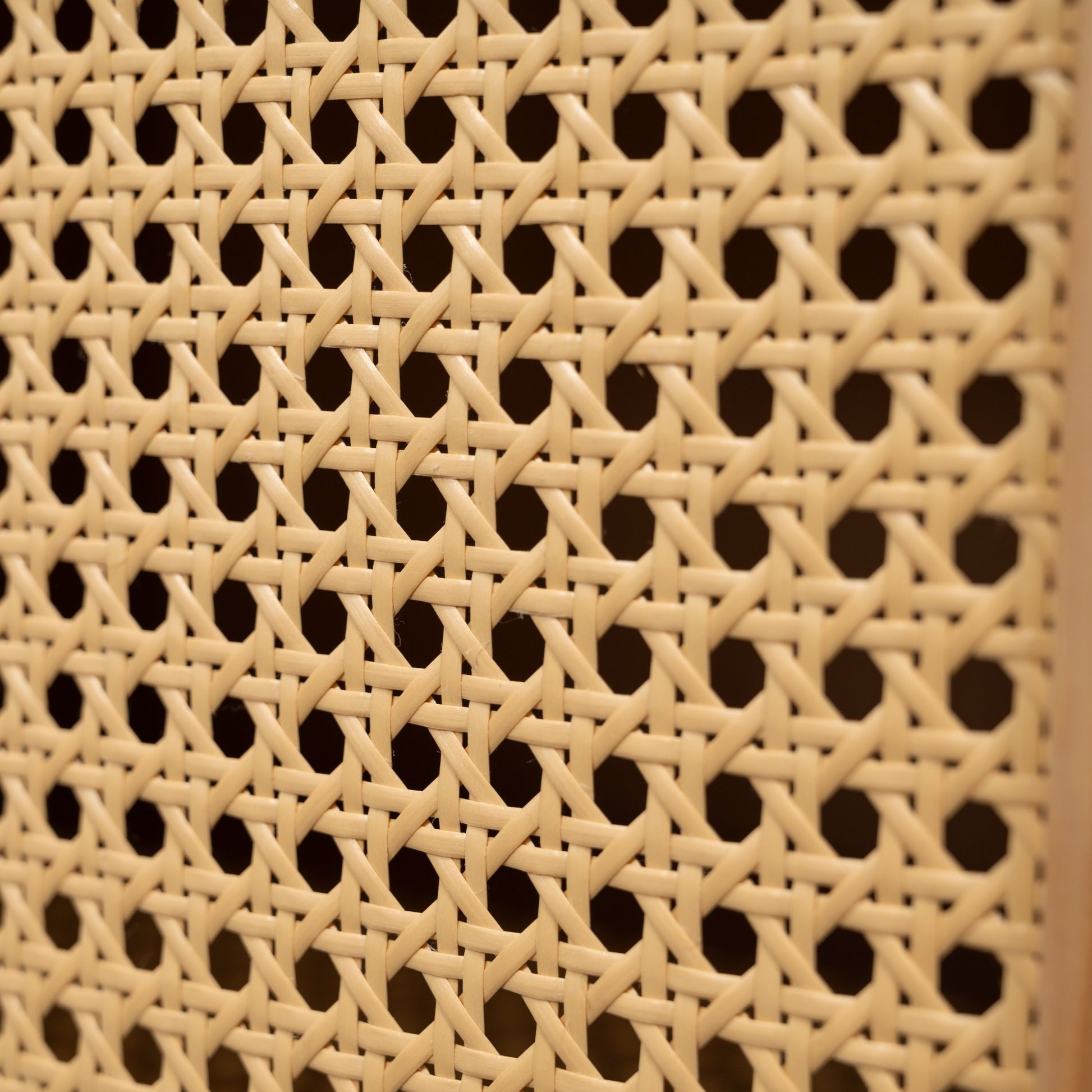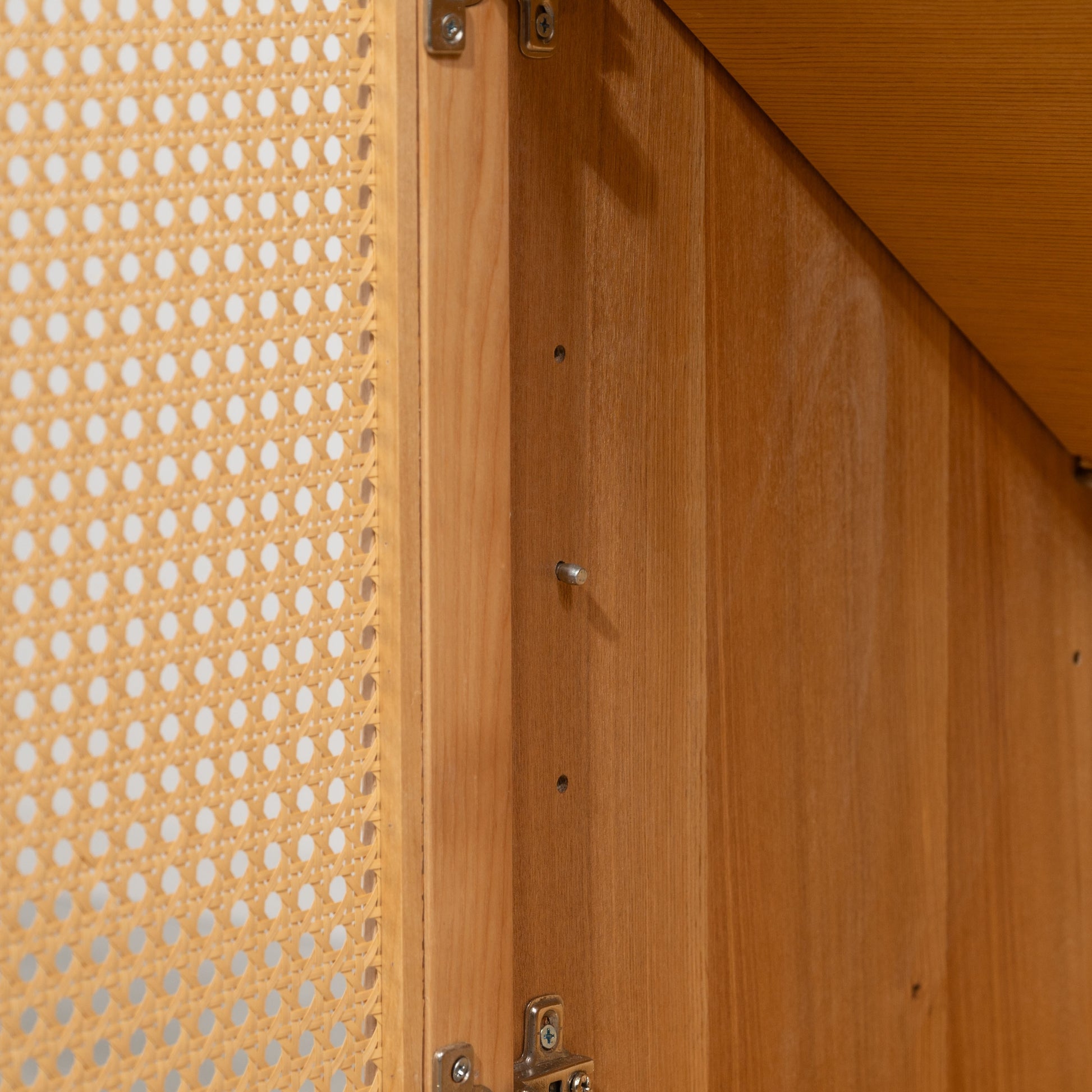 扉内の棚板は、収納する物の高さに合わせて3段階で調整できます。背の高いボトルやA4サイズのファイルも、無駄な隙間を作らずに収めることが可能です。人工ラタンはポリエチレン素材のため、天然素材に比べてささくれが起きにくく、日々の拭き掃除などのお手入れも簡単に行えます。
