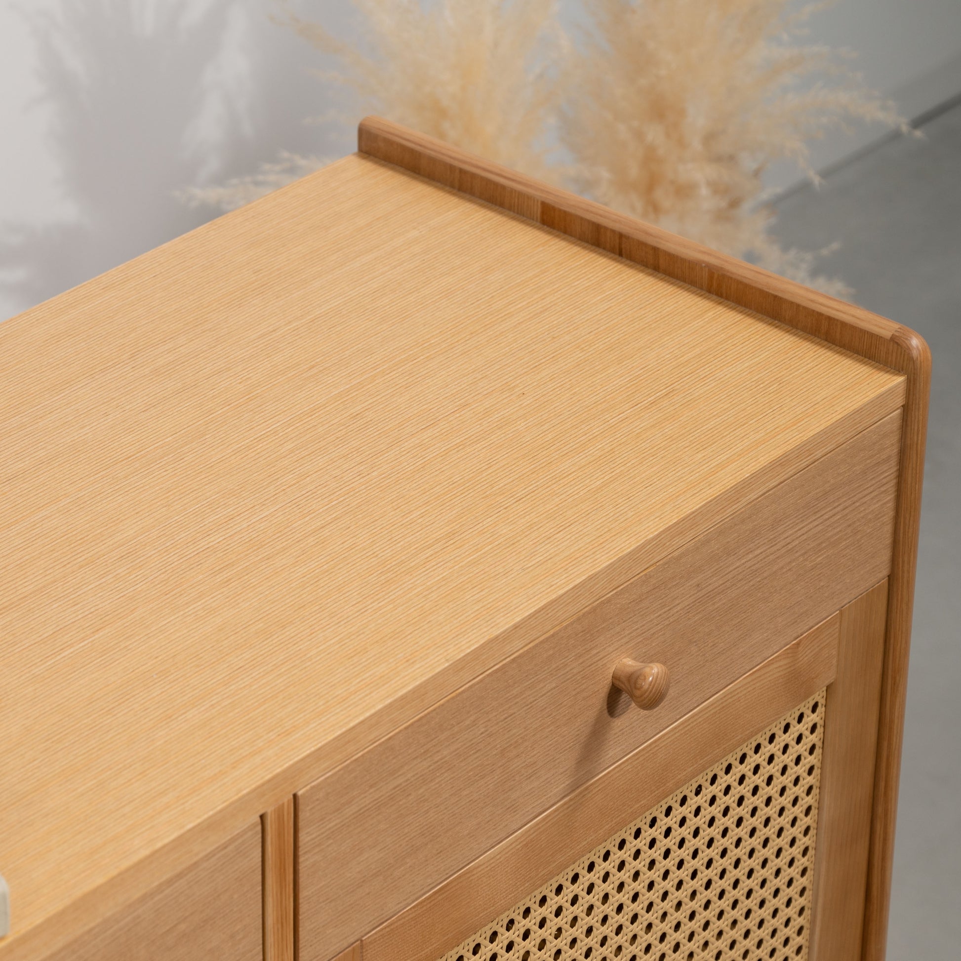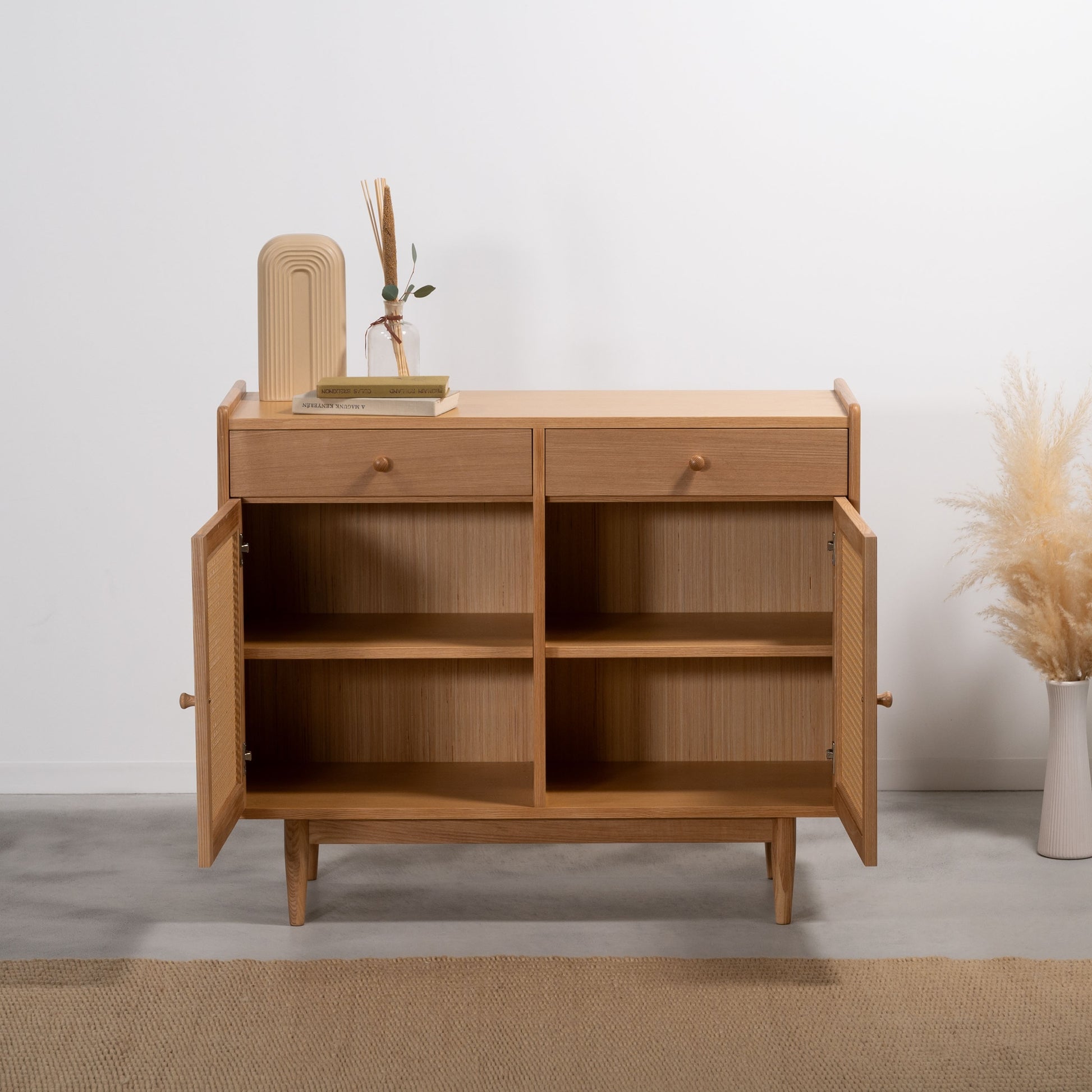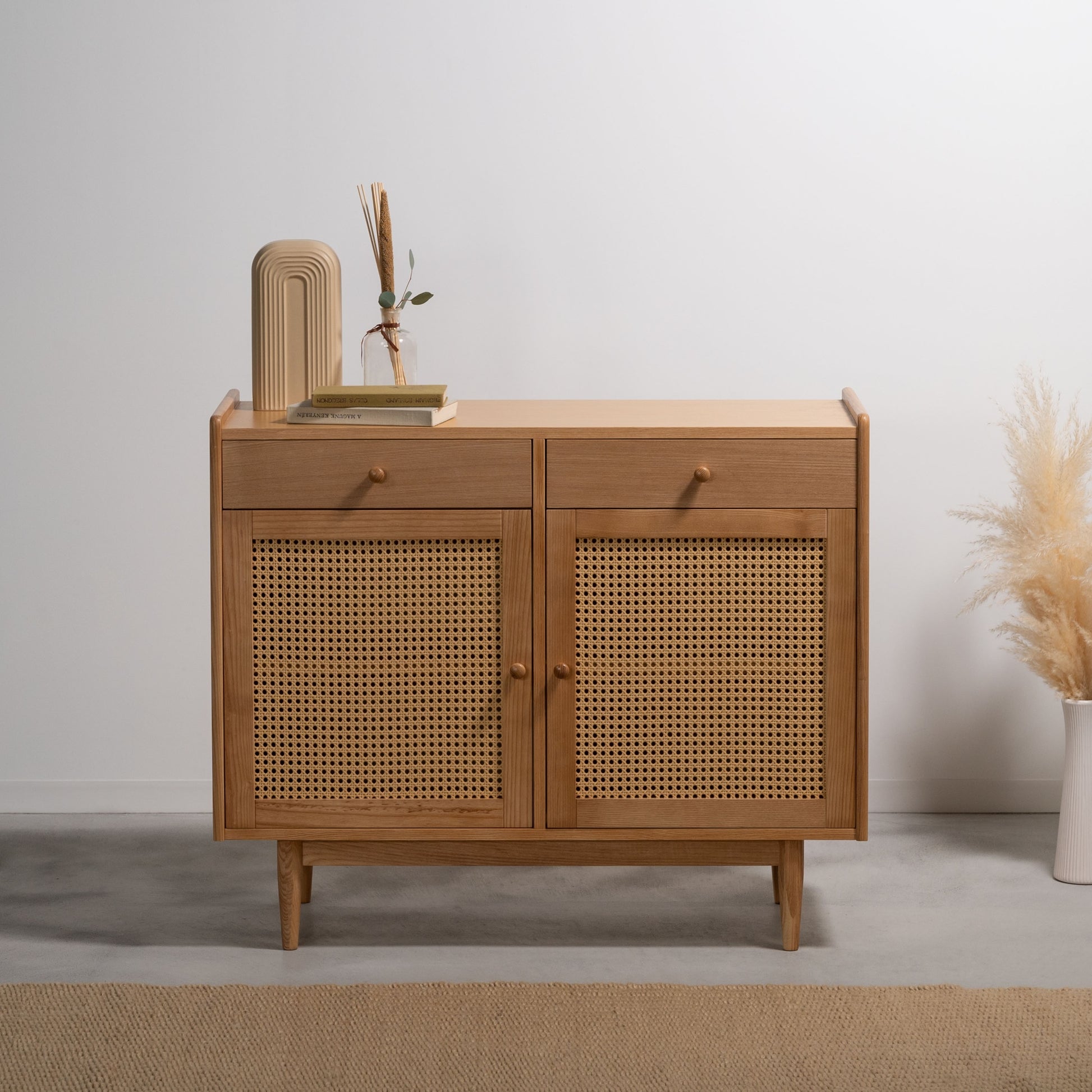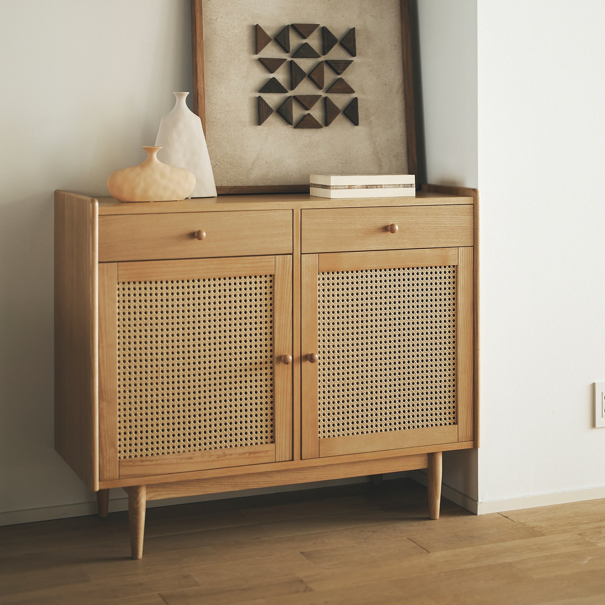 幅100cmのワイドなサイズ設計で、十分な収納力を備えたキャビネットです。扉部分に人工ラタンを編み込んだデザインを採用しており、中身を適度に隠しながらも、圧迫感を抑えた佇まいでリビングやダイニングに馴染みます。天板の上はフラットなため、卓上ライトを置いたり、鍵や時計の定位置にしたりと、ディスプレイスペースとしても活用できます。