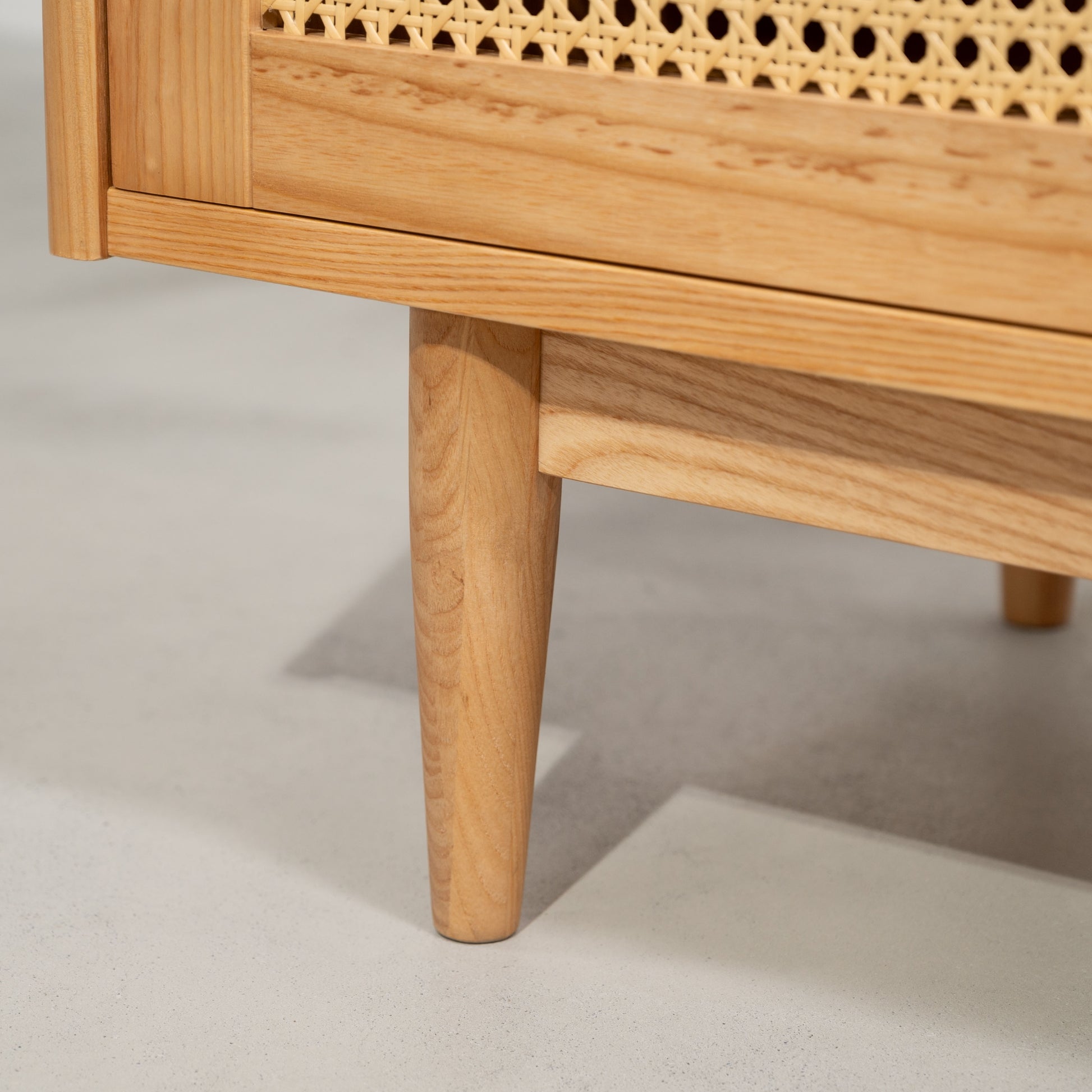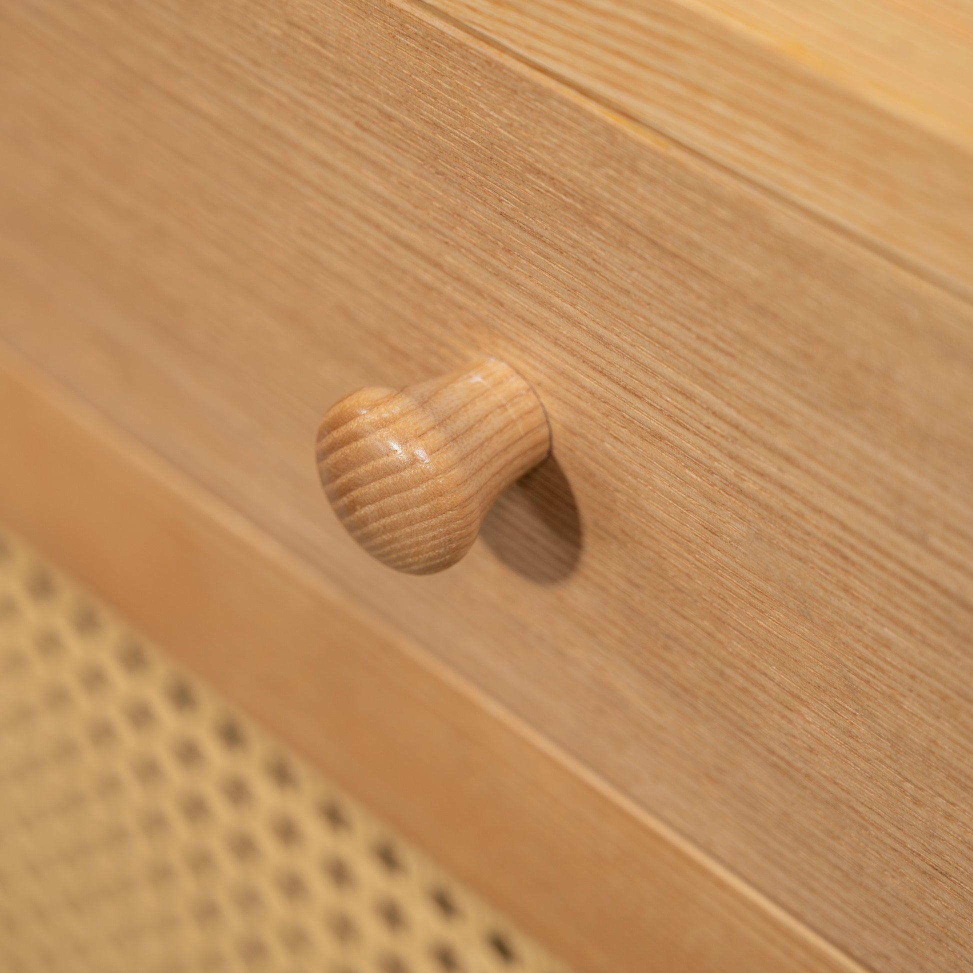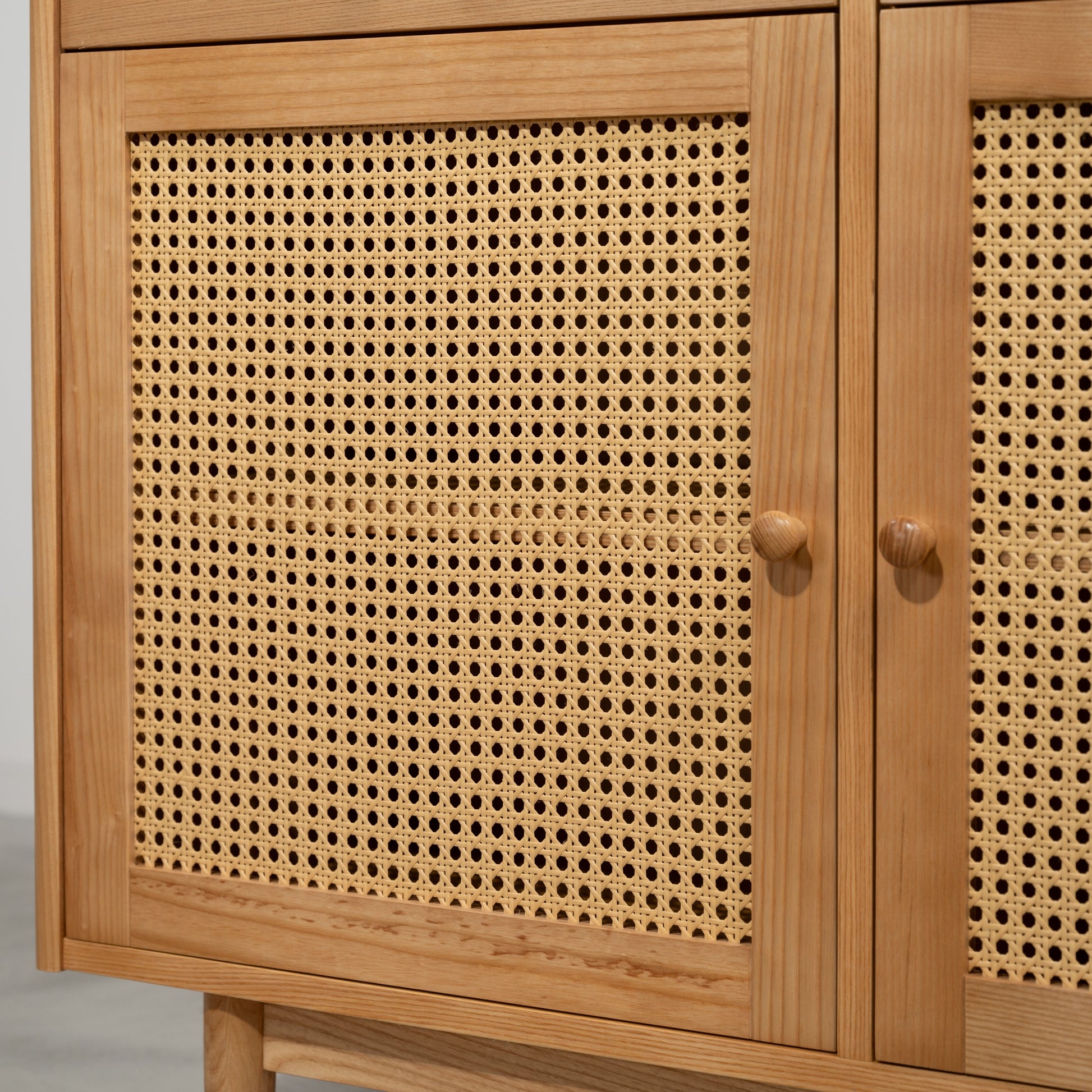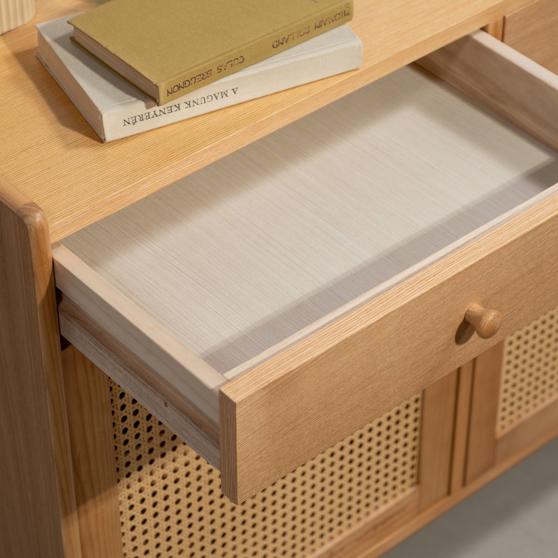幅100cmのワイドなサイズ設計で、十分な収納力を備えたキャビネットです。扉部分に人工ラタンを編み込んだデザインを採用しており、中身を適度に隠しながらも、圧迫感を抑えた佇まいでリビングやダイニングに馴染みます。天板の上はフラットなため、卓上ライトを置いたり、鍵や時計の定位置にしたりと、ディスプレイスペースとしても活用できます。