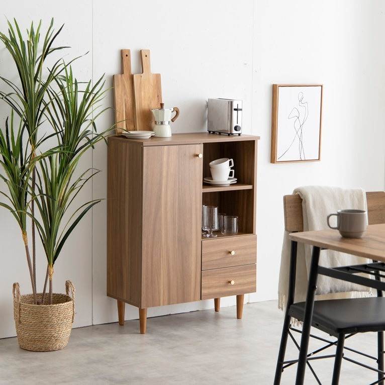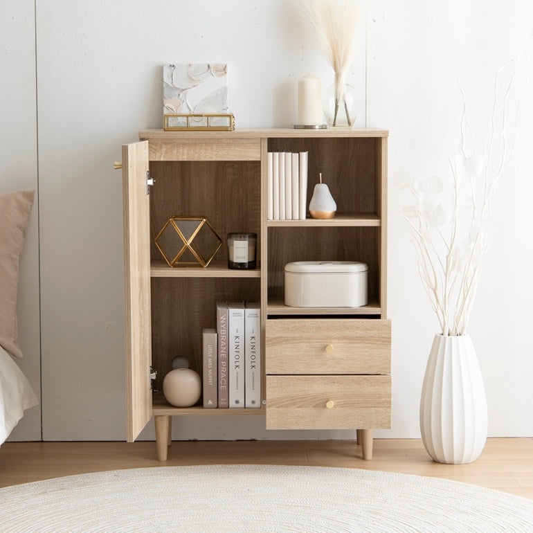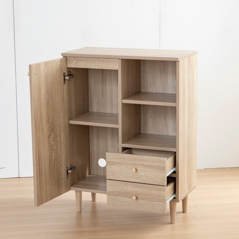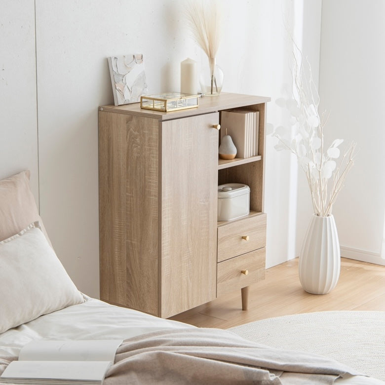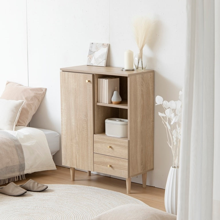 扉収納と引き出し収納を備えたコンパクトなキャビネットです。脚付きデザインで床から少し高さがあり、リビングや寝室、キッチン、ワンルームなど、さまざまな場所に置きやすい設計です。中身を隠しながら収納でき、生活空間をすっきりまとめられます。