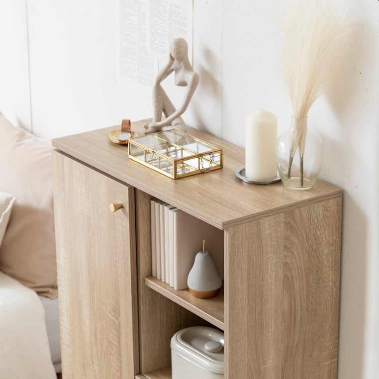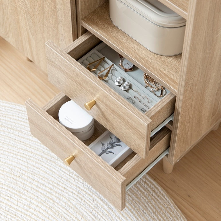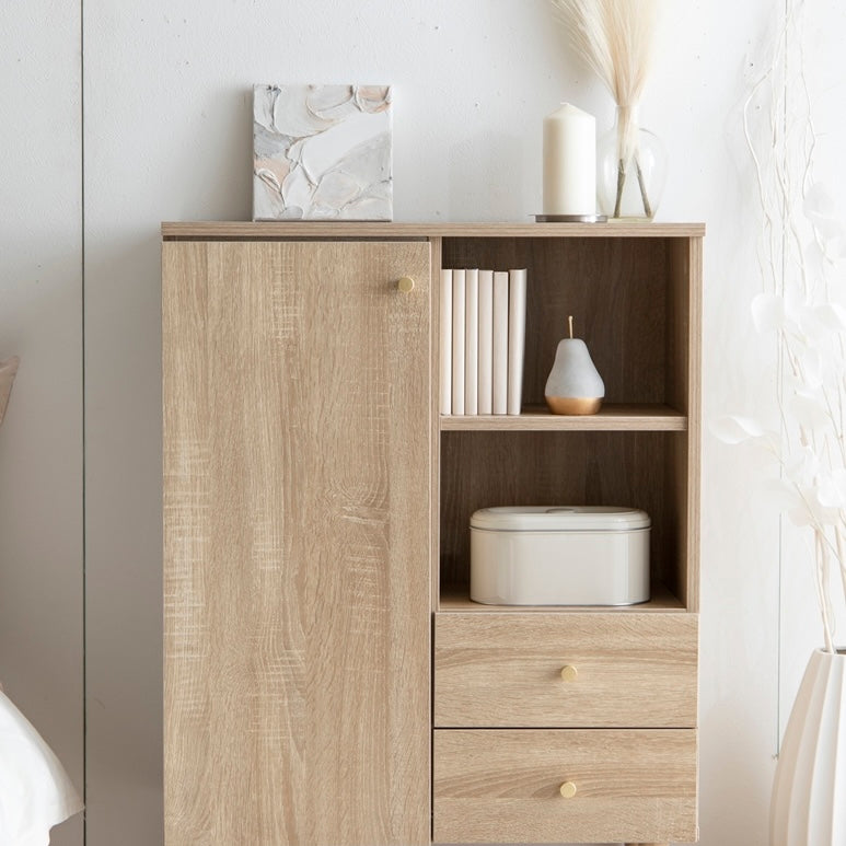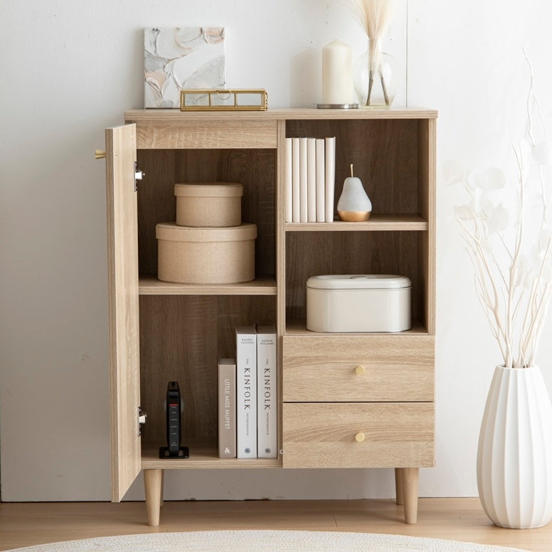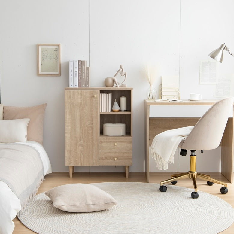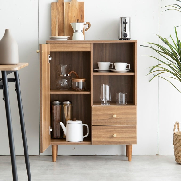 扉収納と引き出し収納を備えたコンパクトなキャビネットです。脚付きデザインで床から少し高さがあり、リビングや寝室、キッチン、ワンルームなど、さまざまな場所に置きやすい設計です。中身を隠しながら収納でき、生活空間をすっきりまとめられます。