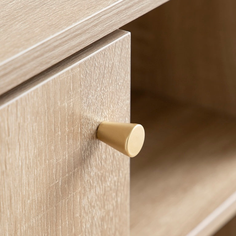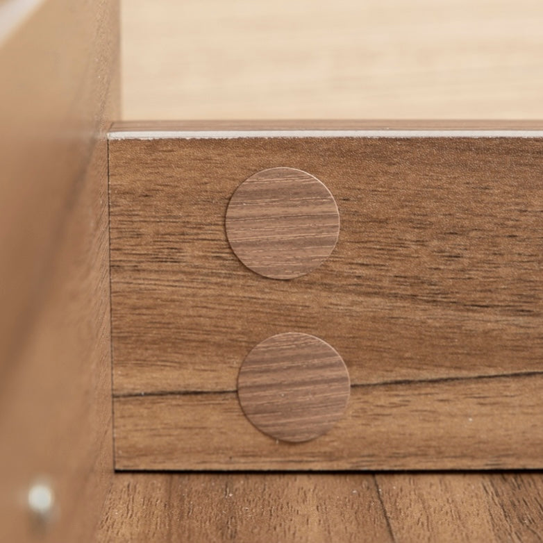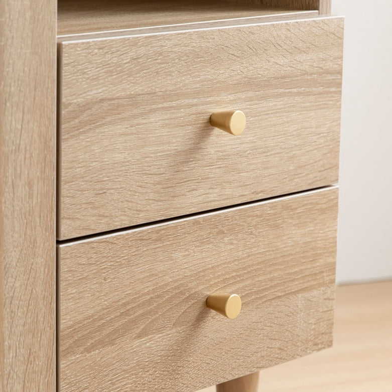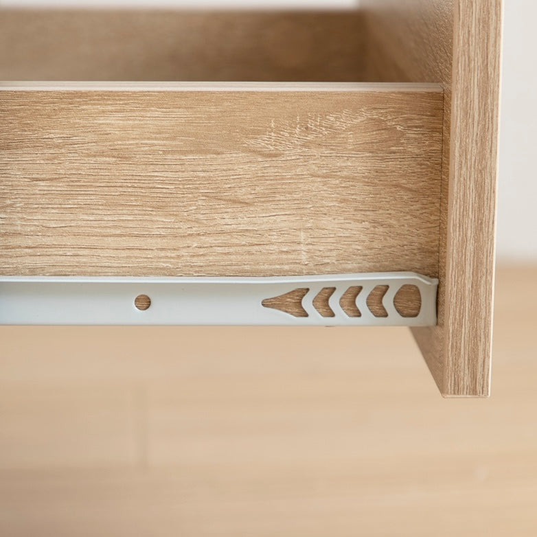 扉収納と引き出し収納を使い分けることで、物の種類や使用頻度に合わせた整理が可能です。コード穴付きで配線を通したまま設置できます。コンパクトサイズで場所を取らず、カラーはナチュラルとブラウンの2色から選べます。
