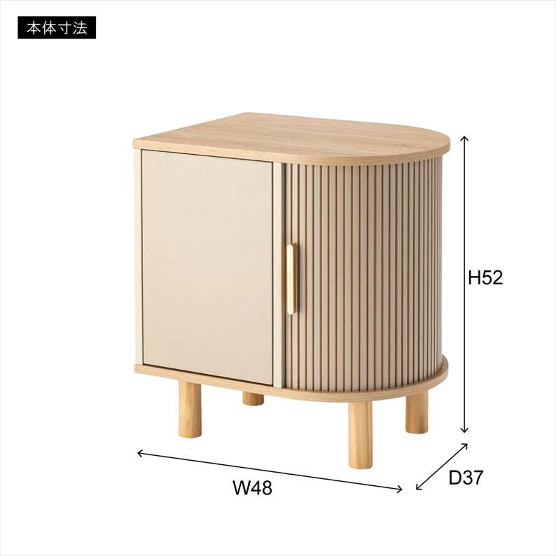 波打つような扉デザインと扇形の天板が特徴のキャビネットです。