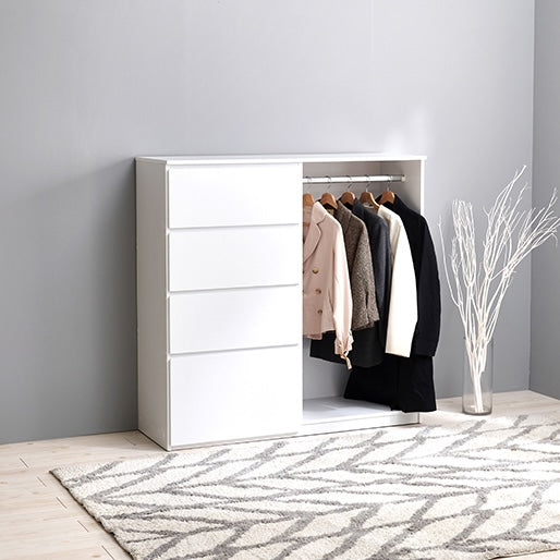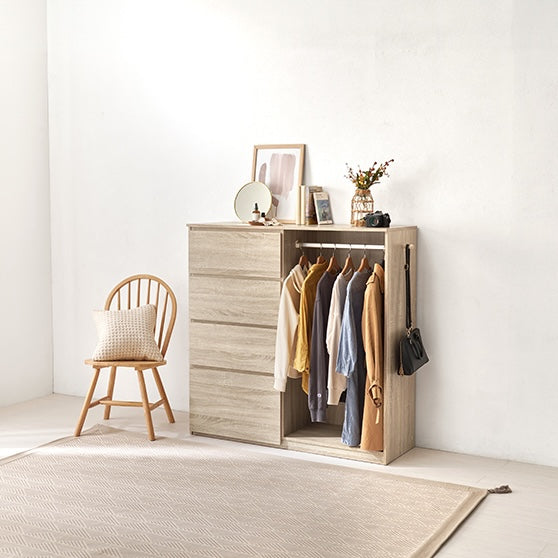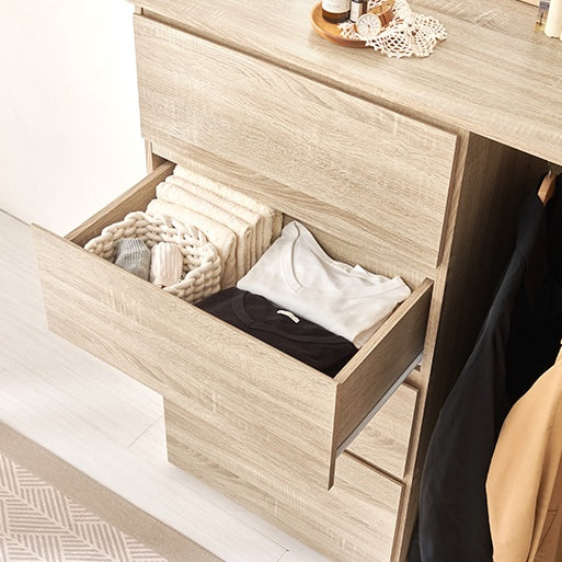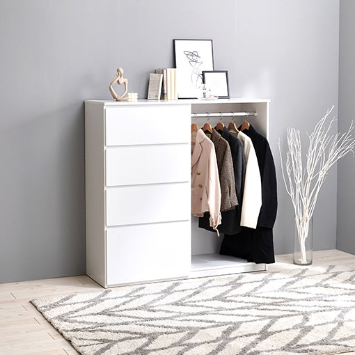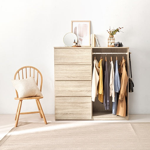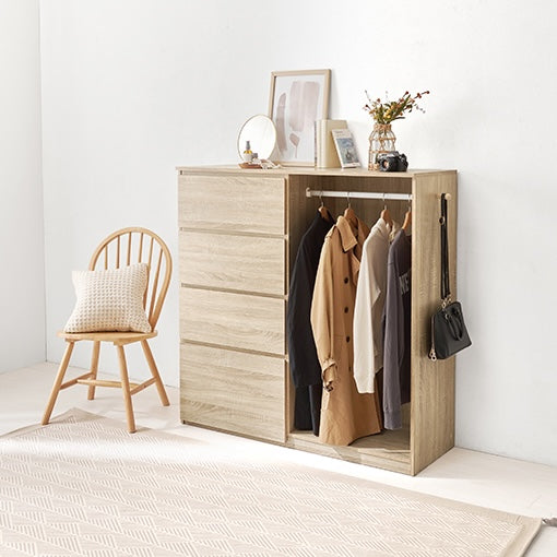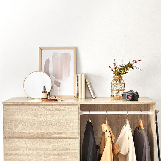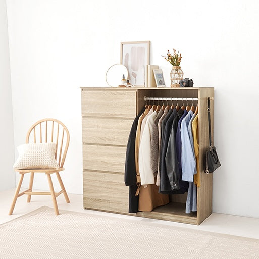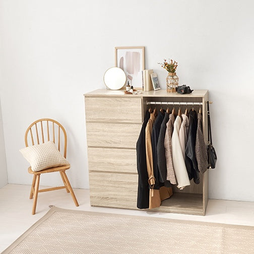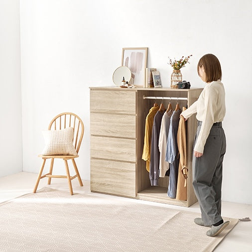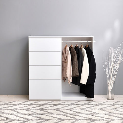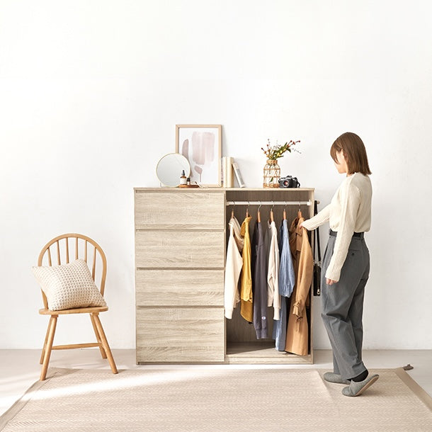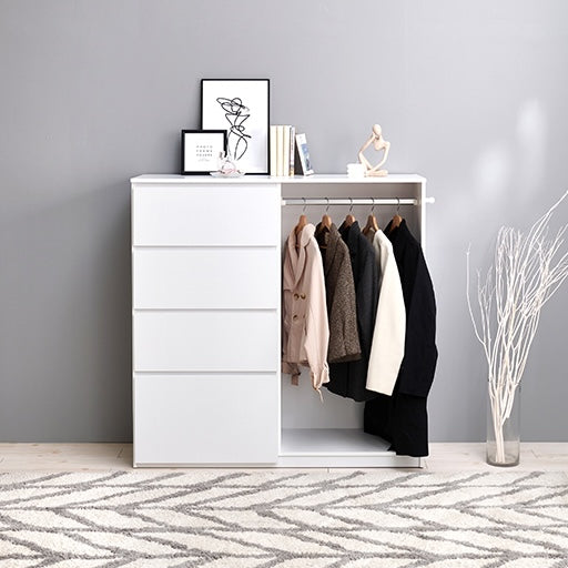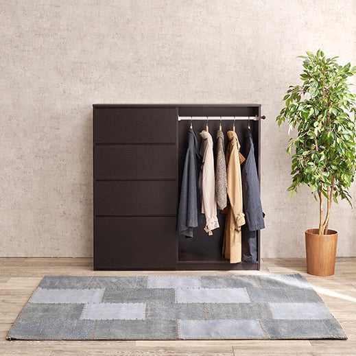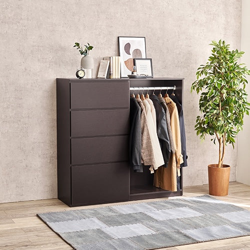 ハンガー収納と引出し収納を一体にした収納家具です。リビングや寝室、ワンルーム、クローゼット横に置きやすく、衣類と小物をまとめて管理できます。限られたスペースでも使いやすい構造です。