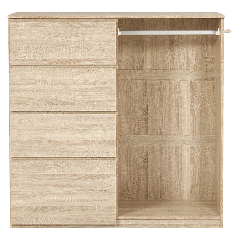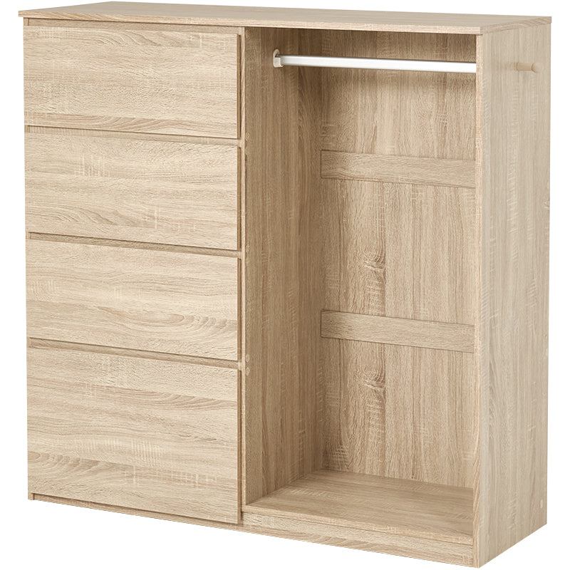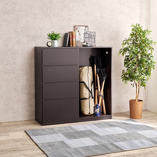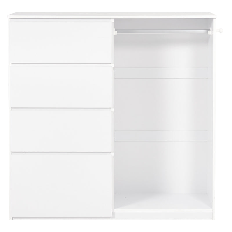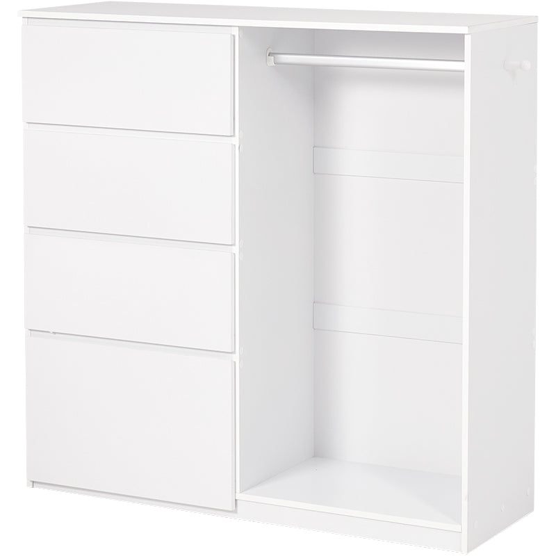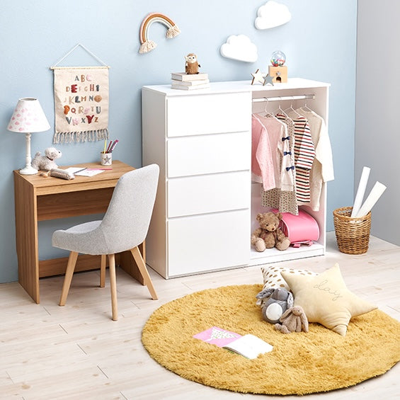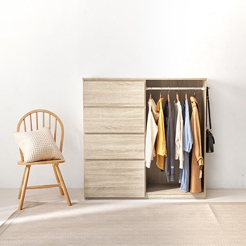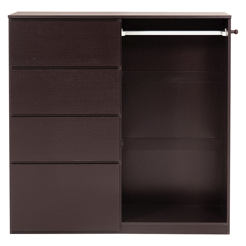 ハンガー収納と引出し収納を一体にした収納家具です。リビングや寝室、ワンルーム、クローゼット横に置きやすく、衣類と小物をまとめて管理できます。限られたスペースでも使いやすい構造です。