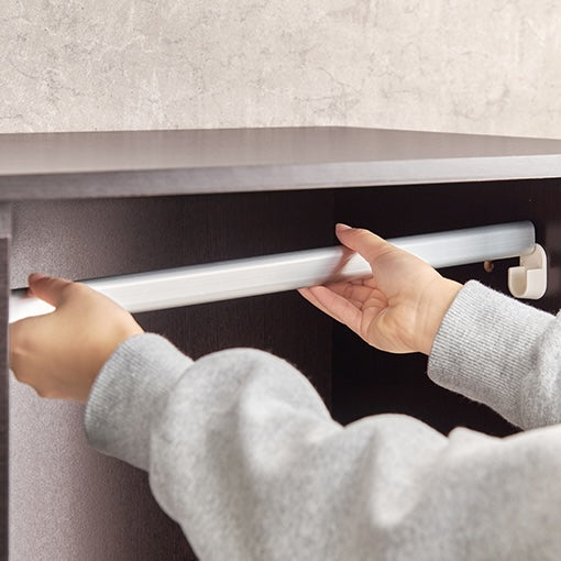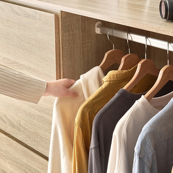 トップスやアウターはハンガーポールに掛けて収納できます。引出しにはボトムスやタオル、小物類をまとめられます。収納場所を分けることで、毎日の着替えや片付けがスムーズになります。一人暮らしの衣類収納を1台でまとめたい場合にも対応できます。