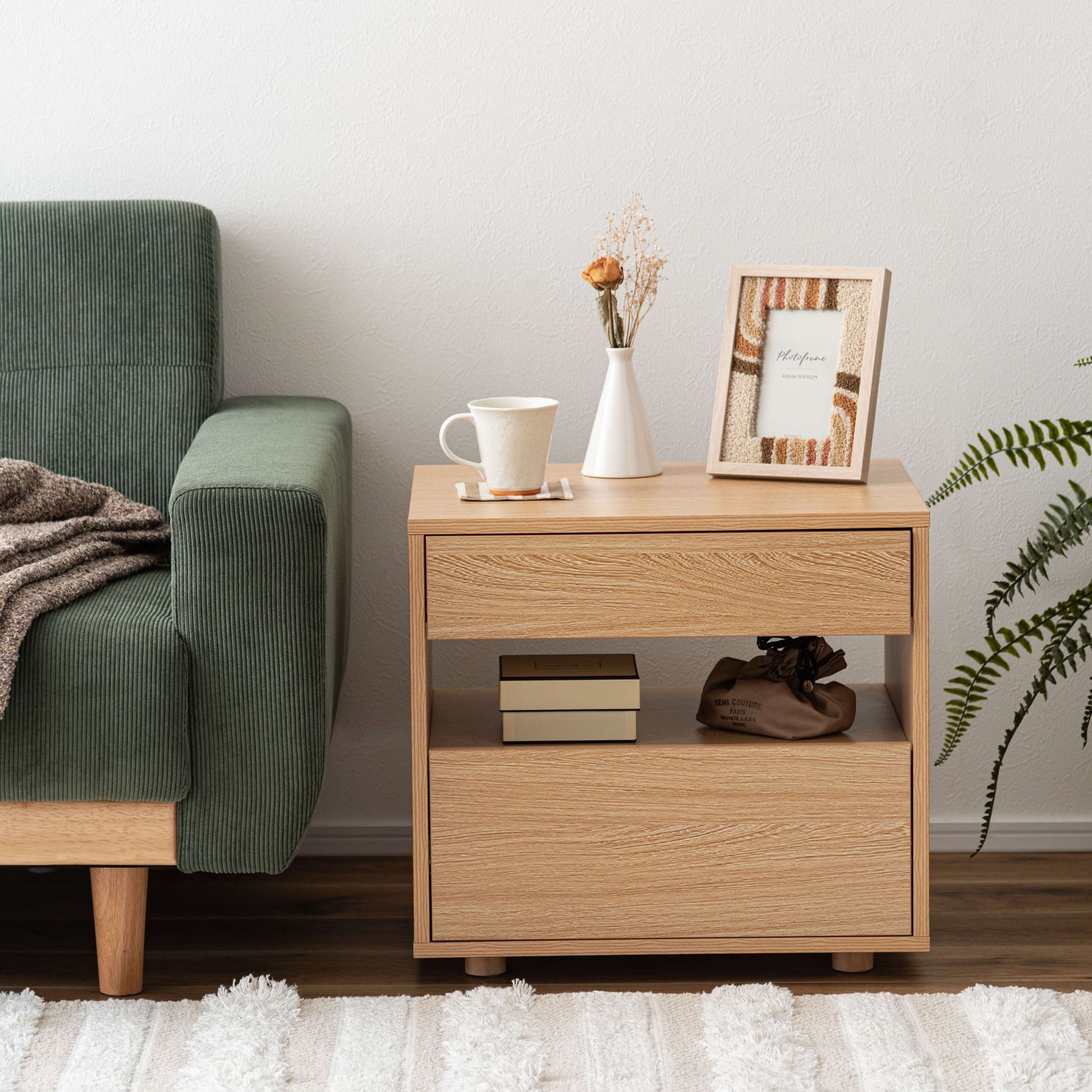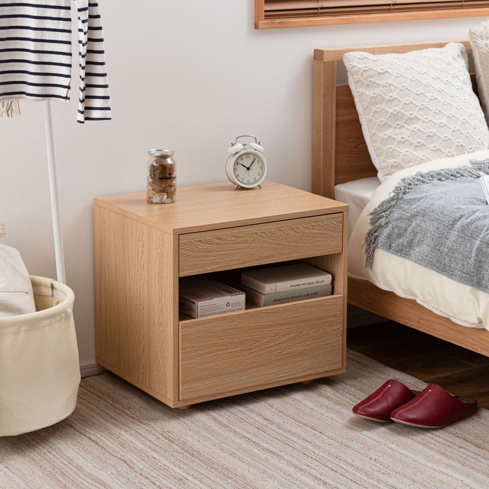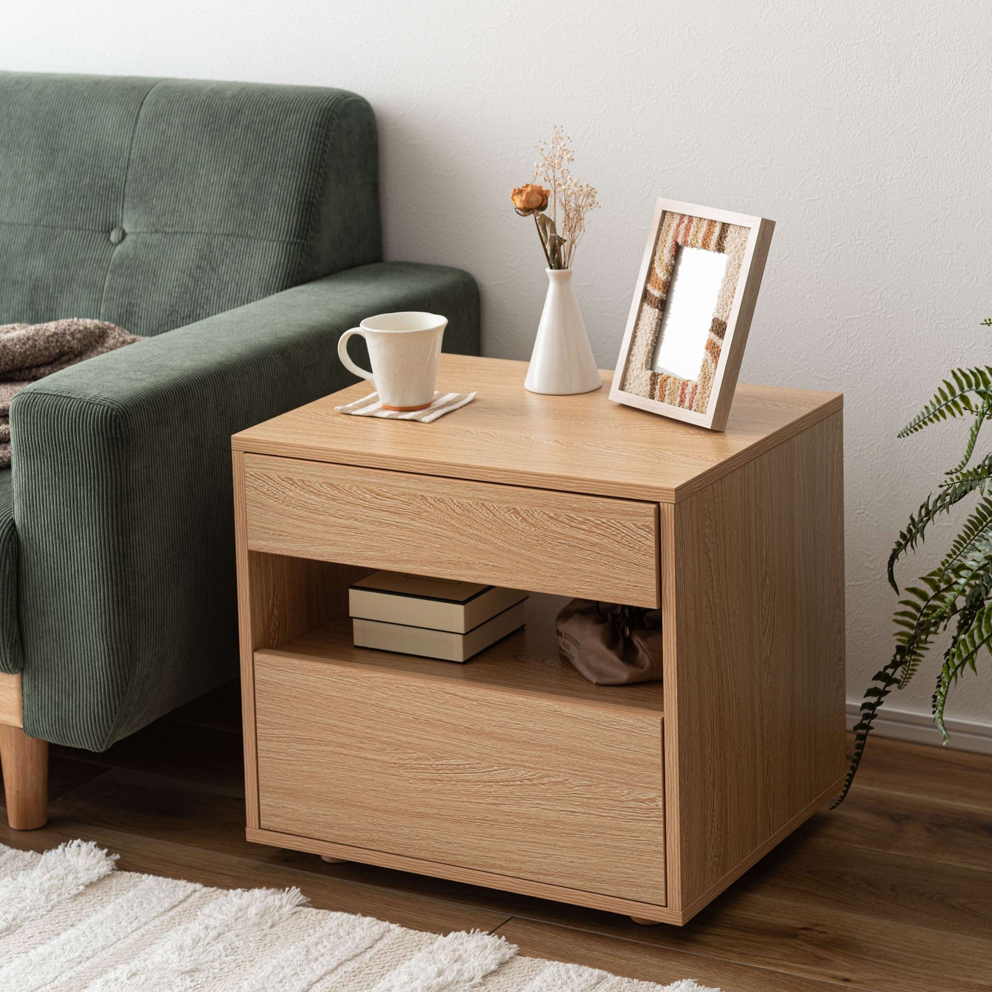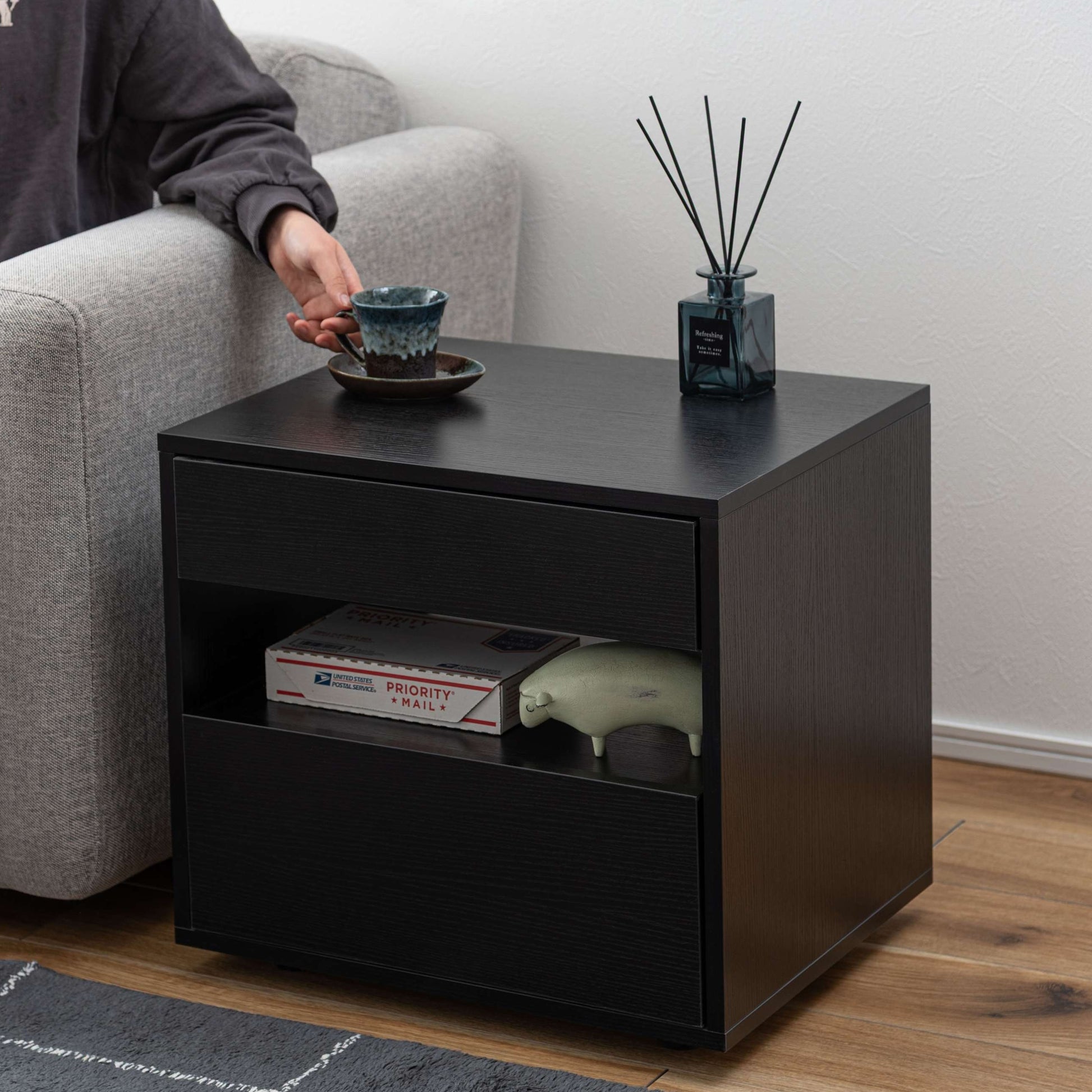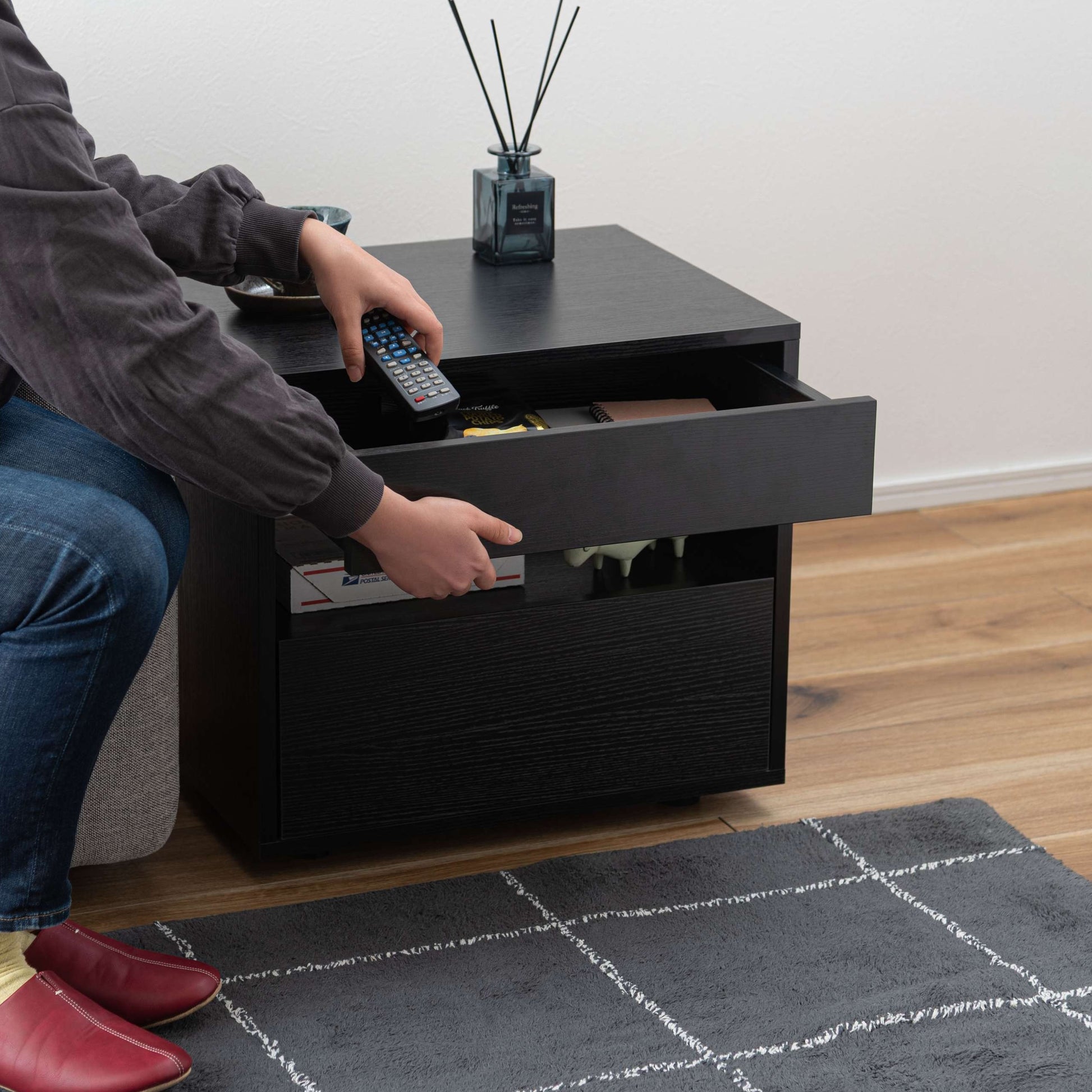 ベッド横では本やスマートフォン、眼鏡などの小物収納に使えます。ソファ横ではリモコンや雑誌の置き場として便利です。オープン収納と引き出しを使い分けることで、よく使う物と隠したい物を整理できます。省スペースのサイド収納として、必要な物を手元にまとめられます。