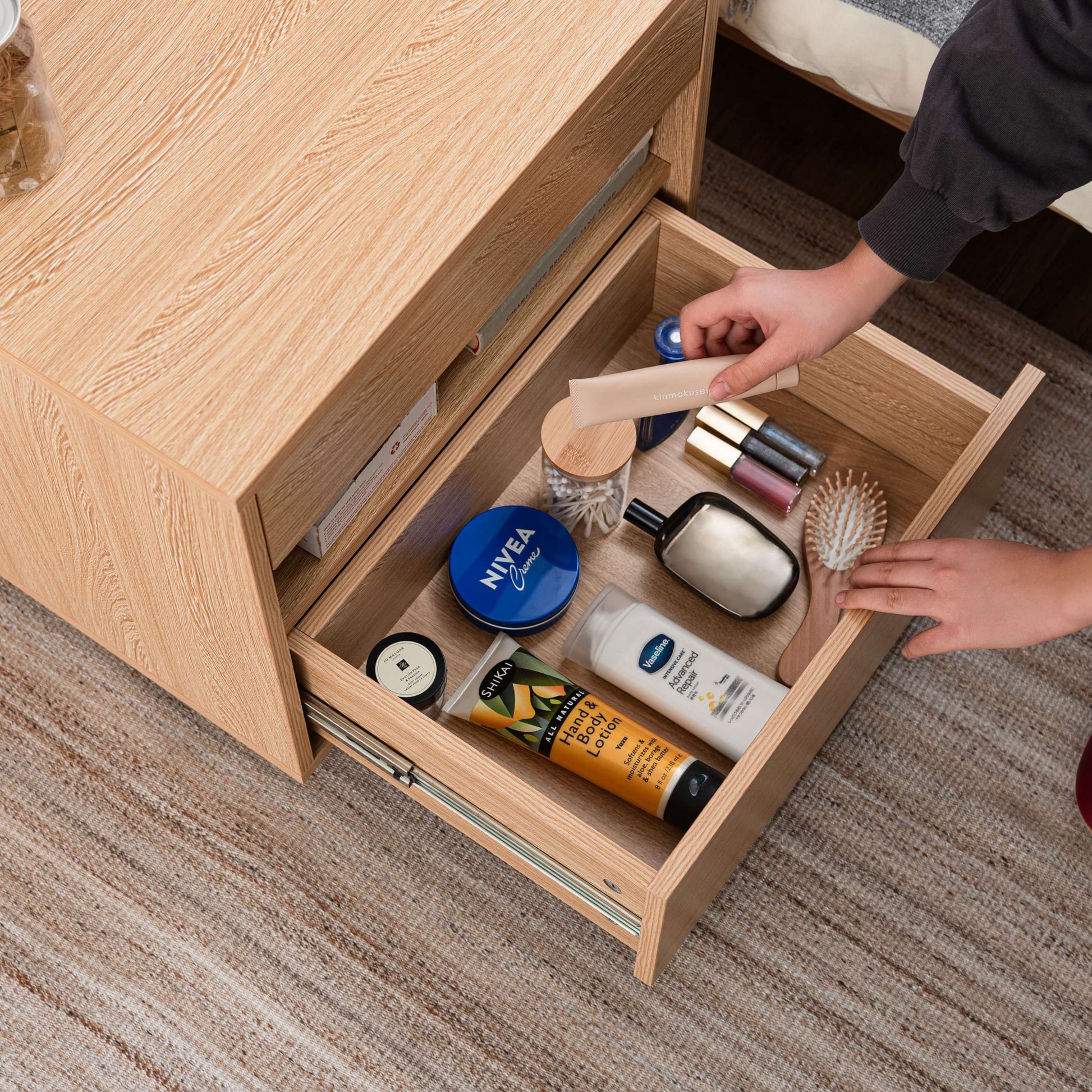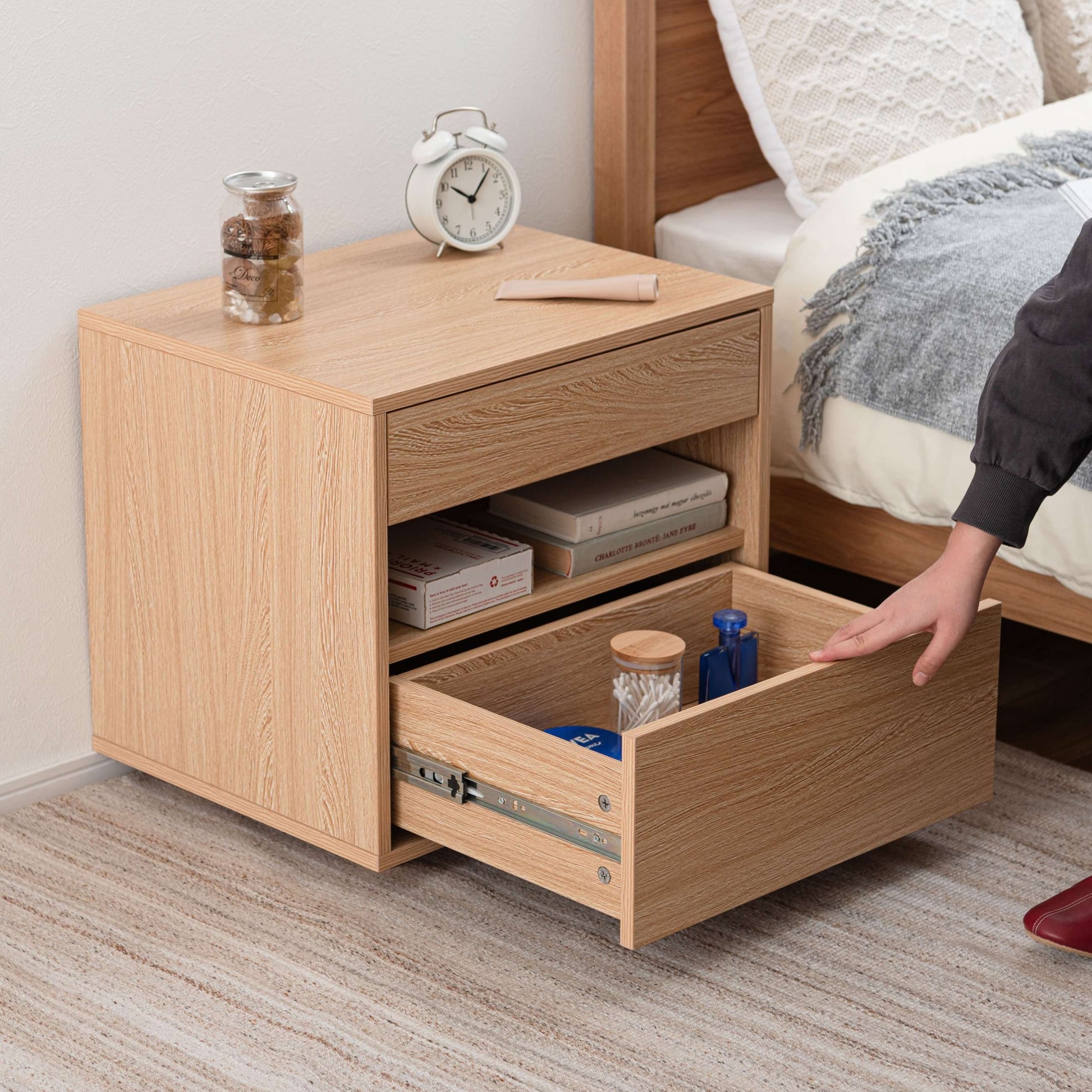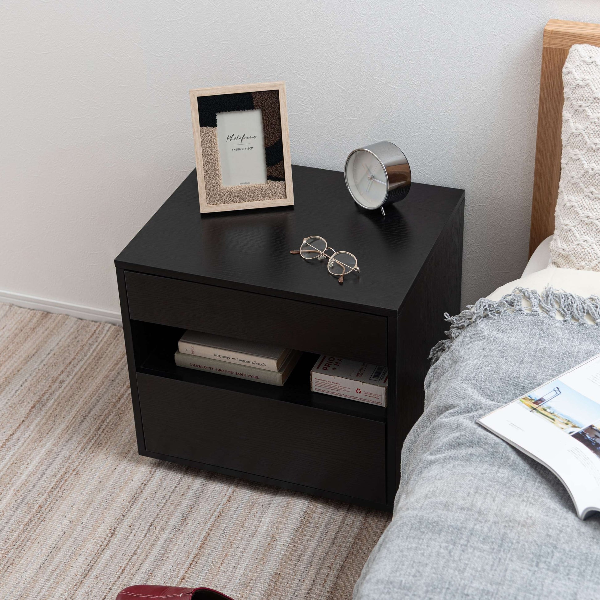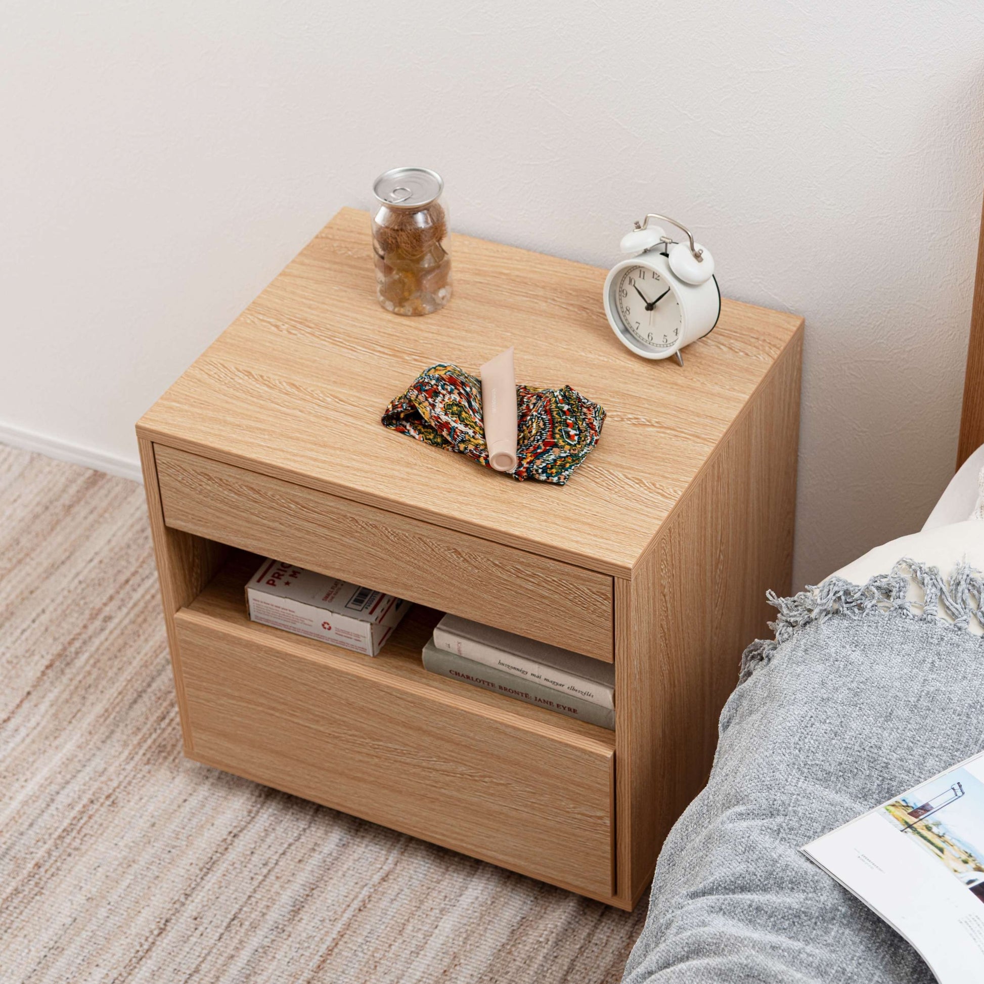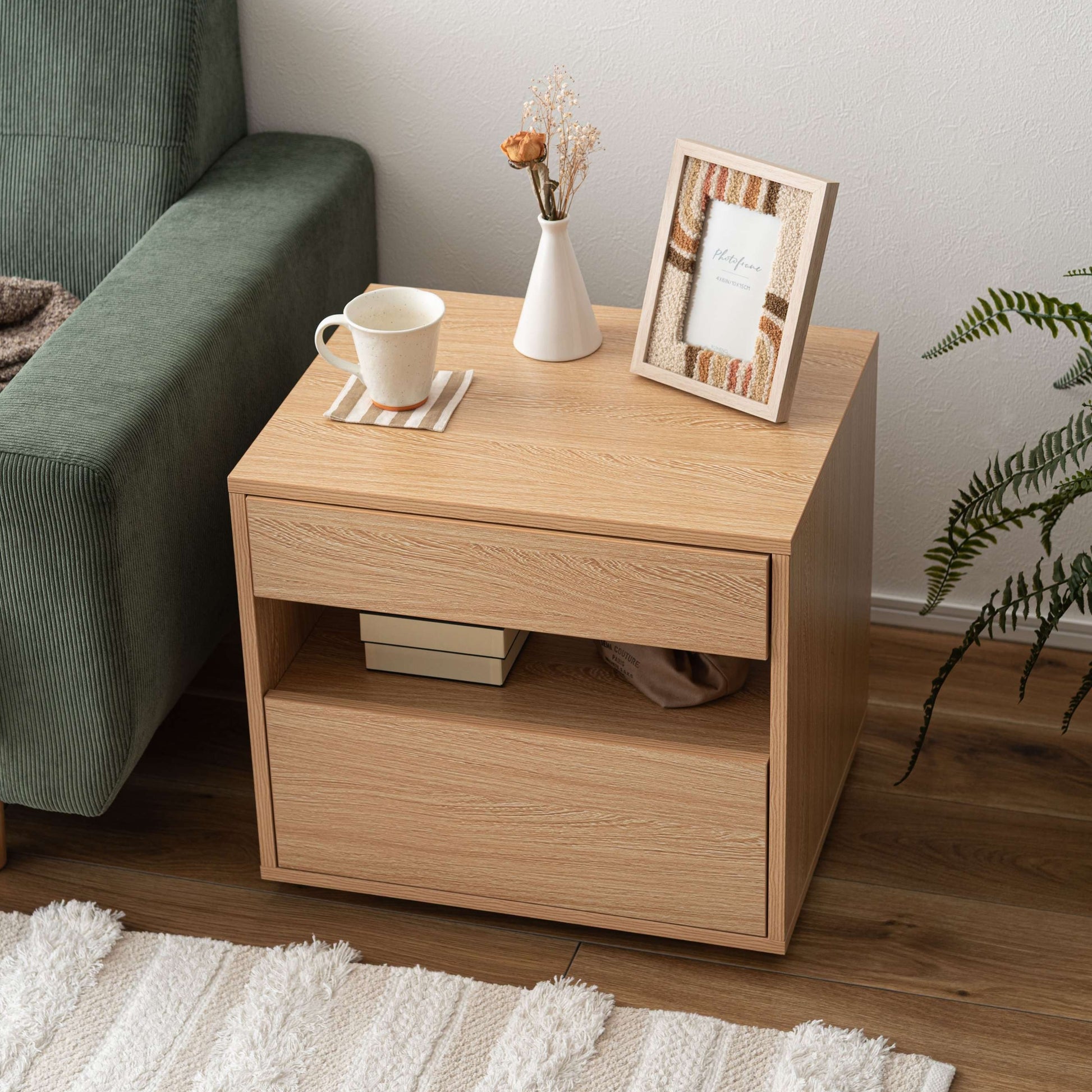 ベッド横では本やスマートフォン、眼鏡などの小物収納に使えます。ソファ横ではリモコンや雑誌の置き場として便利です。オープン収納と引き出しを使い分けることで、よく使う物と隠したい物を整理できます。省スペースのサイド収納として、必要な物を手元にまとめられます。
