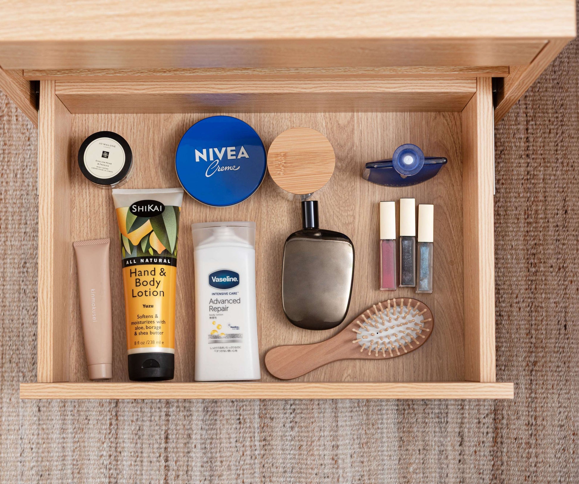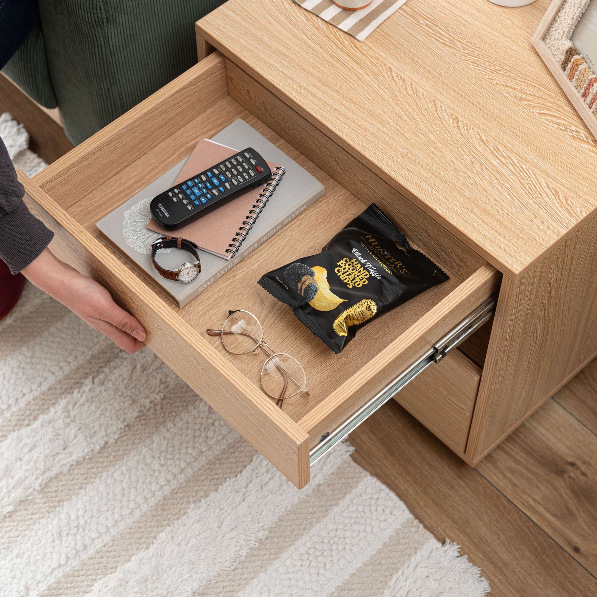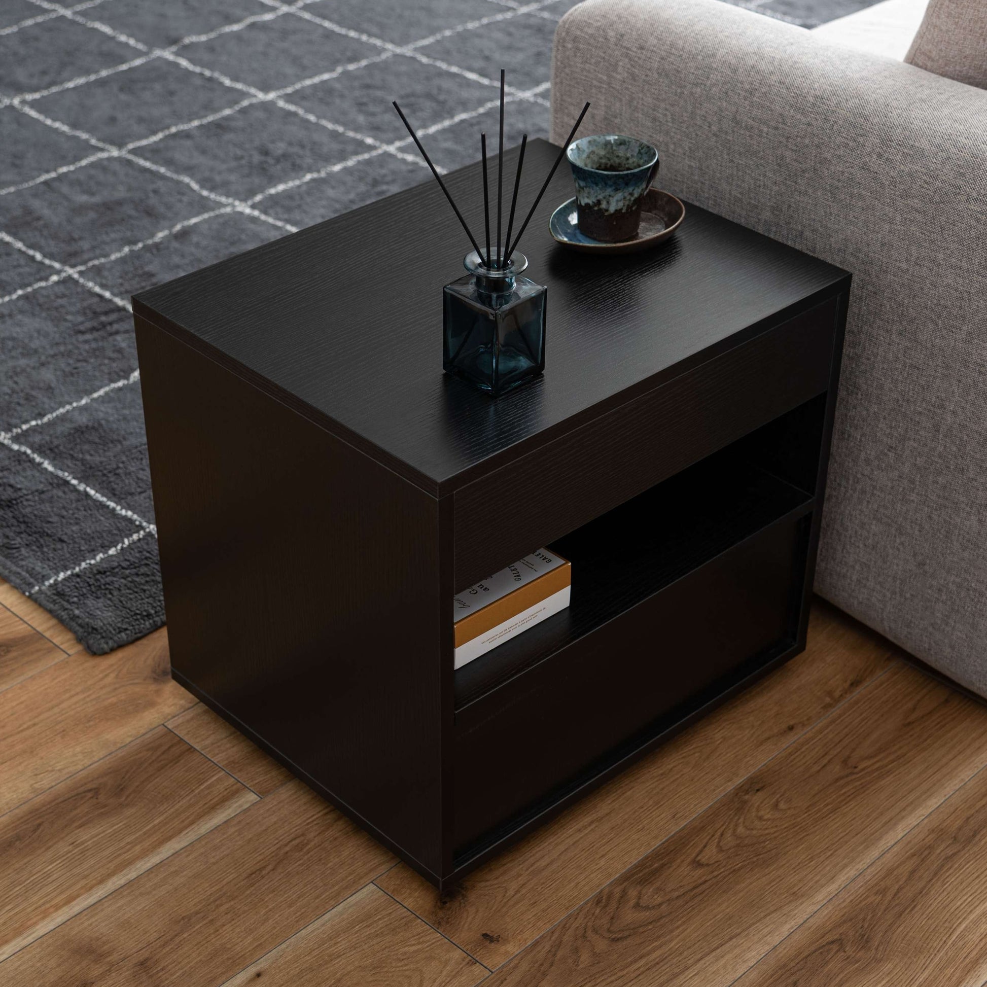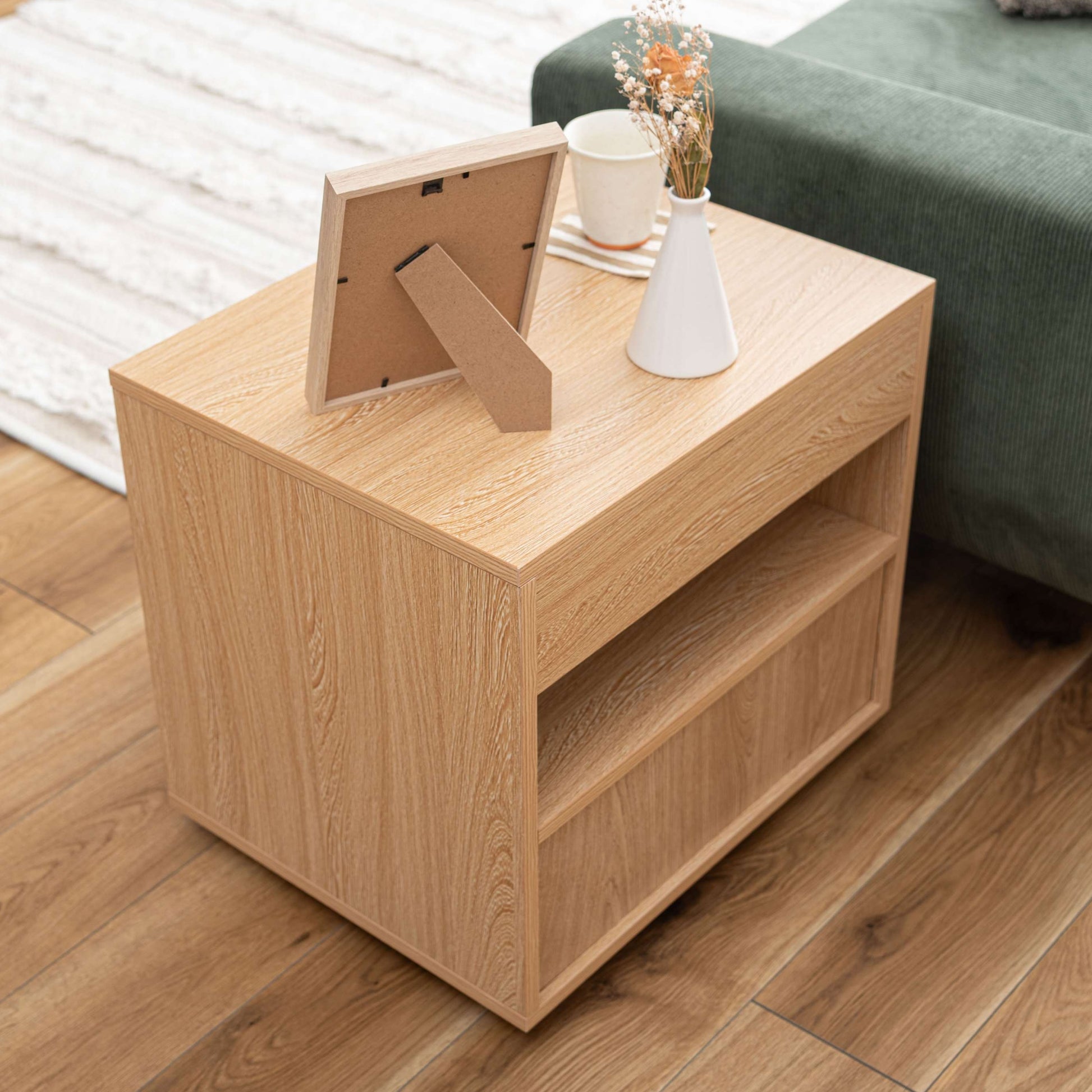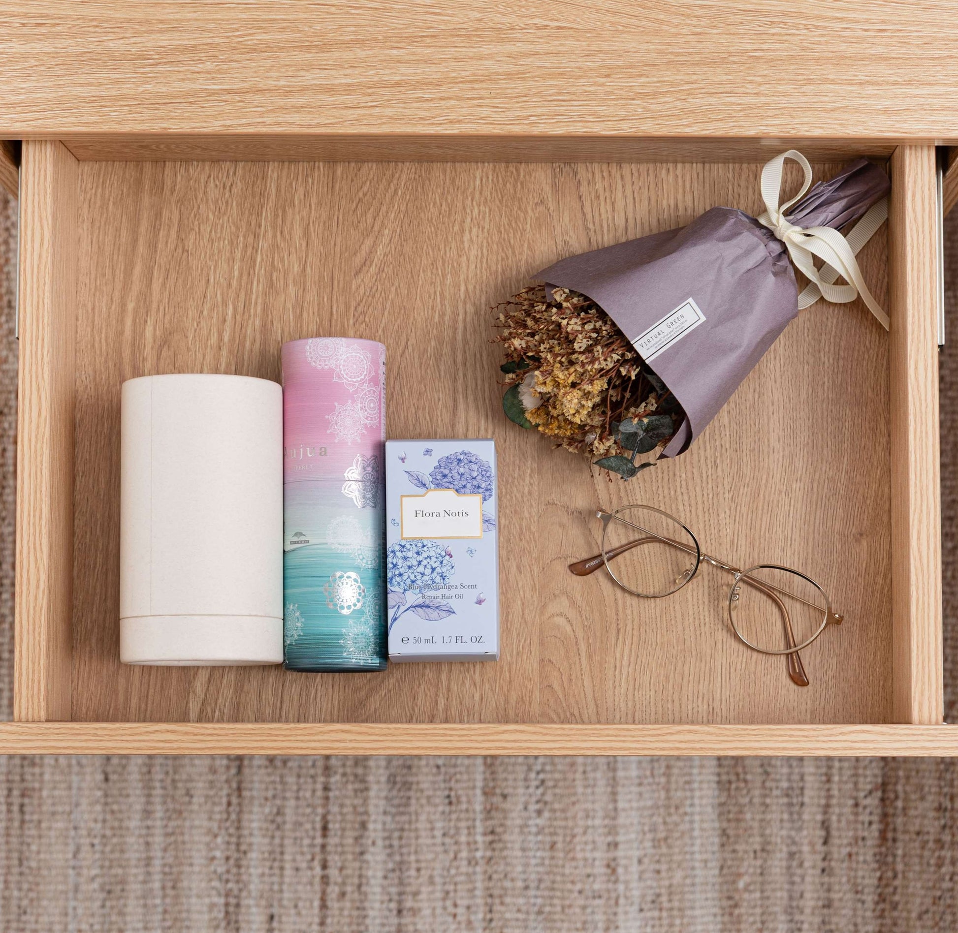 ベッド横では本やスマートフォン、眼鏡などの小物収納に使えます。ソファ横ではリモコンや雑誌の置き場として便利です。オープン収納と引き出しを使い分けることで、よく使う物と隠したい物を整理できます。省スペースのサイド収納として、必要な物を手元にまとめられます。