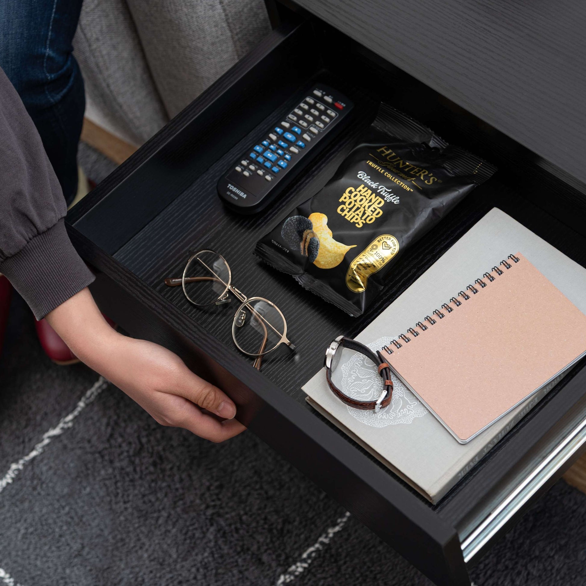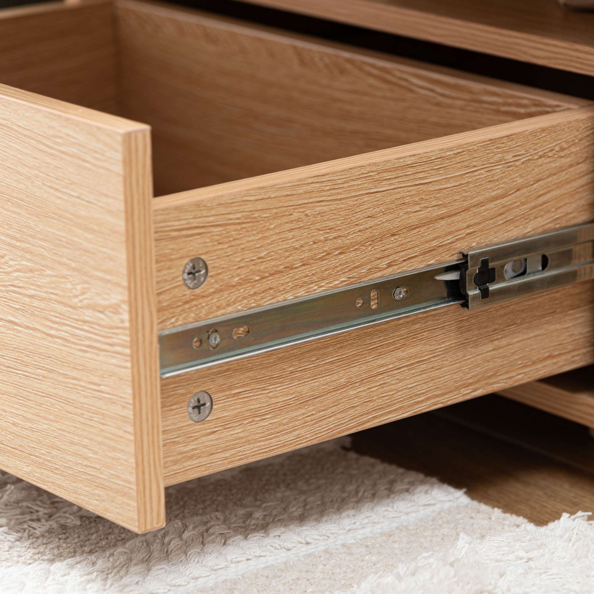 引き出しはスライドレール仕様で、開閉がスムーズです。2段式構造で収納量を確保しつつ、コンパクトに収まります。カラーはナチュラルとブラックの2色展開で、部屋の雰囲気に合わせて選べます。
