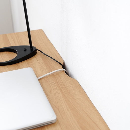 天板は汚れに強いPVC仕様。日々のPC作業や勉強、メイク、趣味の作業など、気兼ねなく使えるのがポイントです。天板にはコード通し付きで、パソコンやデスクライトの配線もすっきりまとめられます。壁にぴったり設置できるため、配線が邪魔になりにくいのも嬉しいところ。