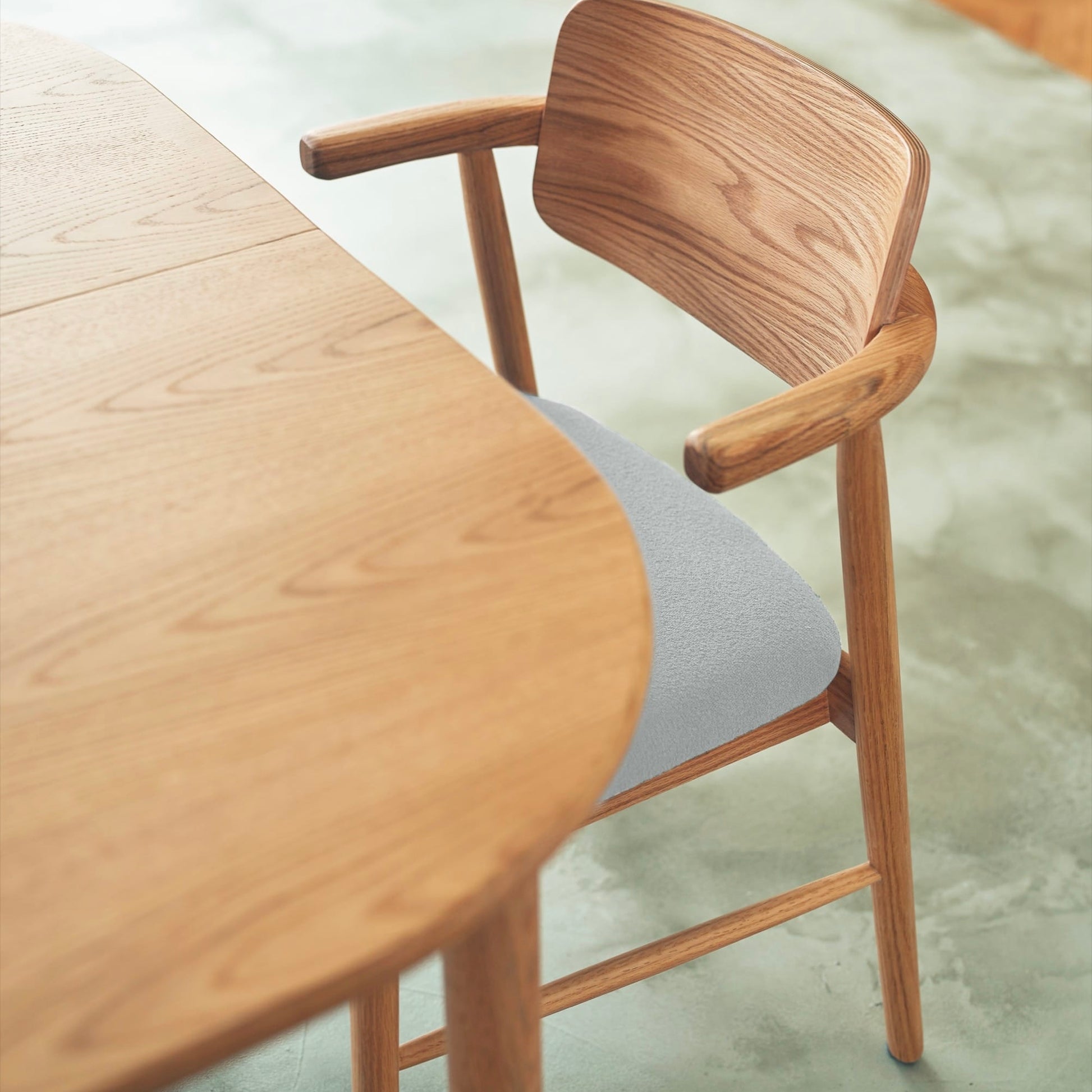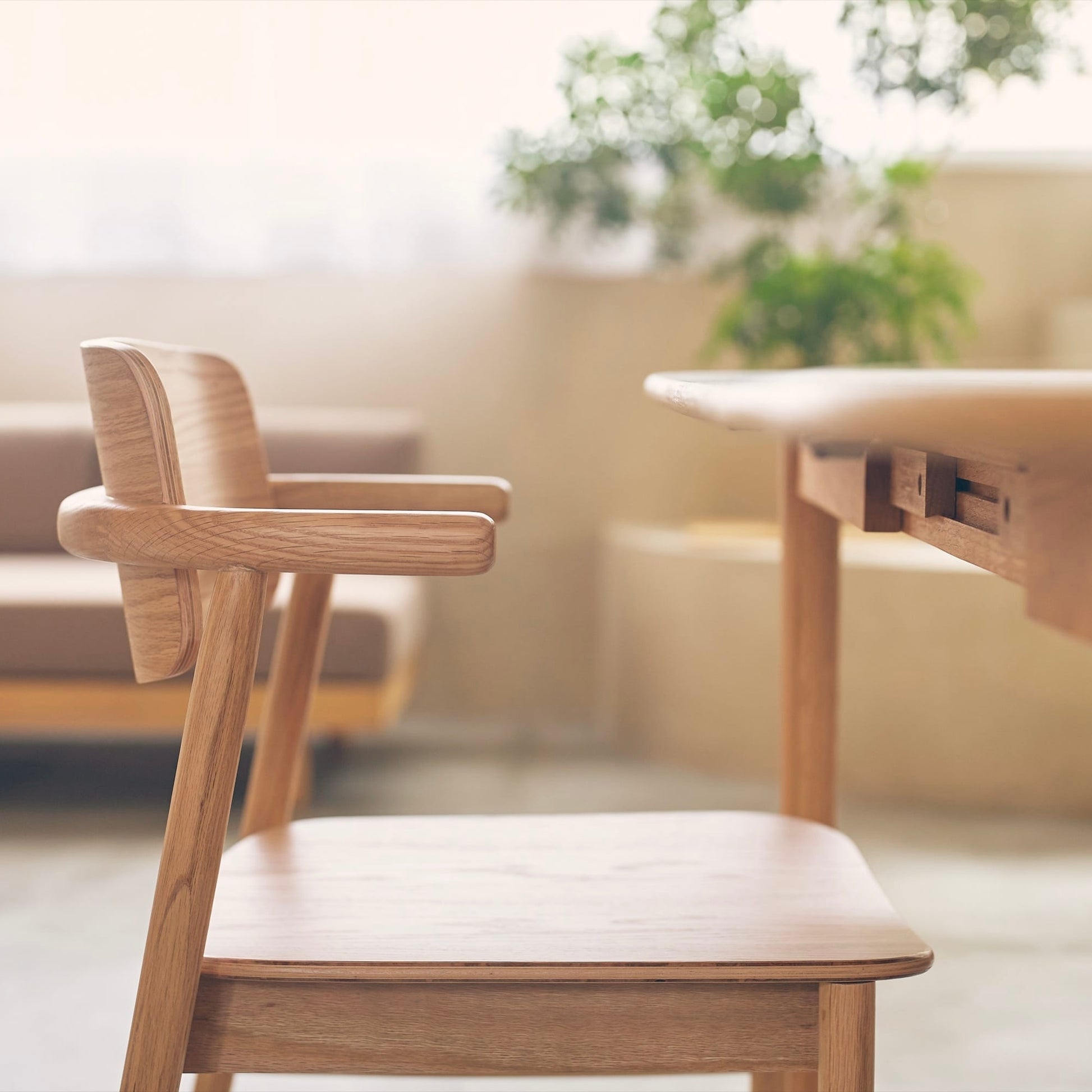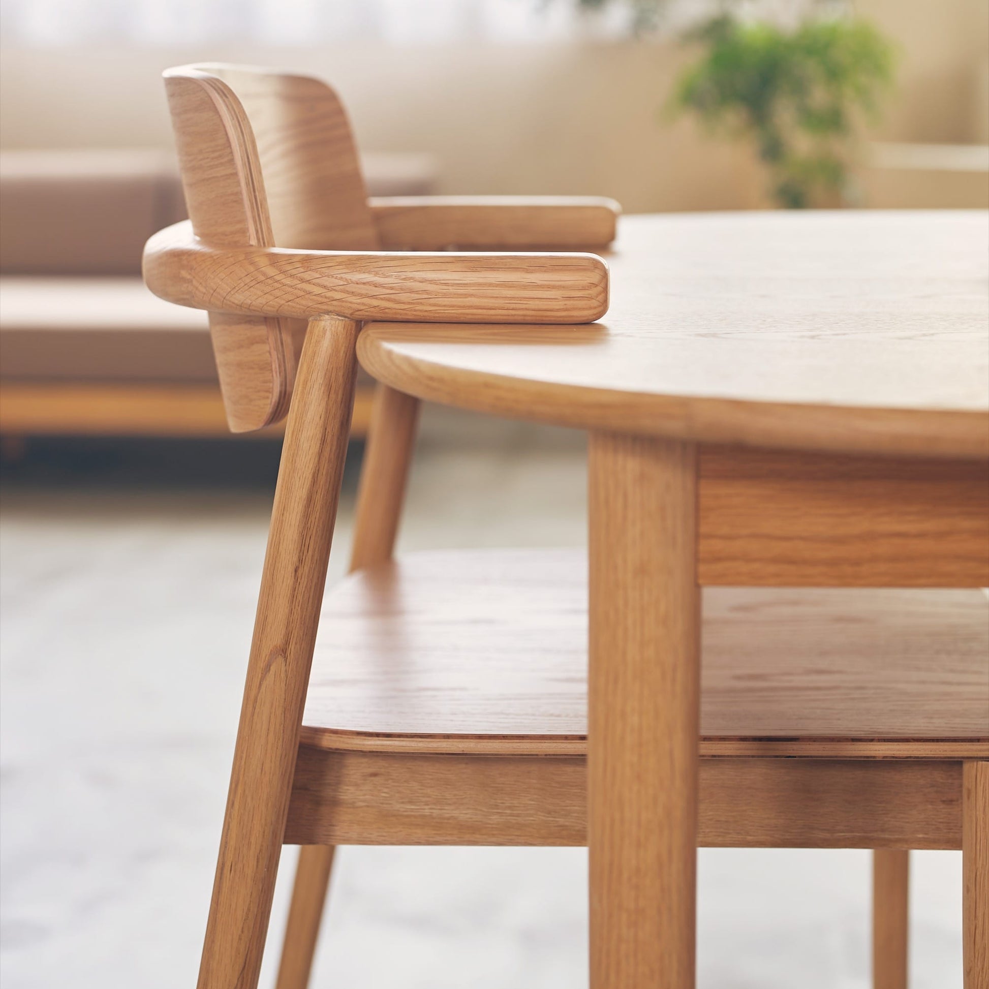 ほどよい長さのハーフアームは、座ったときに肘を軽く預けられるのがポイント。食事中や作業の合間に腕を休ませたり、使わないときは肘部分をテーブルに掛けて椅子を浮かせることもできるので、床掃除がぐっとラクになります。