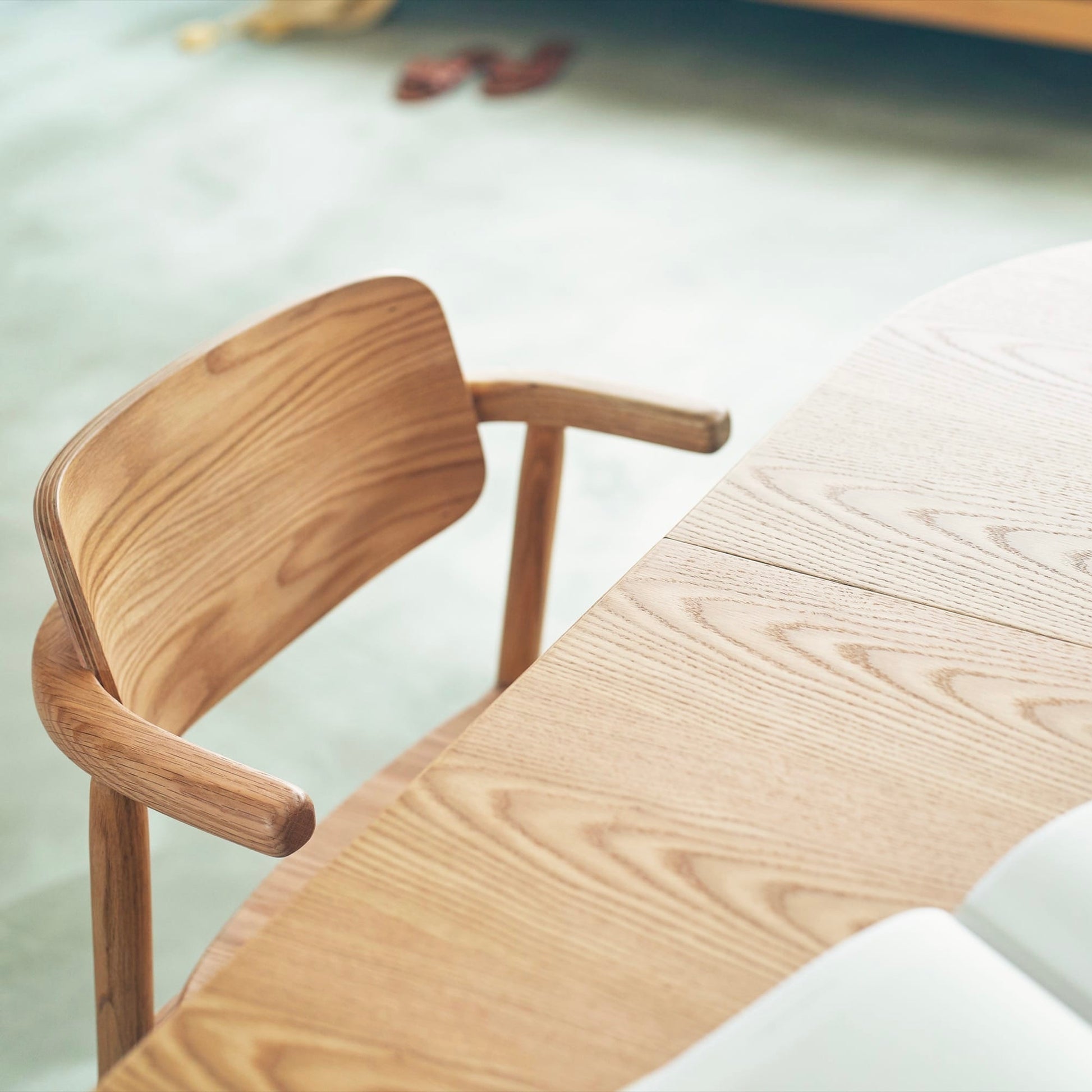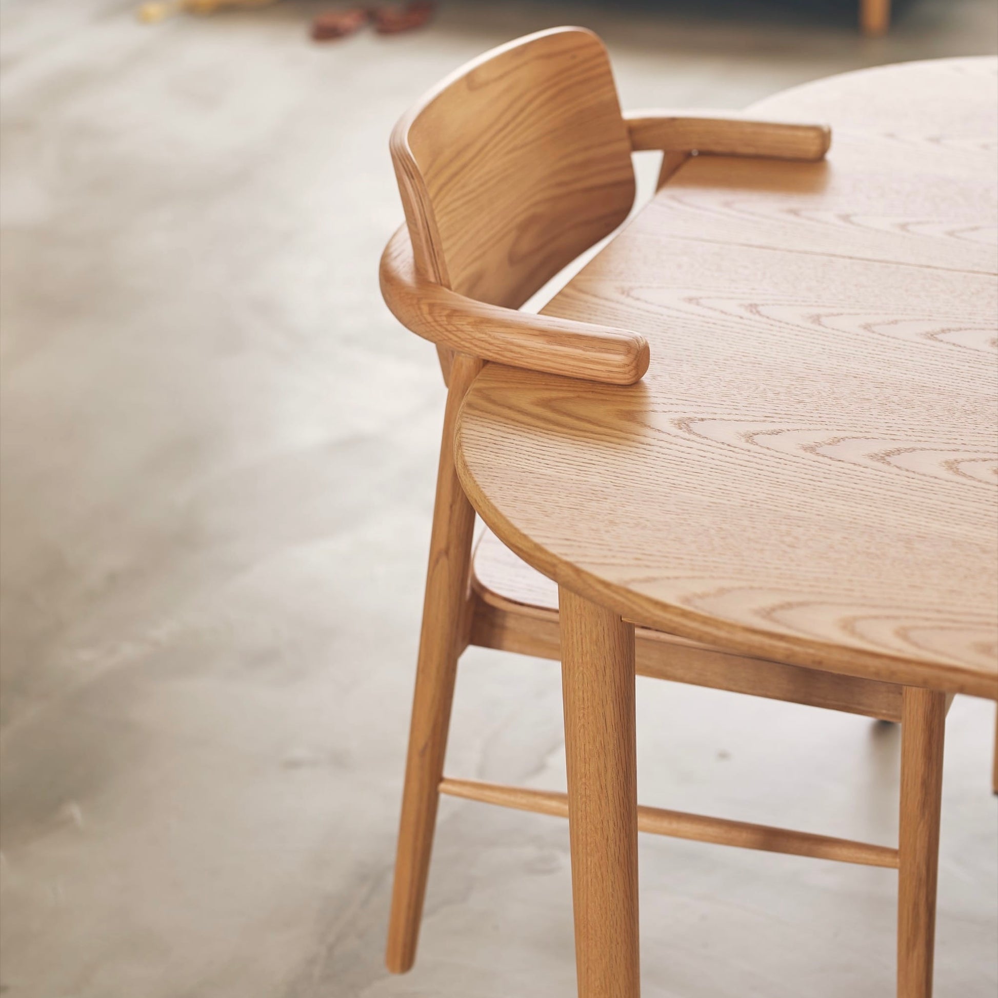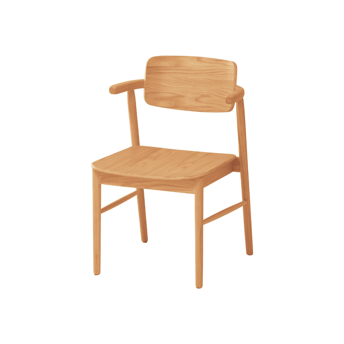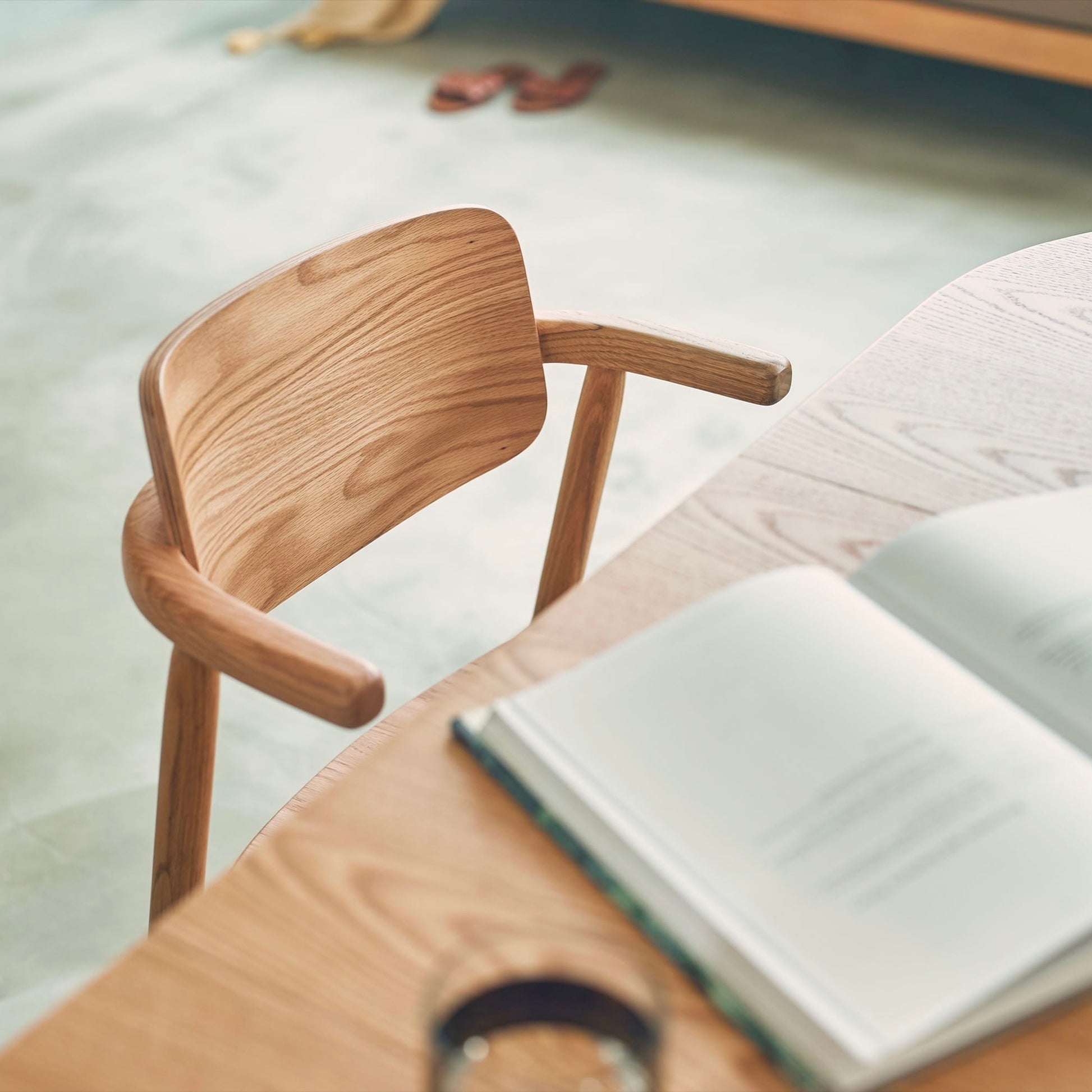 ほどよい長さのハーフアームは、座ったときに肘を軽く預けられるのがポイント。食事中や作業の合間に腕を休ませたり、使わないときは肘部分をテーブルに掛けて椅子を浮かせることもできるので、床掃除がぐっとラクになります。