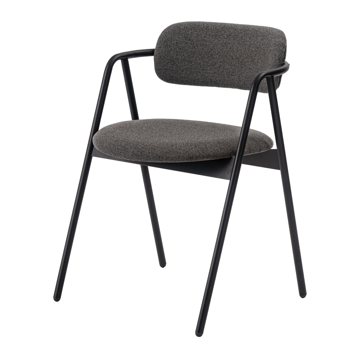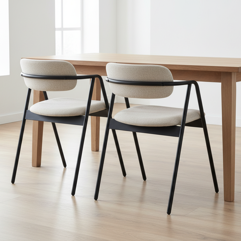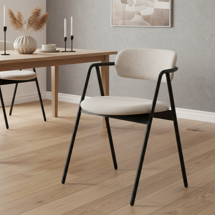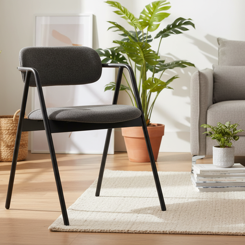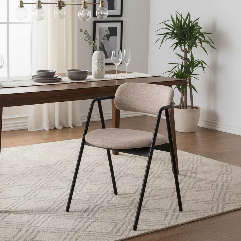 やわらかなファブリック座面と、すっきりとしたスチールフレームを組み合わせたダイニングチェア。