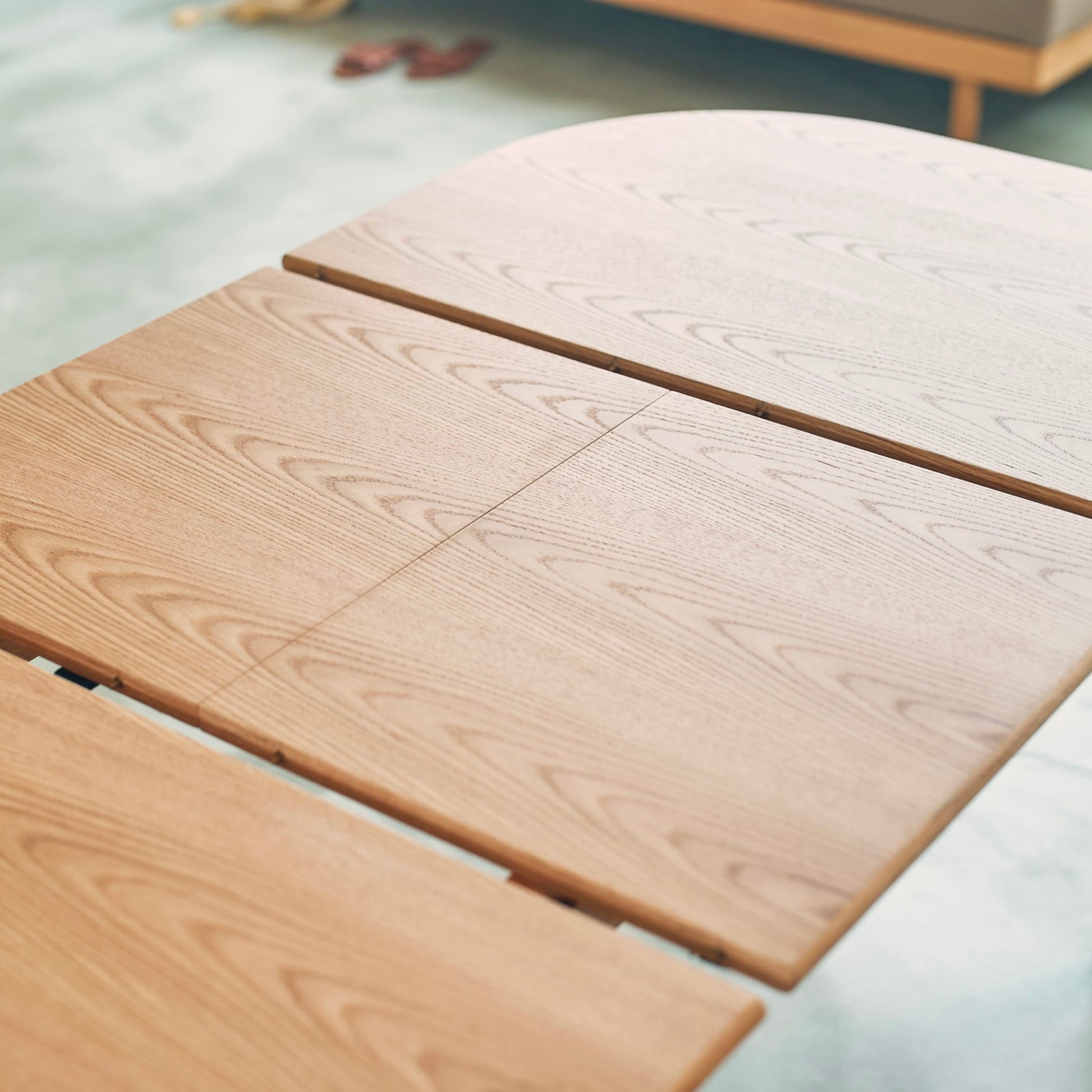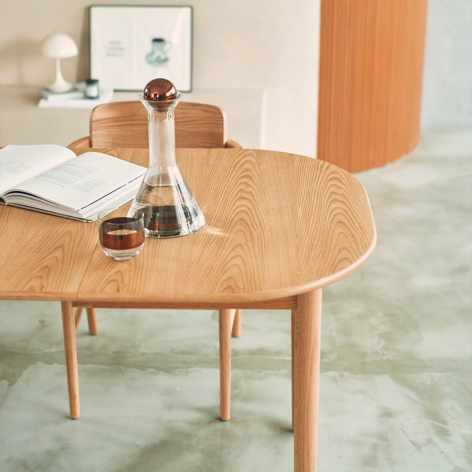 やさしいナチュラルカラーと、天然木ならではの風合いが魅力のダイニングテーブル。天板にはオーク突板、フレームにはオーク無垢材を使い、木のぬくもりをしっかり感じられる仕上がりに。角に丸みをもたせた楕円形のデザインは、見た目もやわらかく、お部屋に置いても圧迫感を与えません。自然な木目が空間にすっとなじみ、北欧テイストやナチュラルインテリアとも相性抜群です。