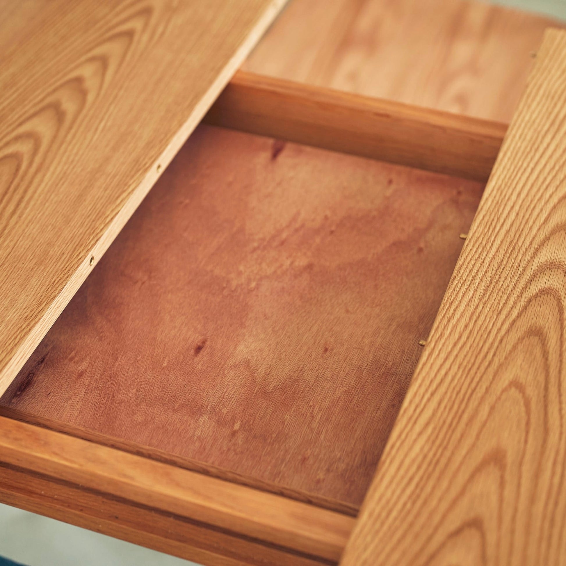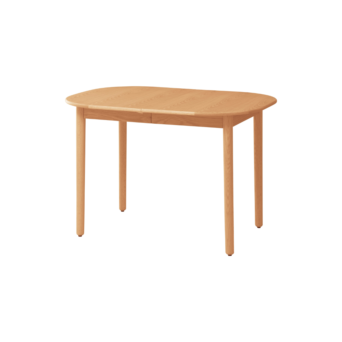 このテーブルの一番のポイントは、使い方に合わせて広さを変えられる伸長式であること。普段はコンパクトに使えるので、毎日の食事やちょっとした作業にもぴったり。来客時や家族が集まるシーンでは、天板を広げるだけでゆったりとしたサイズに変えられます。