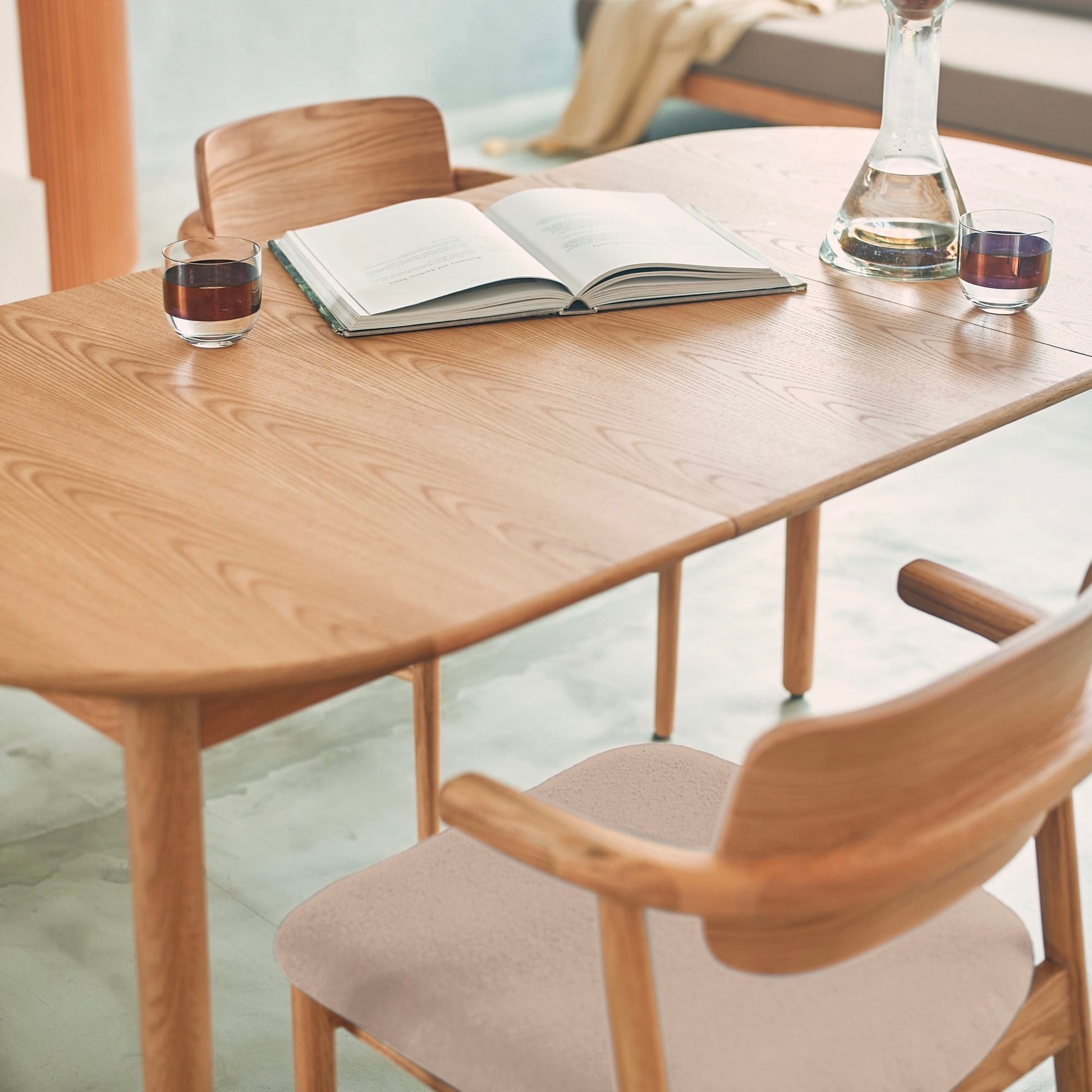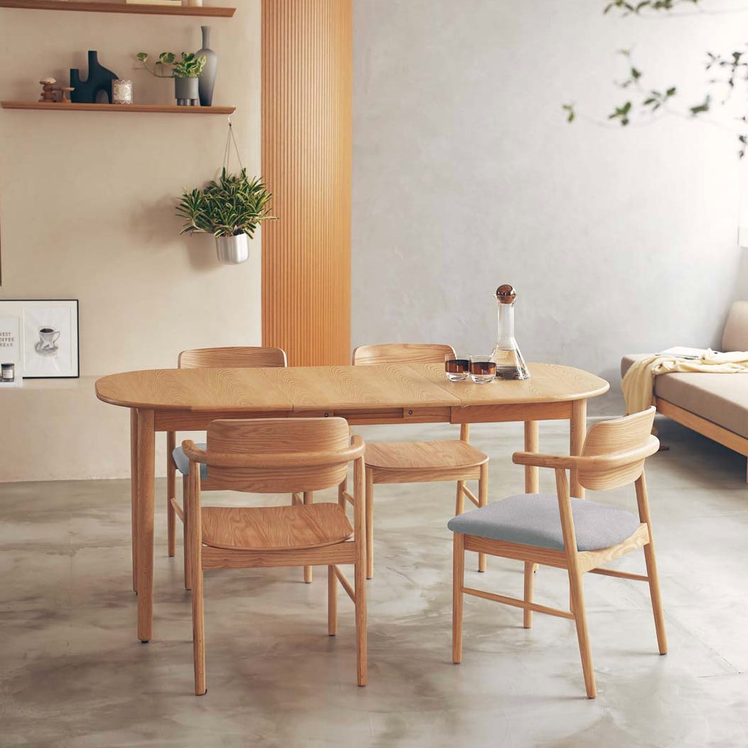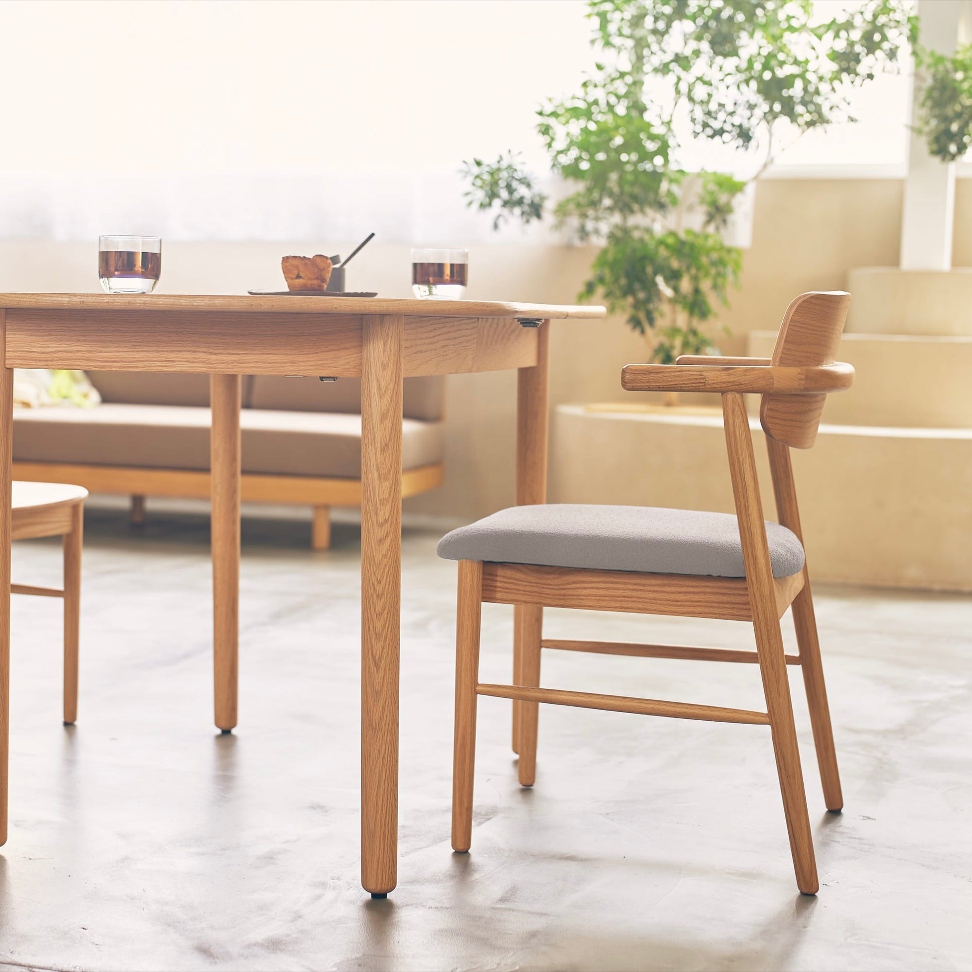 人数やシーンに合わせて形を変えられるので、「普段使い」と「おもてなし」のどちらもこれ一台でカバー。ダイニングとしてはもちろん、会話が弾む団らんの場や、作業スペースとしても活躍してくれる、暮らしに寄り添うテーブルです。