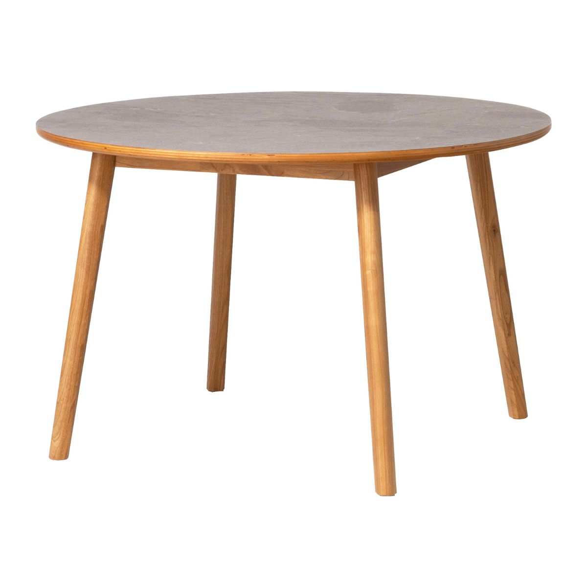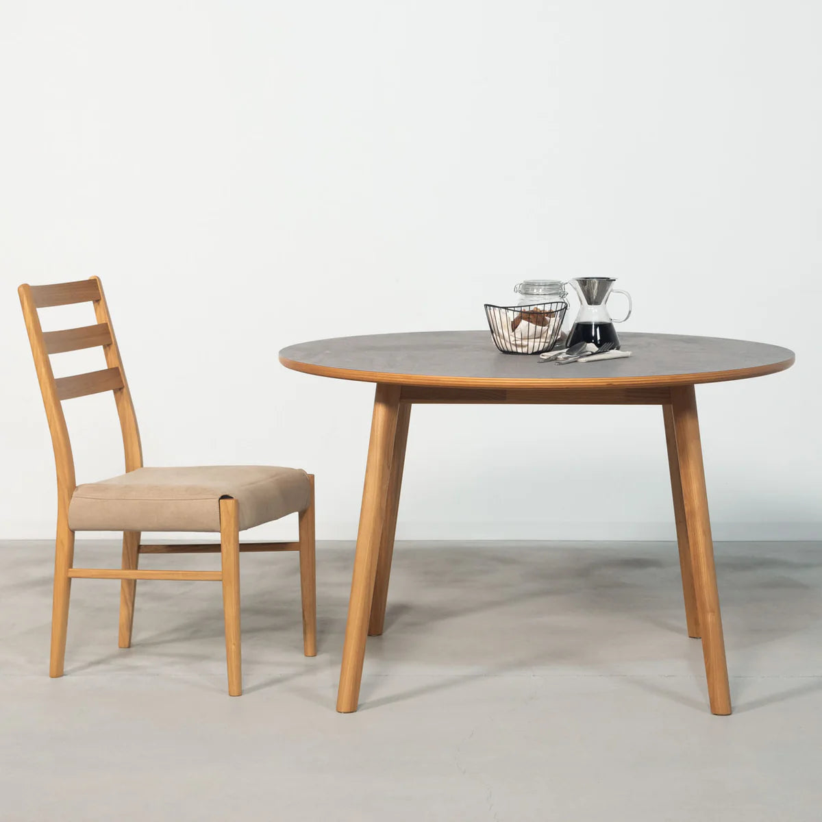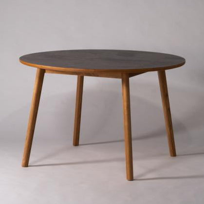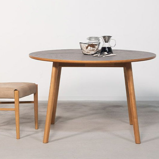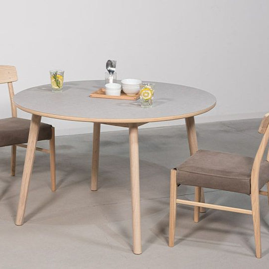 角のない円形デザインが空間にやさしくなじみ、ダイニングをほどよくリラックスした印象にしてくれます。天板にはモルタル調の天板と天然木(スンカイ)を組み合わせて使用し、ウレタン塗装で仕上げています。カラーはナチュラルとブラウンの2色展開です。