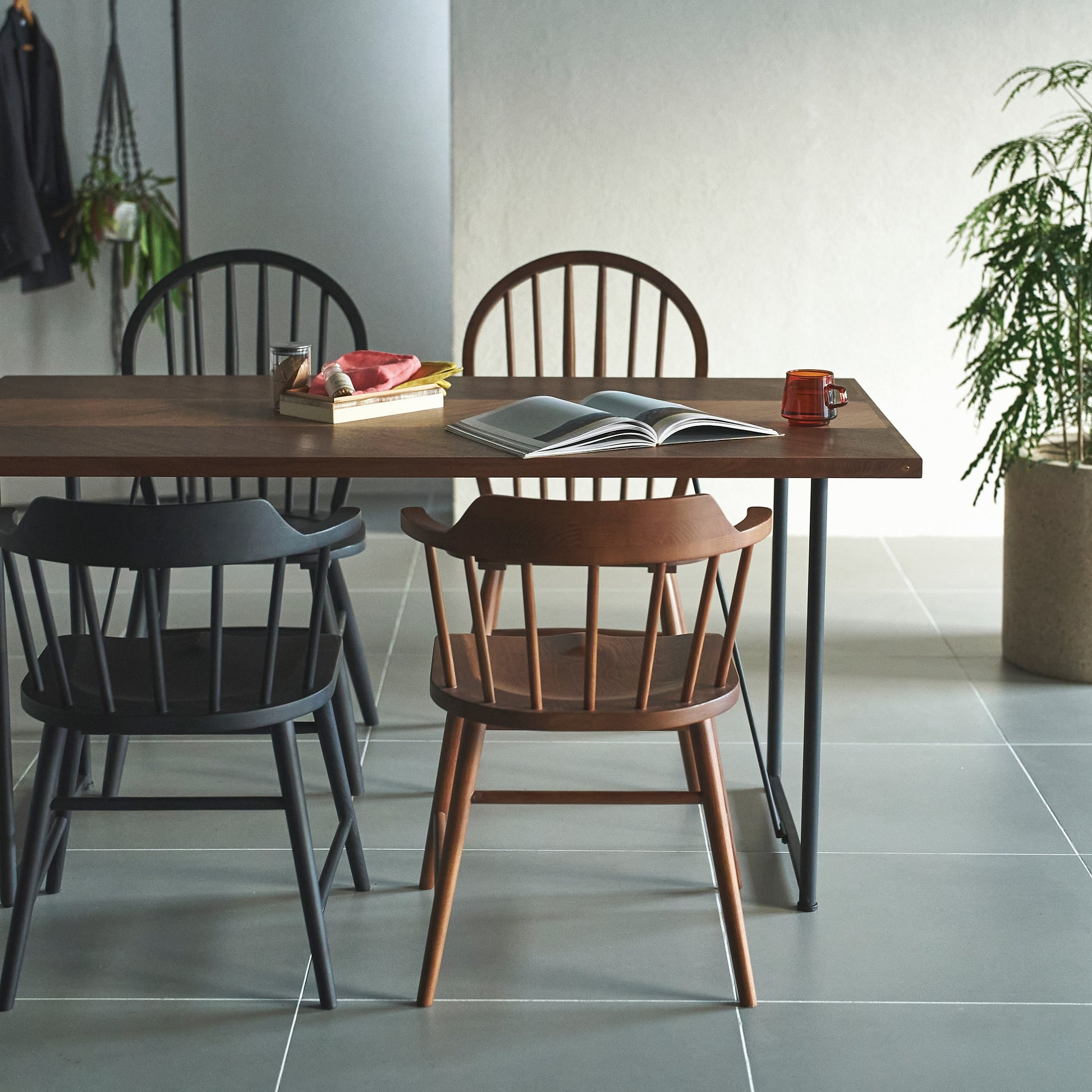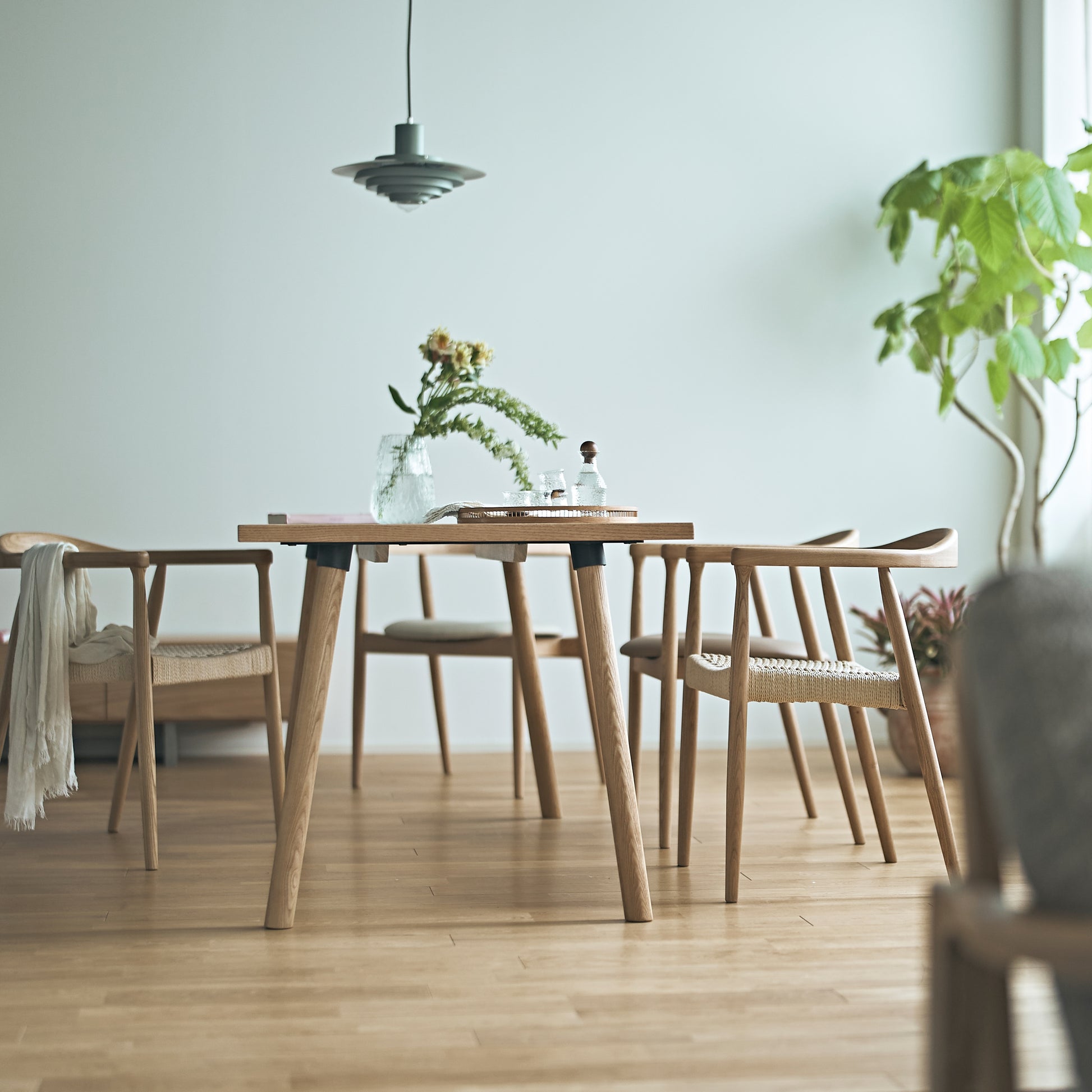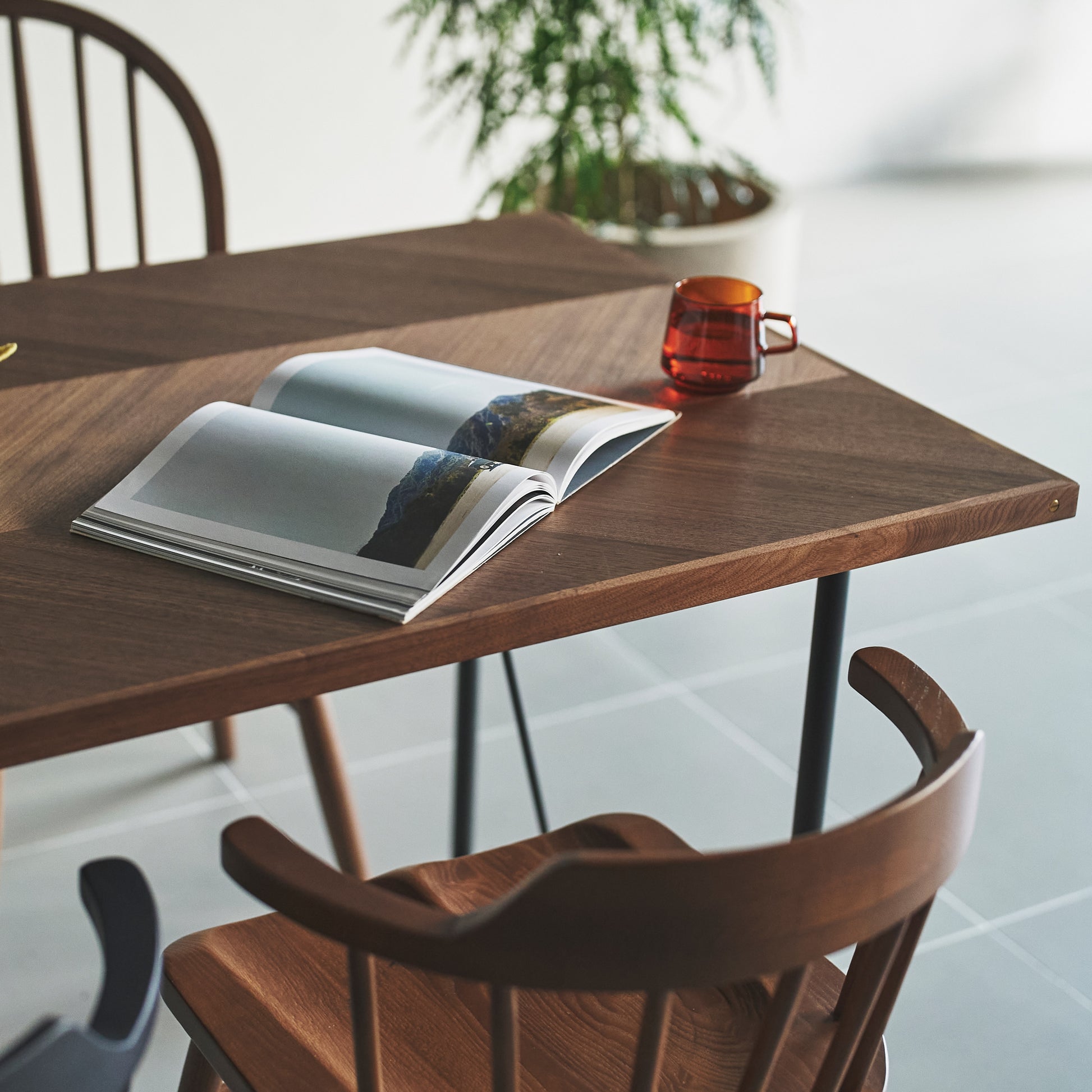 毎日の家族での食事だけでなく、ノートパソコンや資料を大きく広げるデスクワークの作業台としても重宝します。幅にゆとりがあるため、来客時に大皿料理を並べるホームパーティーの際も、隣との距離を気にせず使えます。天板のデザインが特徴的なので、シンプルな椅子と合わせるだけで部屋の印象が整います。
