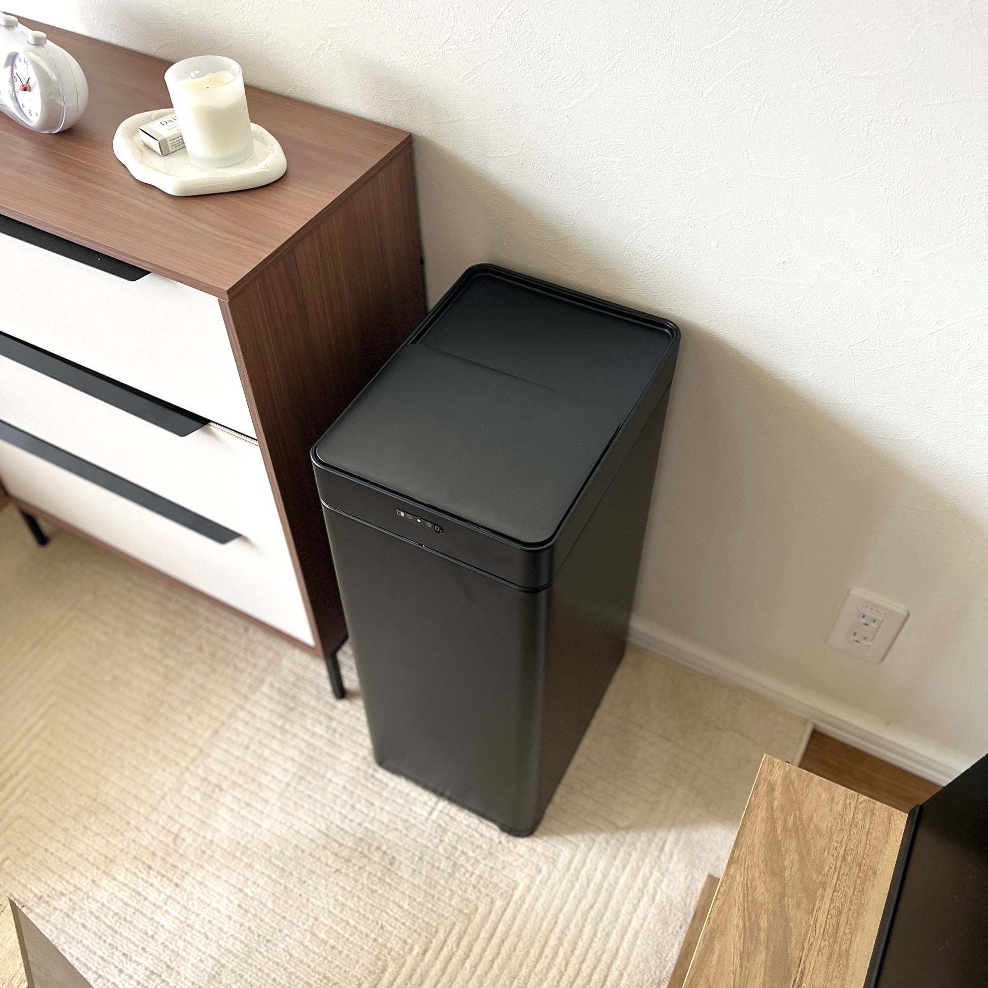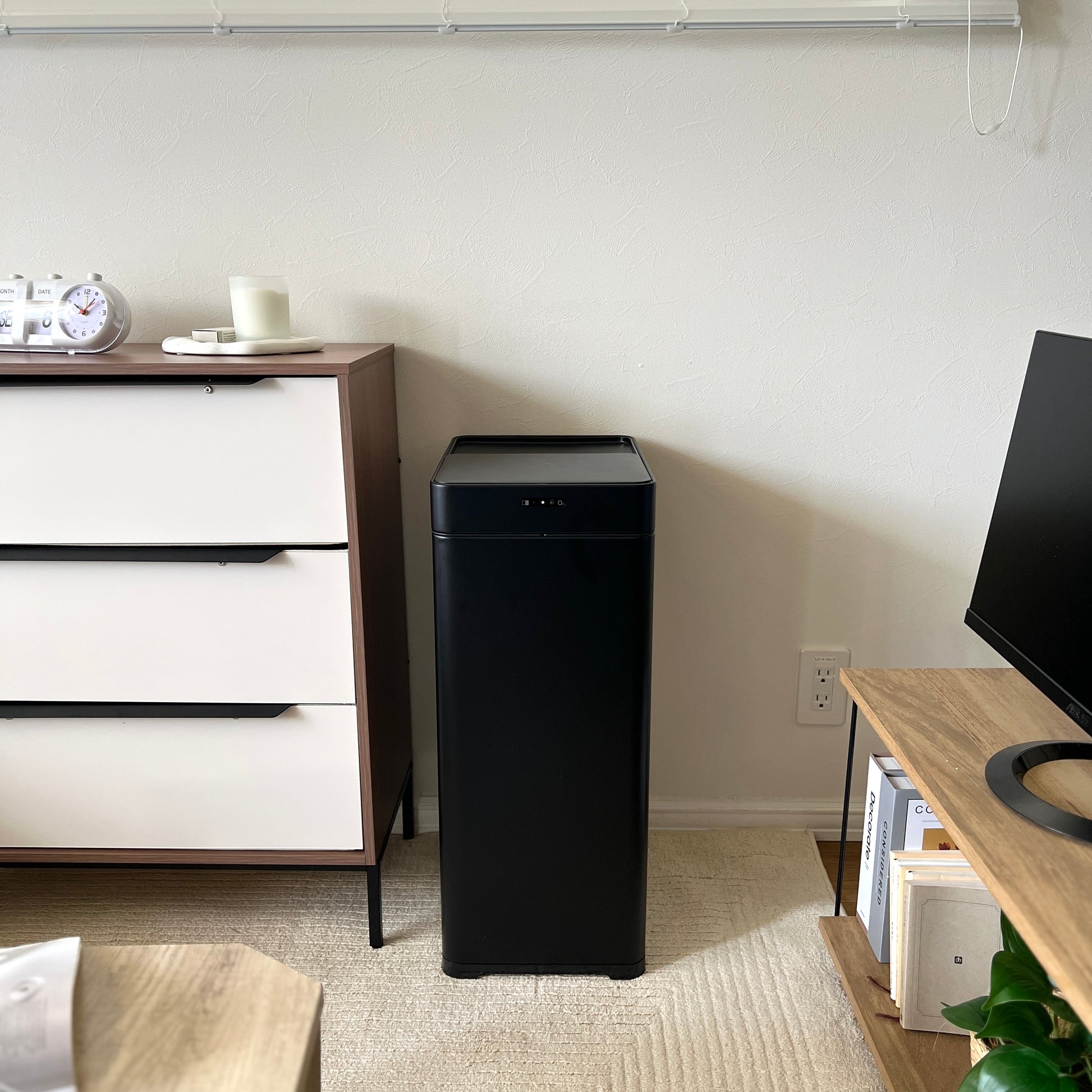 シンプルなデザインで生活空間にすっと馴染み、ホワイトとブラックの2色から選べます。大容量タイプなので、こまめなゴミ捨ての手間も減らせます。センサー感知距離は3段階で調整できるので、設置場所や使い方に合わせて設定可能です。
