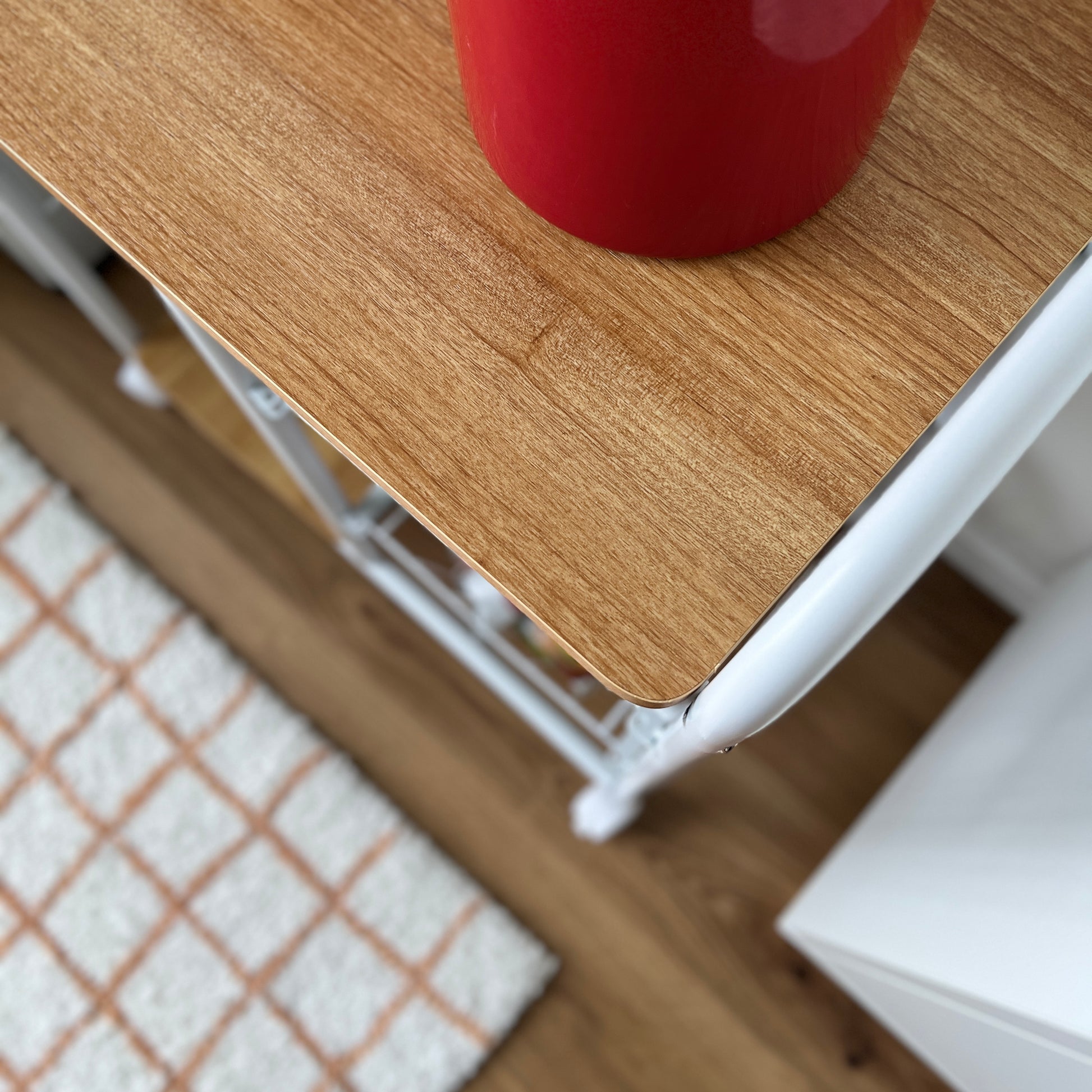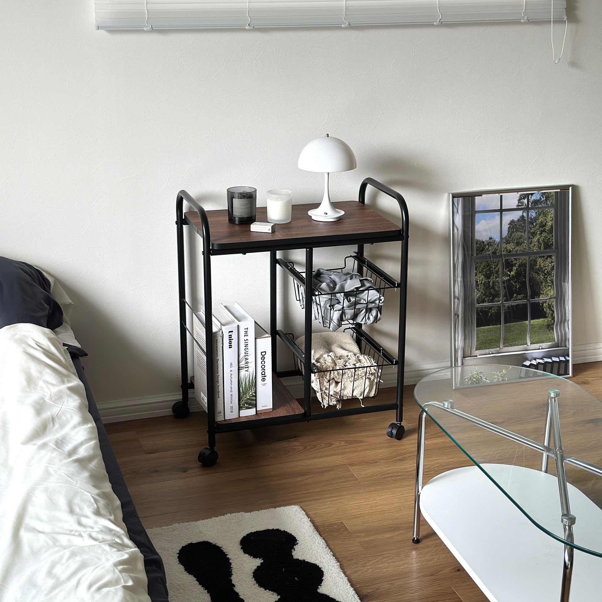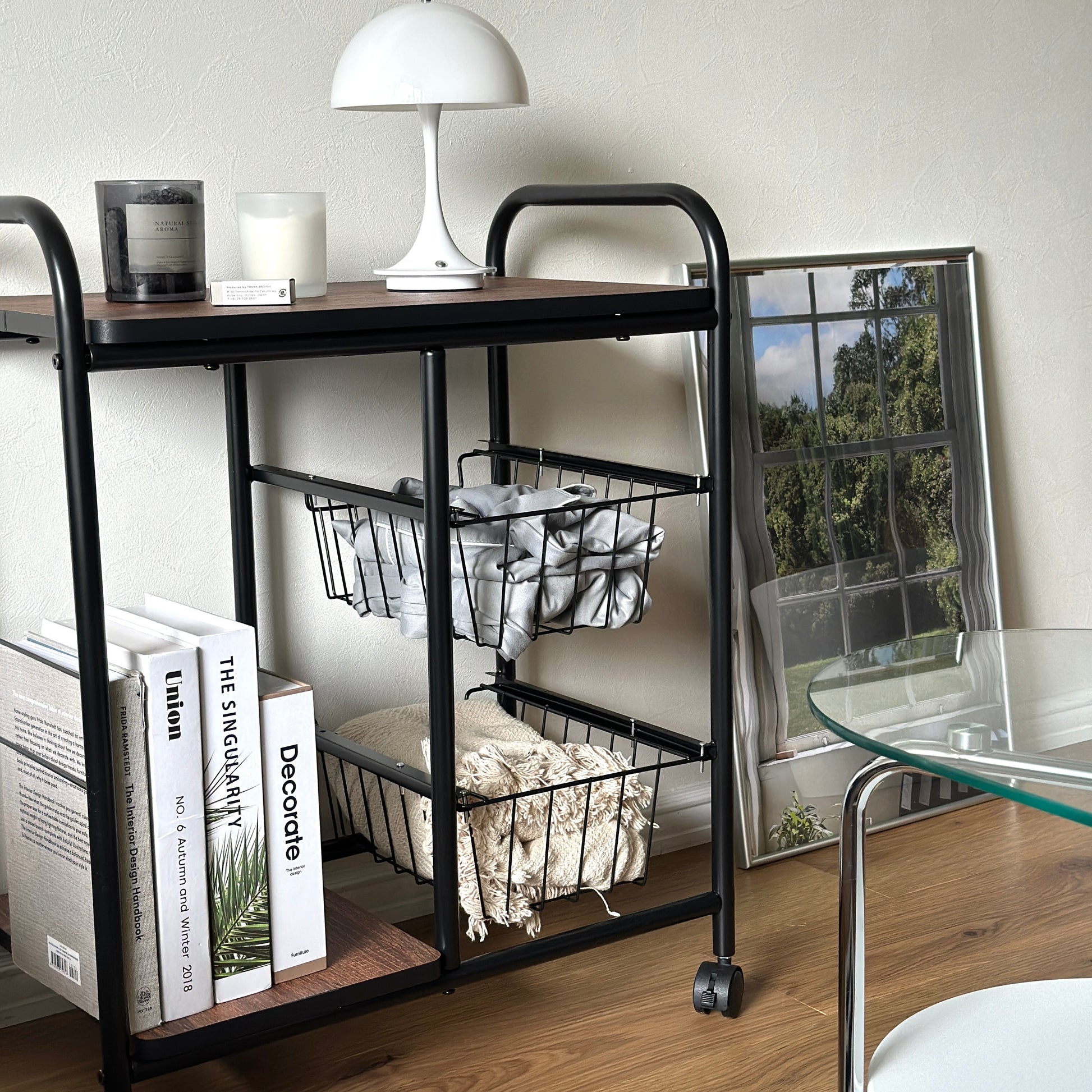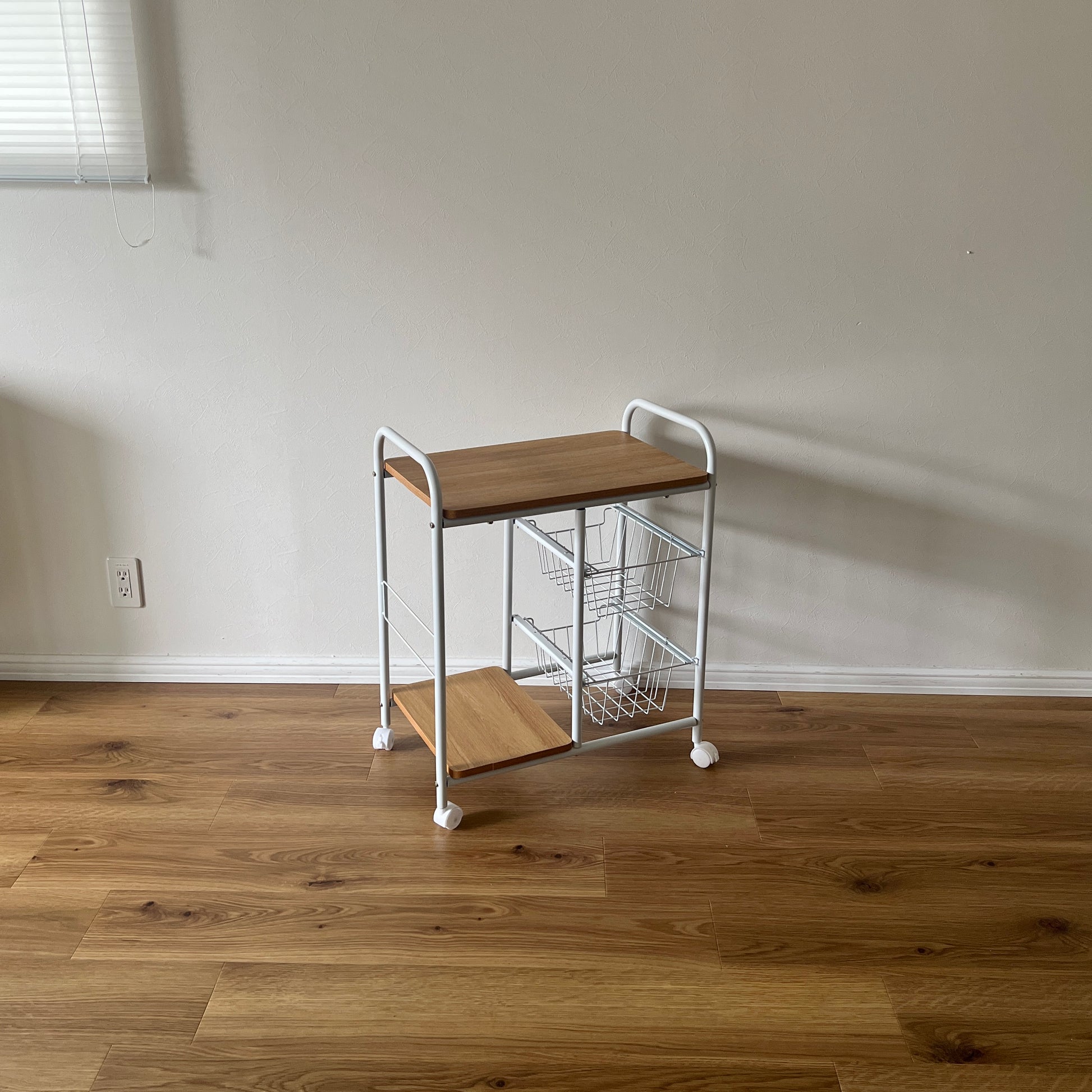 木目の天板とスチールフレームを組み合わせた、すっきりとしたデザインのキッチンワゴン。