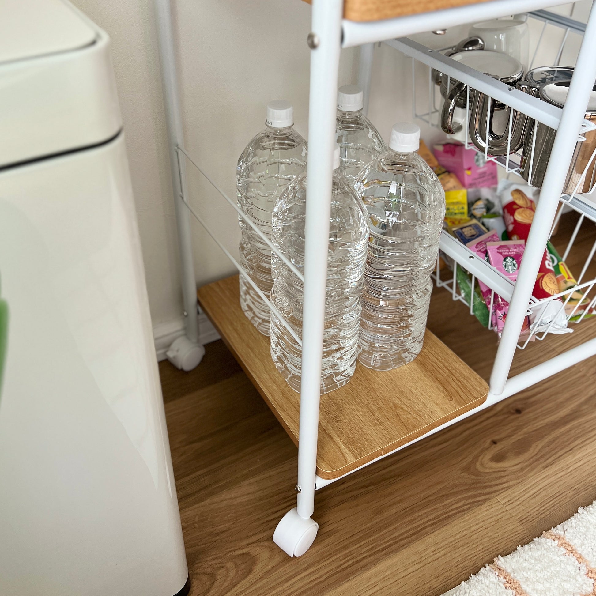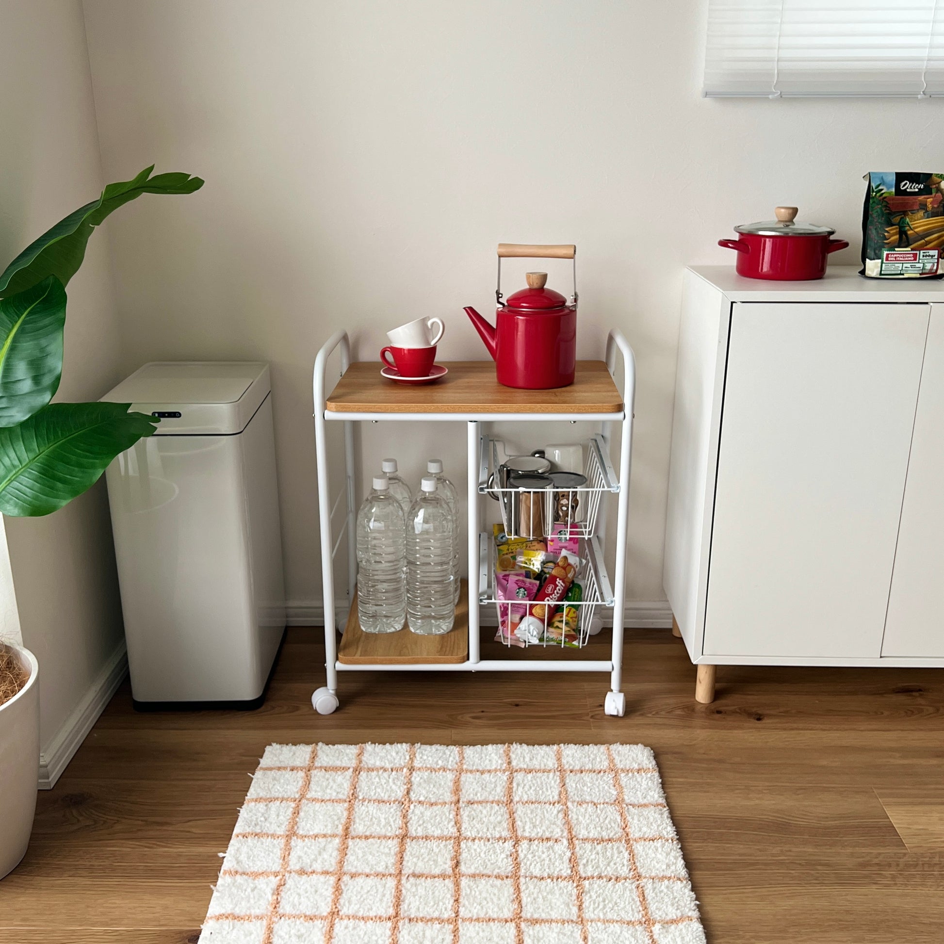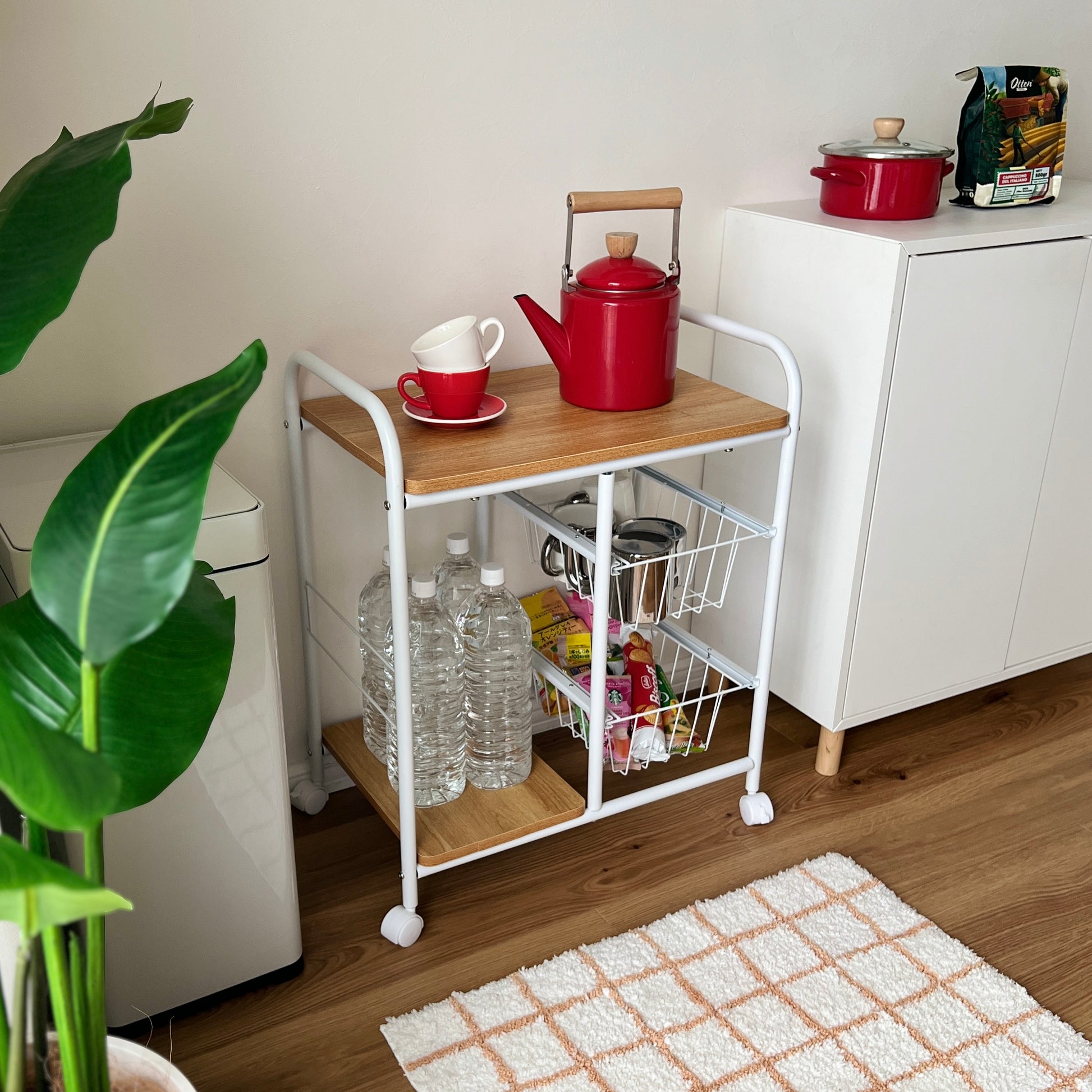キッチンでは食器や食品ストックの整理に、ダイニングでは飲み物や調味料の収納に、リビングではサイドテーブル代わりとしても活躍。高さのあるボトル類などもすっきり収まります。