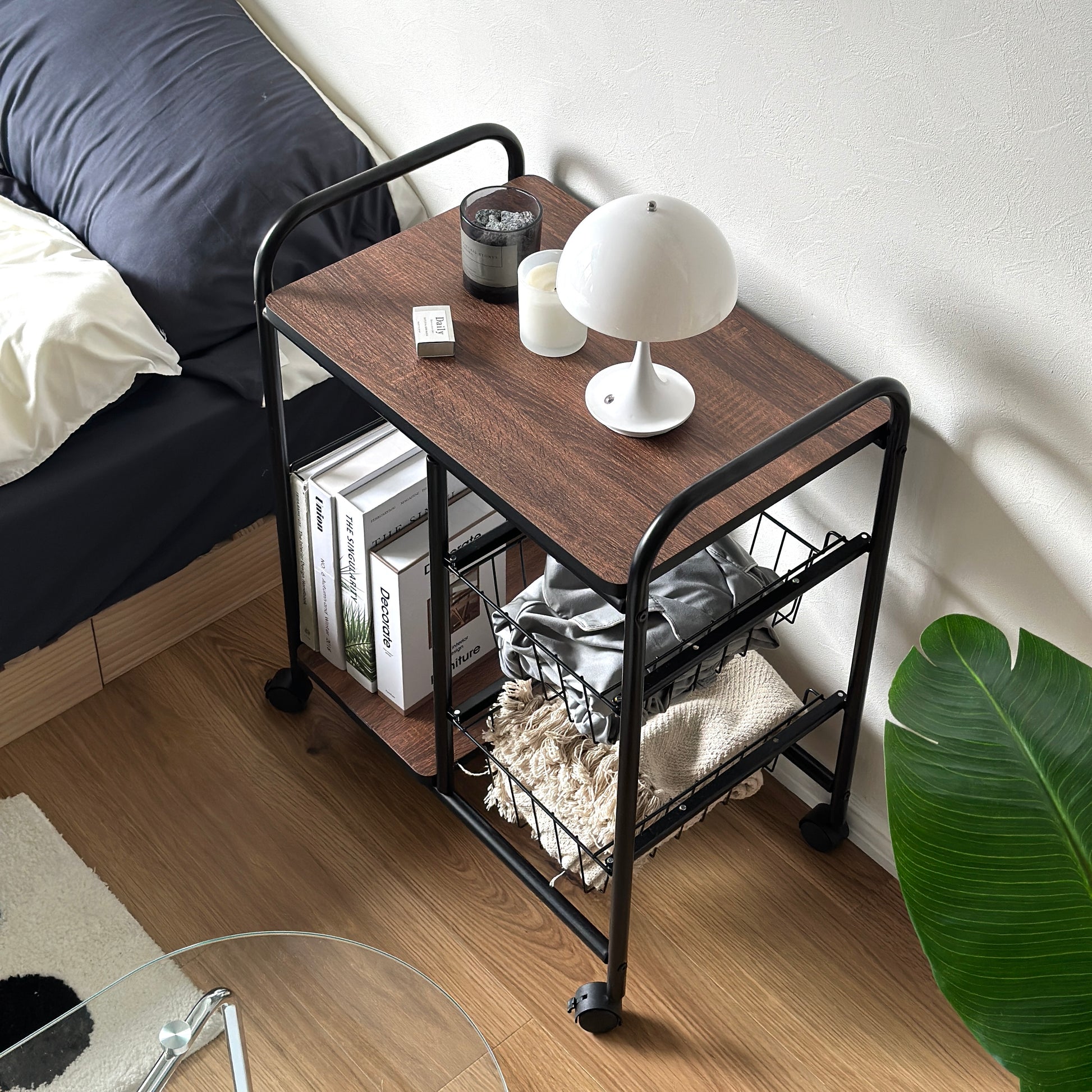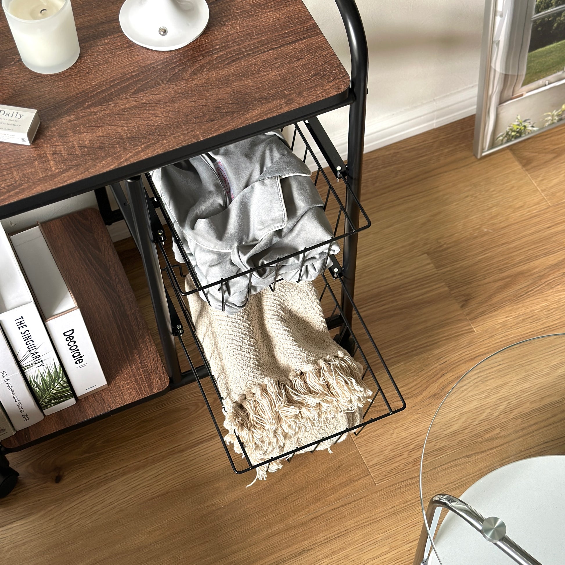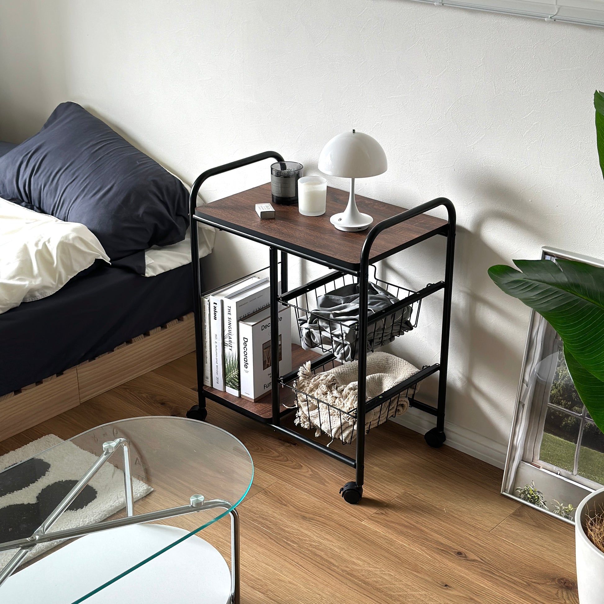 スライド式のバスケットとキャスター付きの設計で、収納力と使いやすさを両立しています。