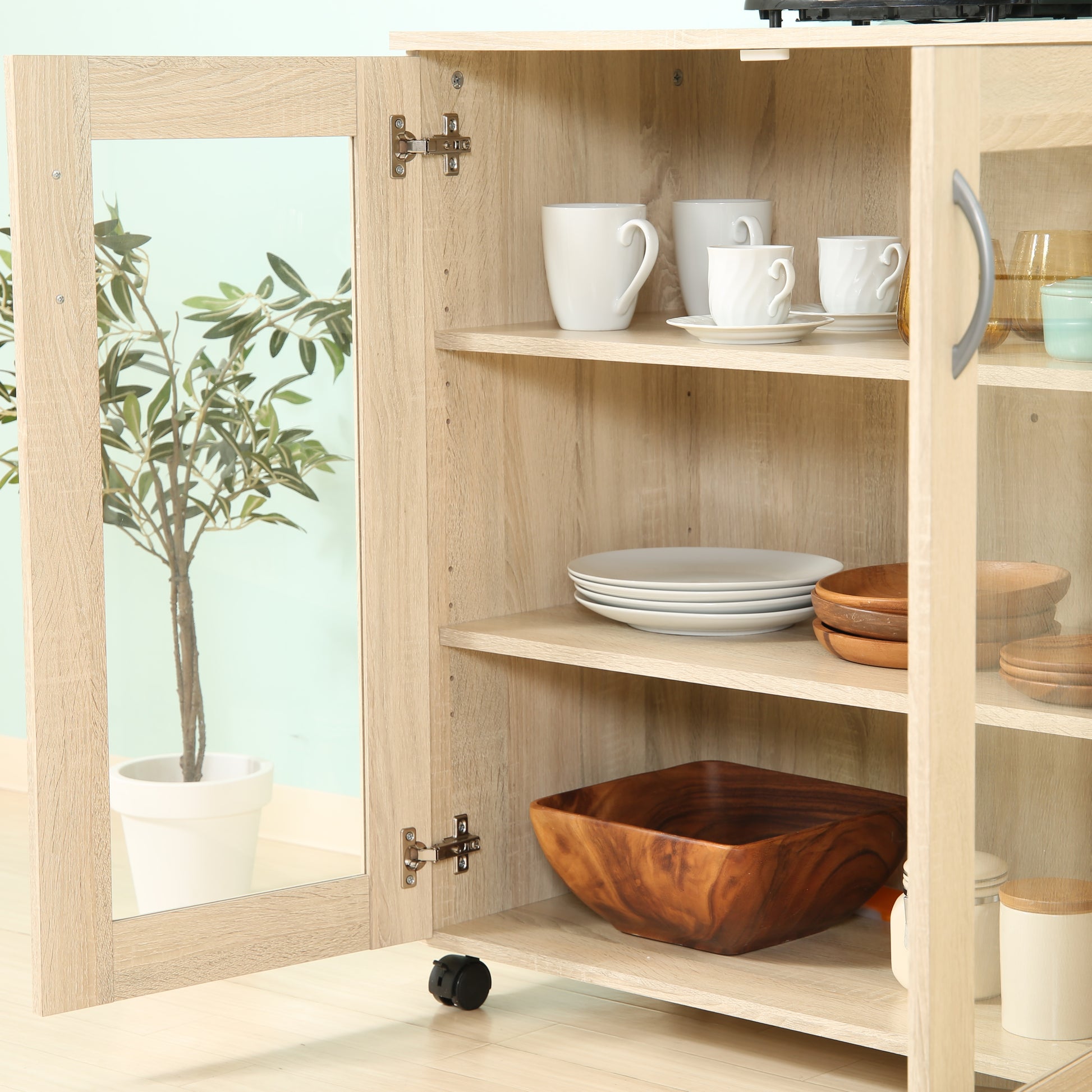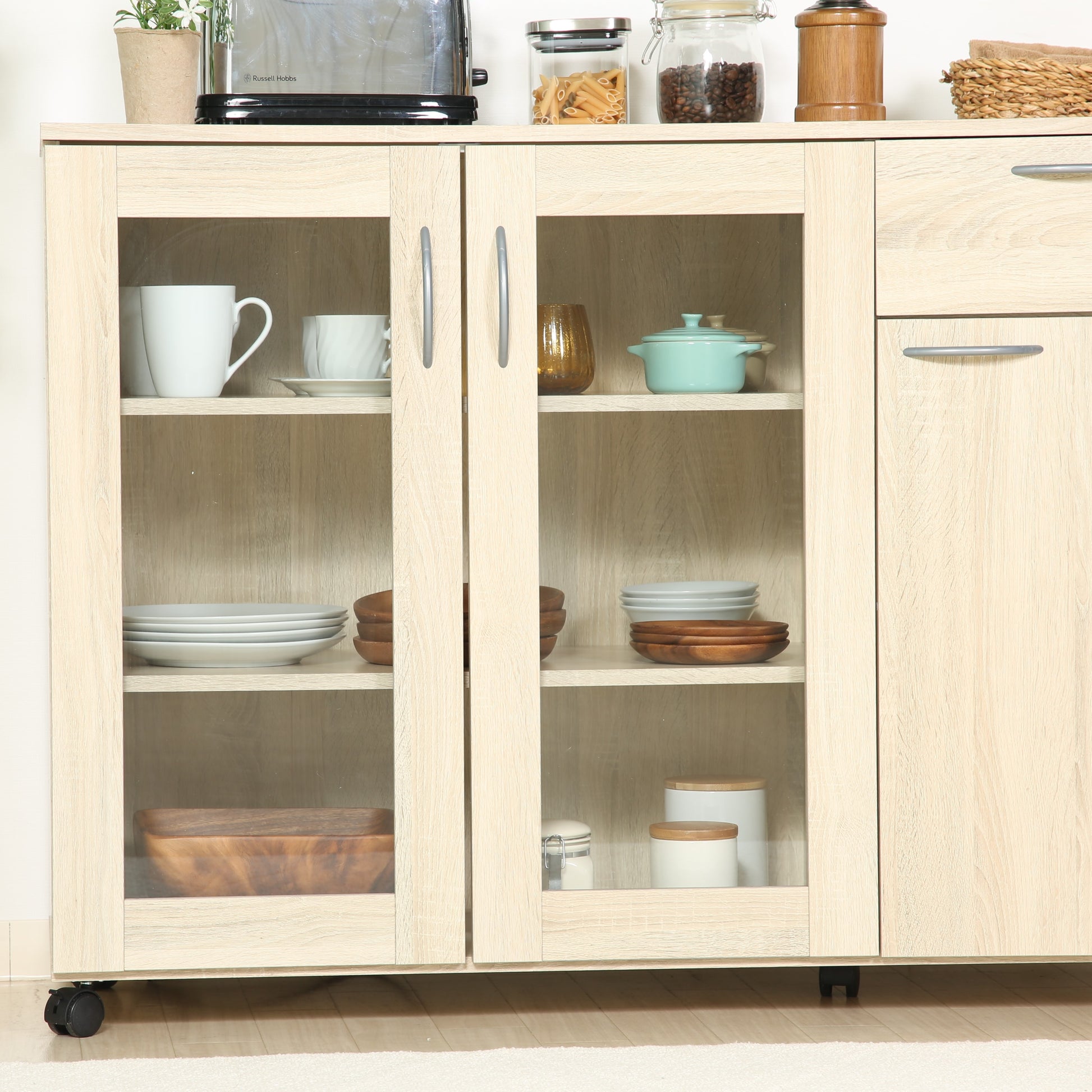 収納スペースは、中身が確認しやすいガラス扉付きと、細々としたものを隠して収納できる引き出しに分かれています。キャスターにはロック機能があるため、家電を載せて使う際も安定して固定できます。シンプルなデザインと実用的な機能を備えているので、暮らしのスタイルが変わっても長く使い続けられる道具です。