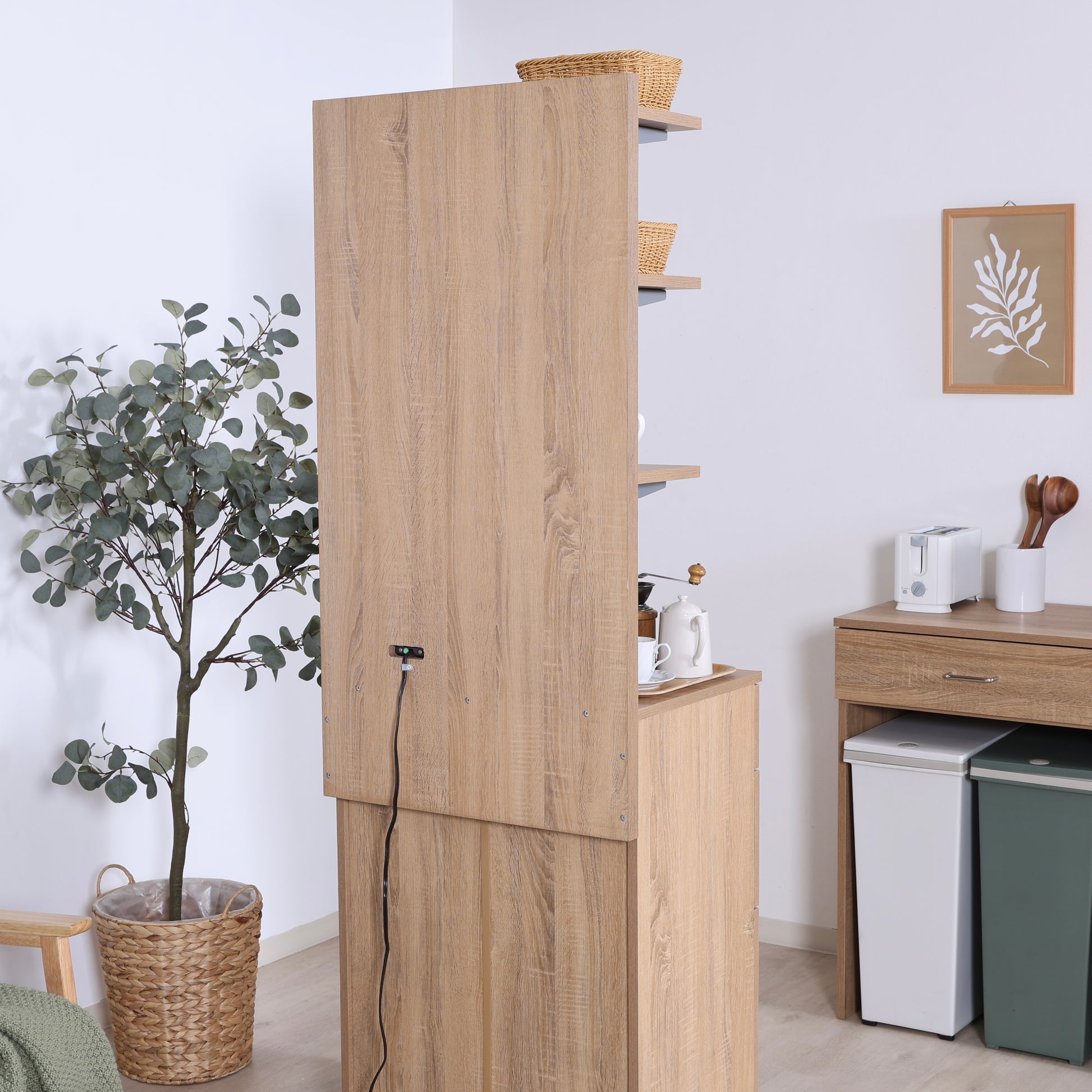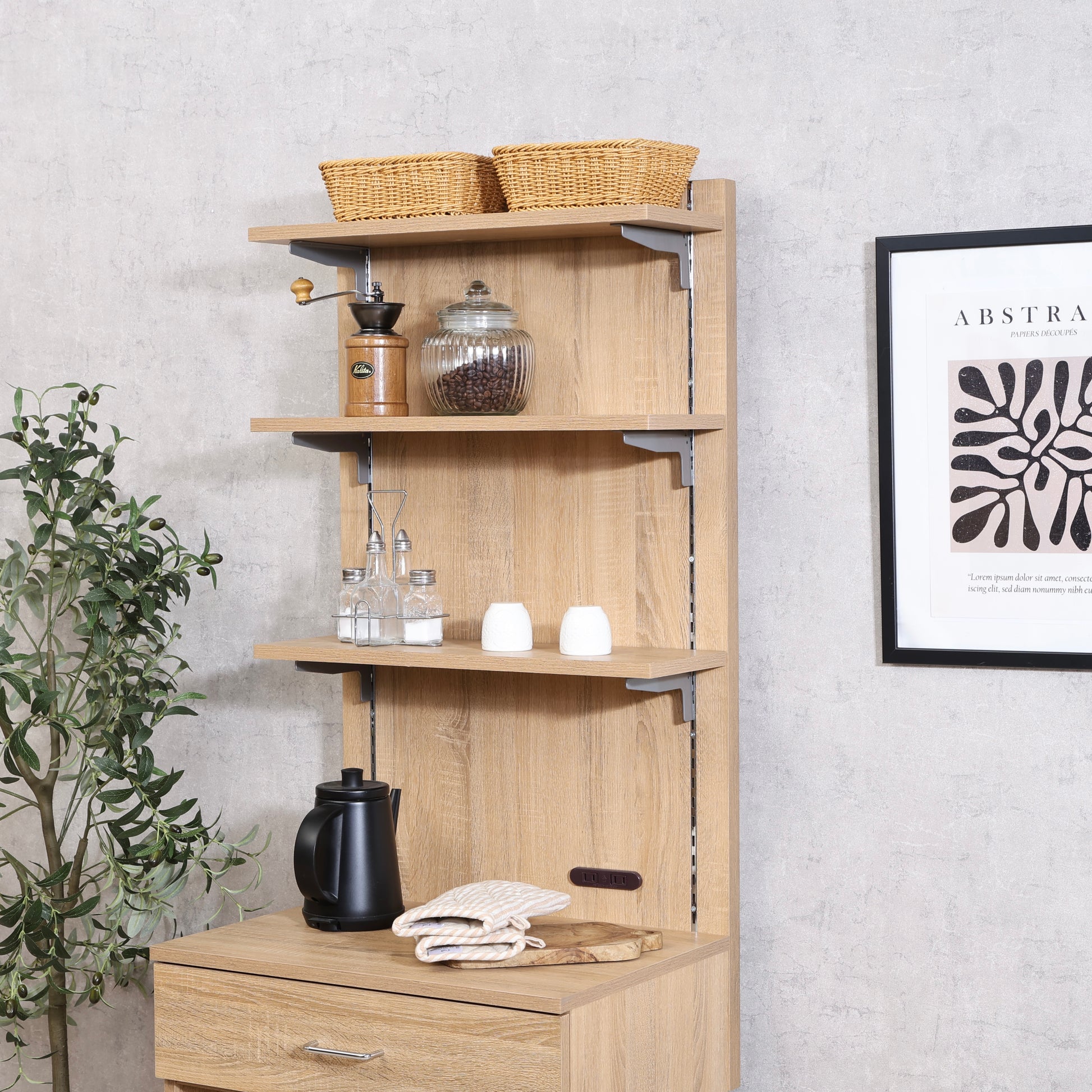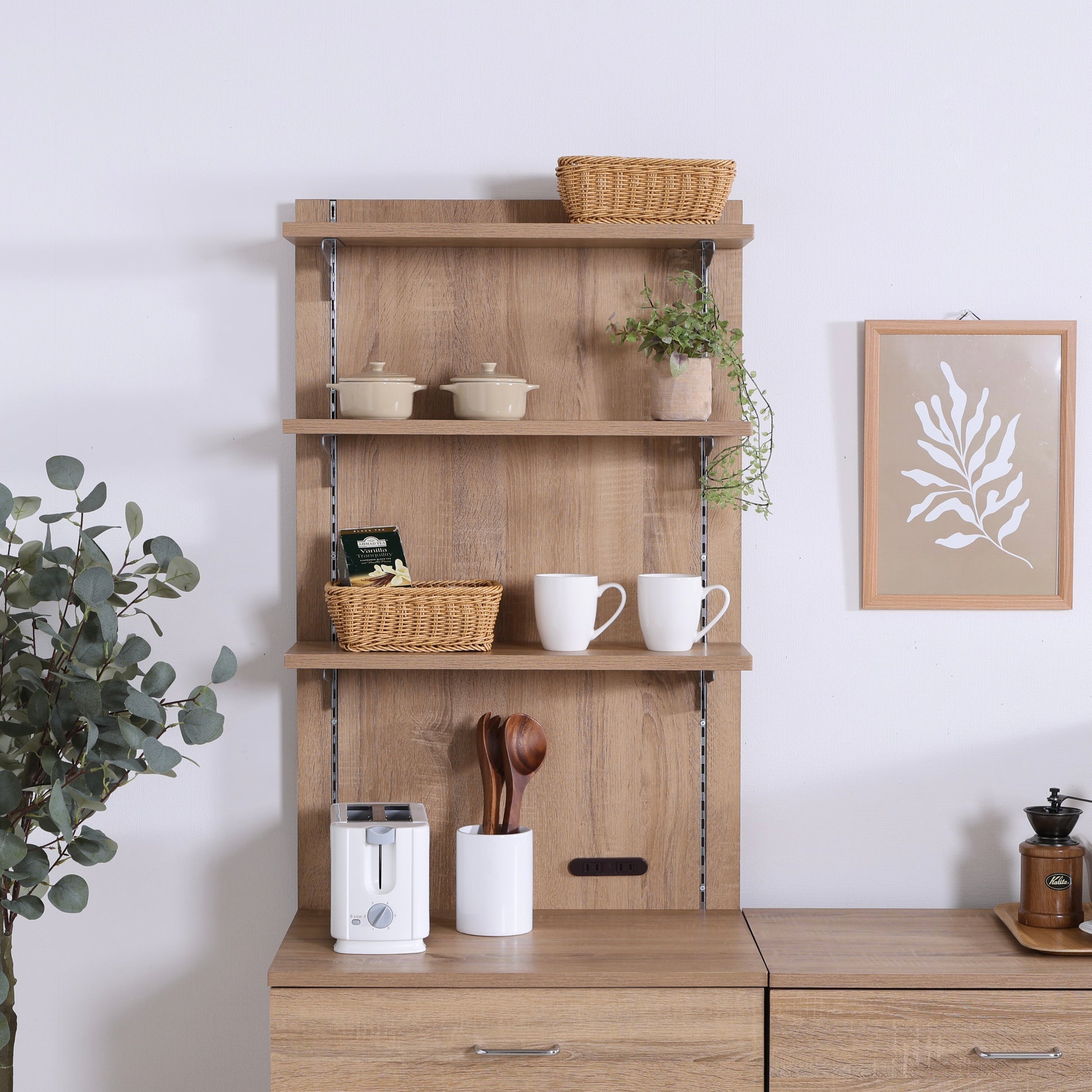 便利なのが、二口コンセント付きという点。コーヒーメーカーや電気ケトルなどの小型家電を使う場所としても活躍し、作業動線がスムーズになります。家電の横にマグやストックをまとめて置いておけば、朝の支度もより快適に。