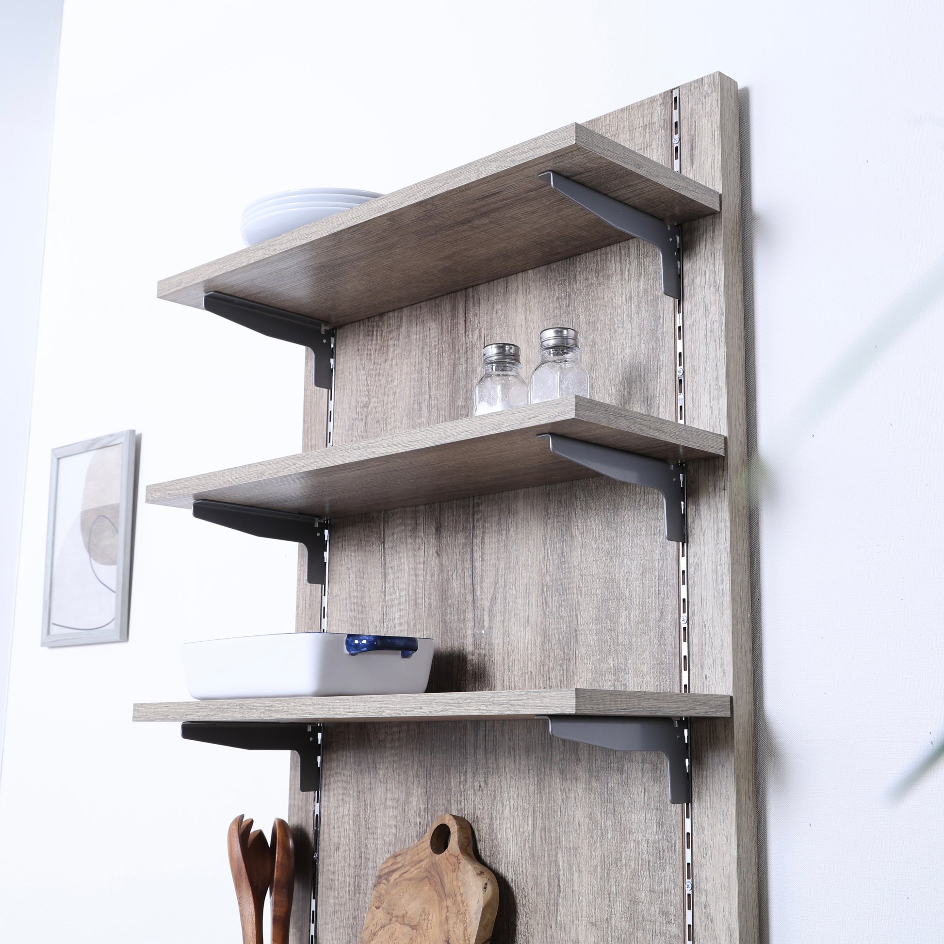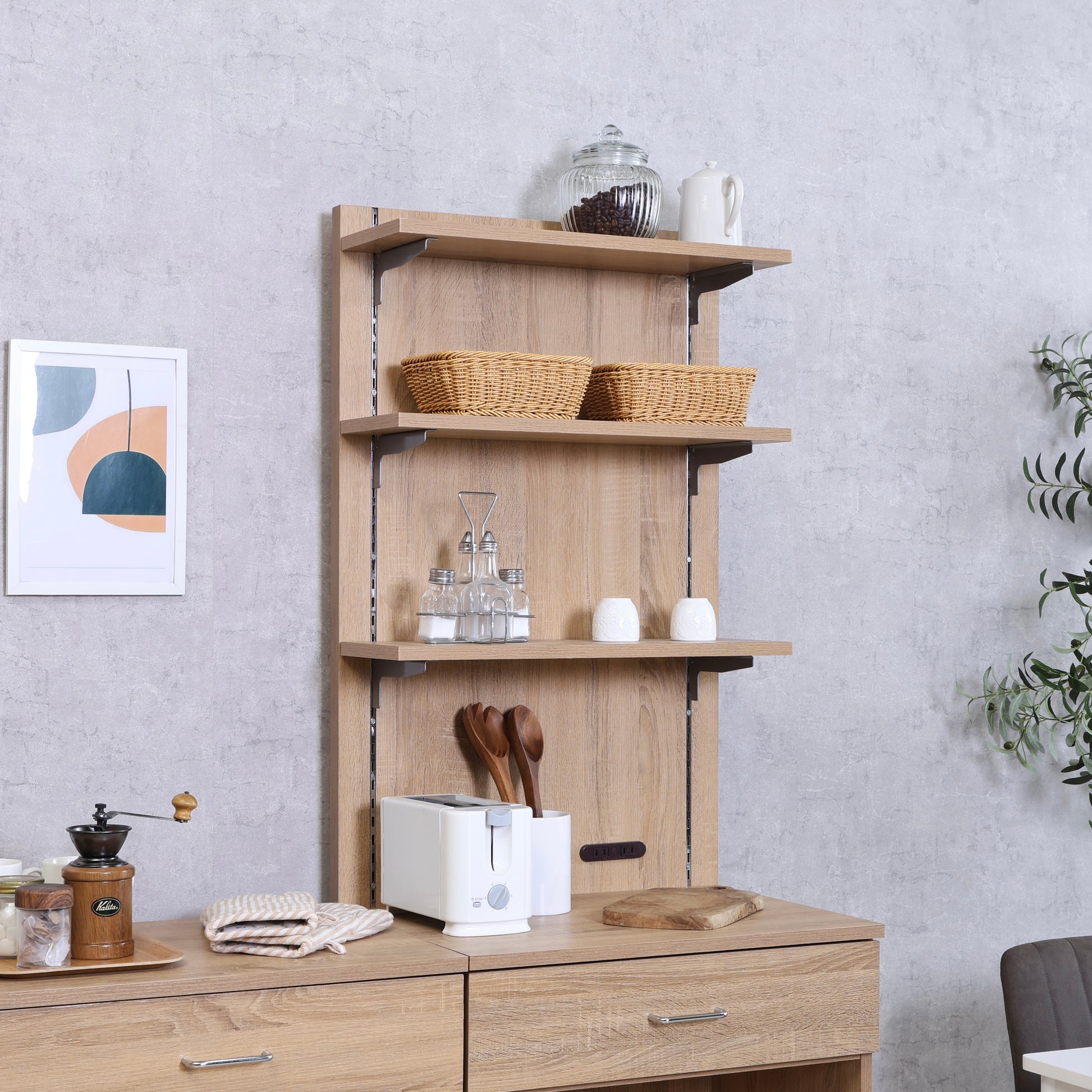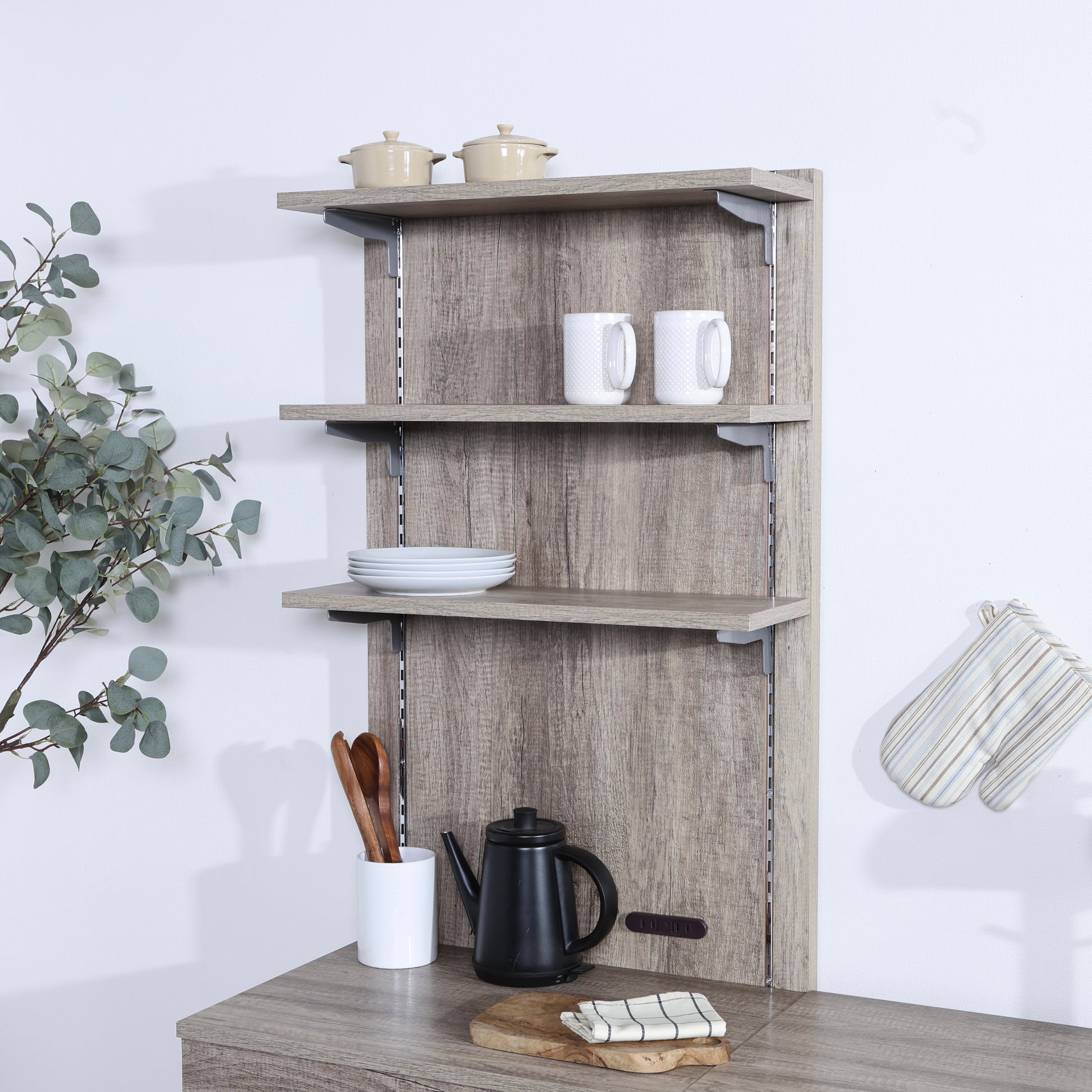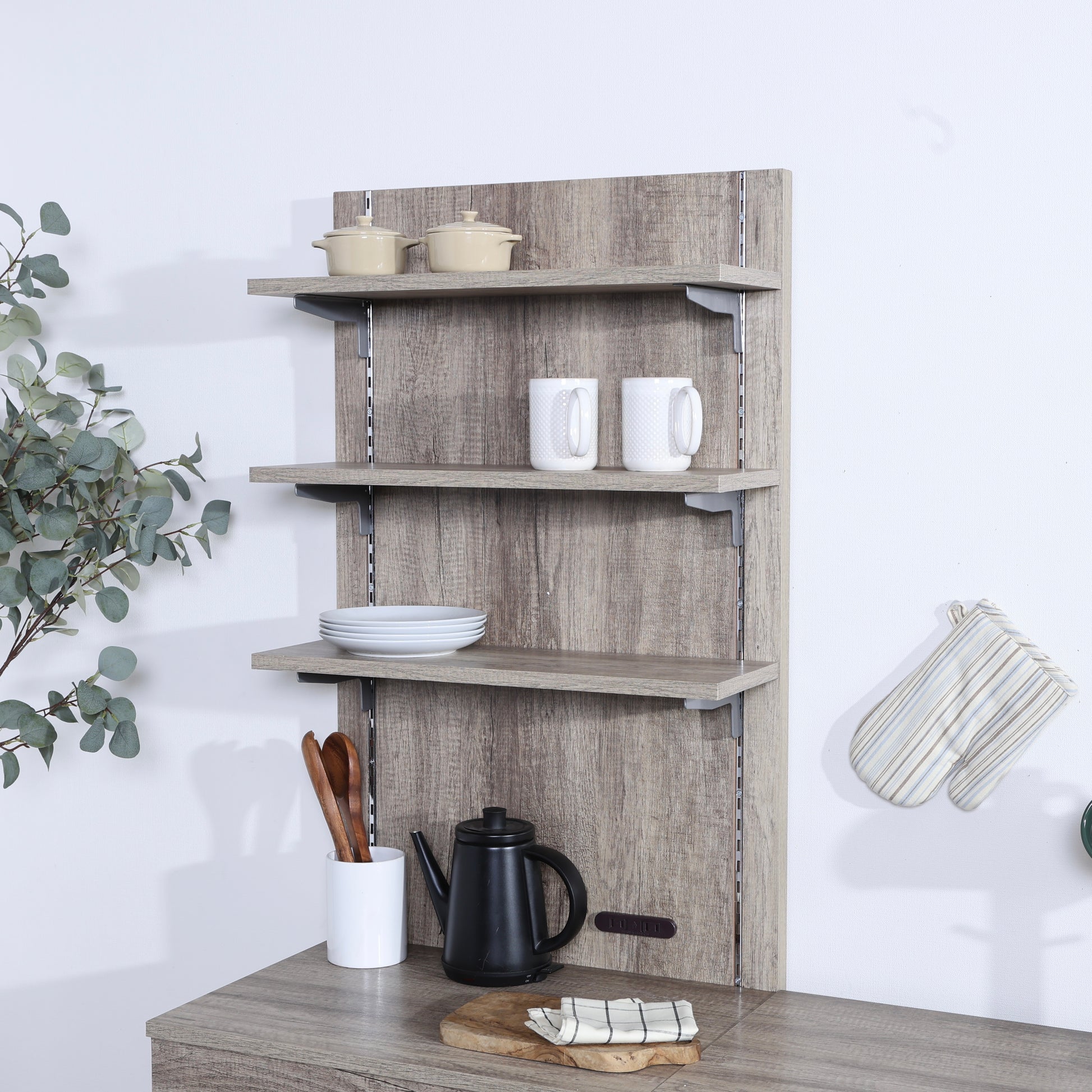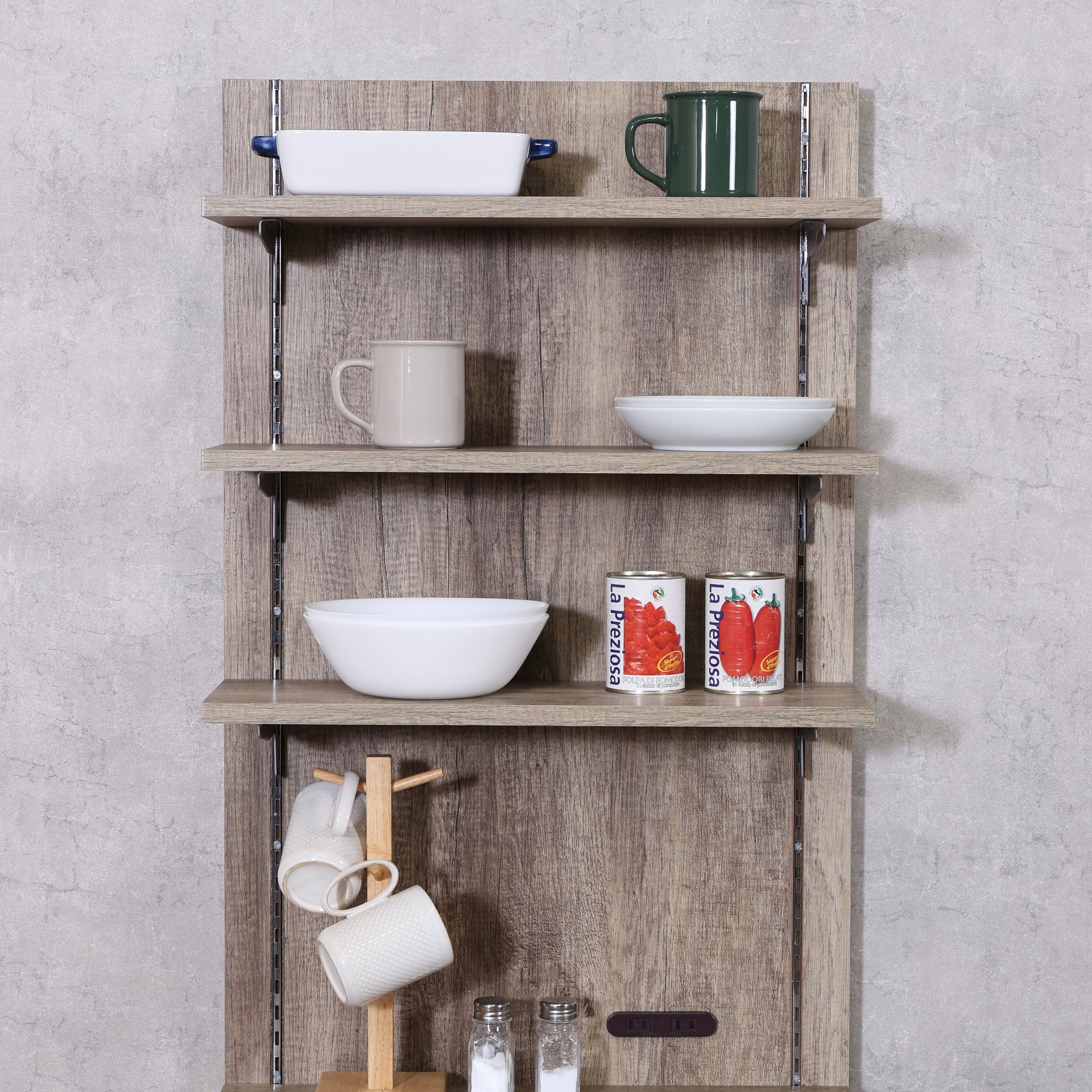 棚板は可動式なので、置きたいものの高さに合わせて調整が可能。マグカップや調味料、食器はもちろん、ちょっと背の高いボトル類も無理なく収納できます。背面に取り付ければ、限られたスペースを上手に活かしながら、手に取りやすい収納が完成します。