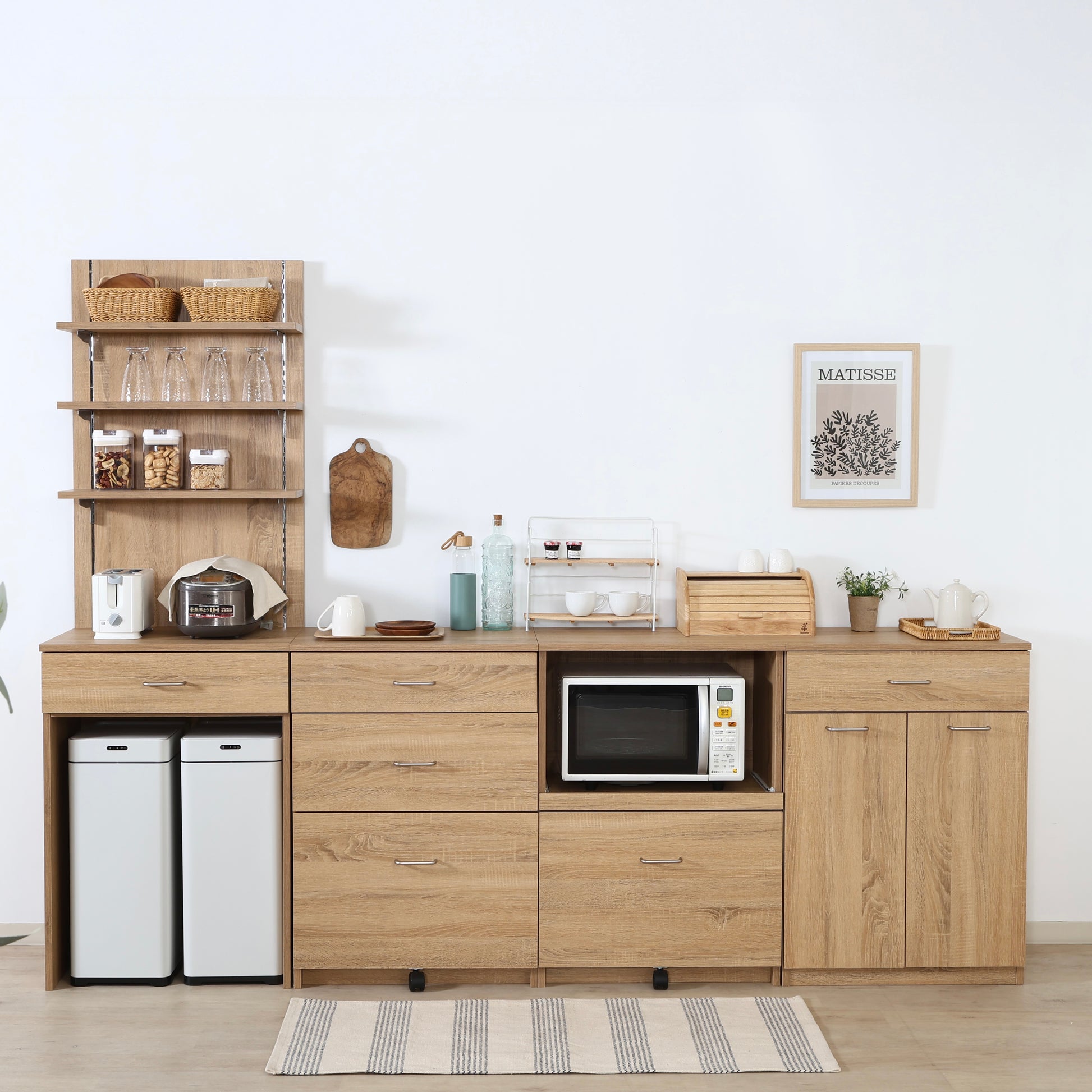 ユニット収納シリーズにプラスするだけで、使い勝手がぐっと広がるバックボードです。ナチュラルな木目がやさしい印象で、キッチンやダイニング、リビングにもすっと馴染みます。カラーはナチュラルとグレーの2色展開。お部屋の雰囲気や家具に合わせて選べます。