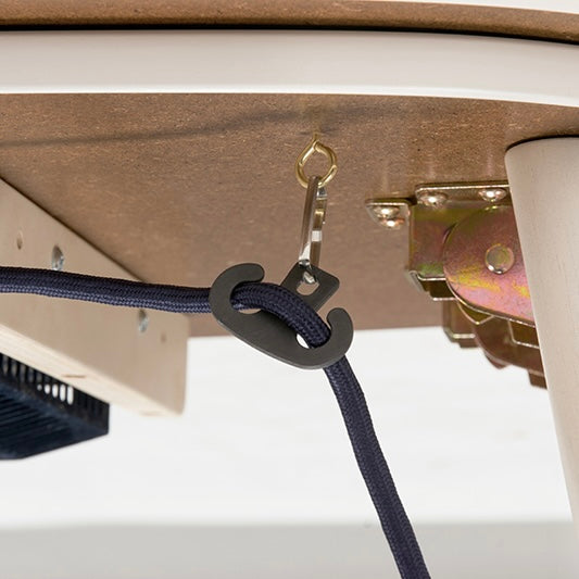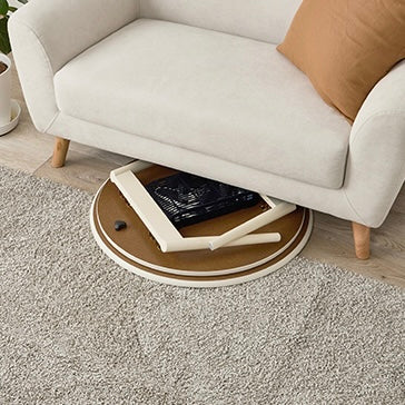 床に座ってのパソコン作業や読書にも使いやすい高さです。使わないときは折れ脚仕様でコンパクトに収納でき、天板と布団は固定できるので、使用中のズレも気になりません。電源コードを引っ掛けられる工夫もあり、見た目もすっきり。