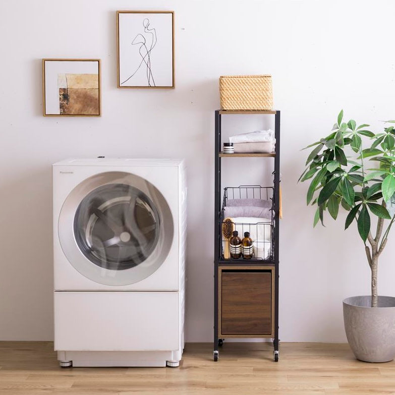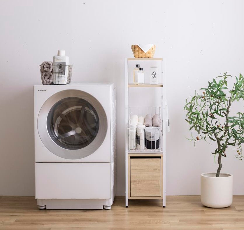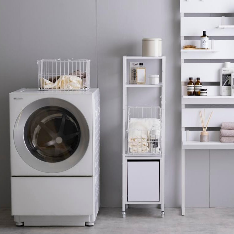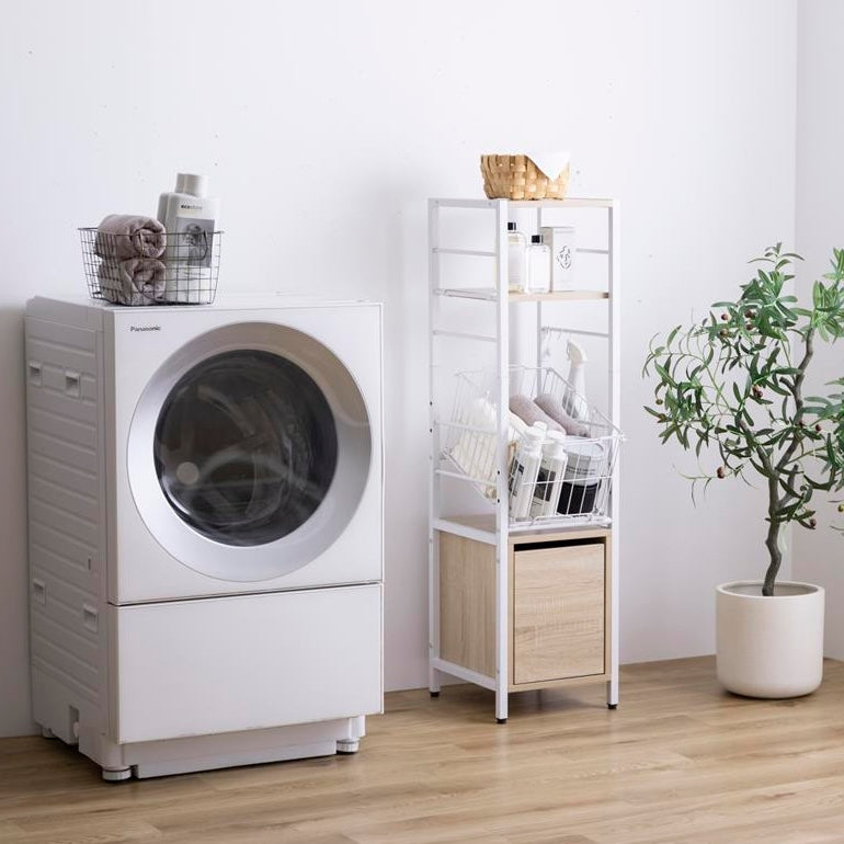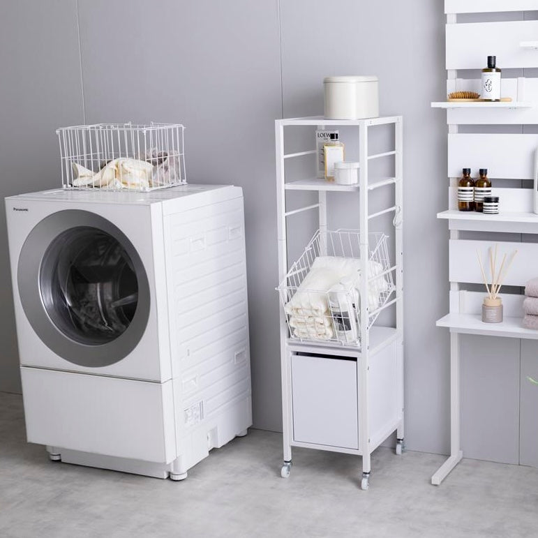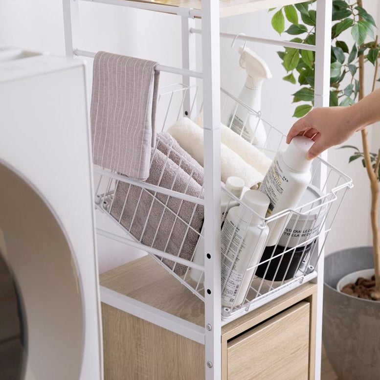 洗濯機横ではランドリー用品をまとめて収納でき、棚板には洗剤や柔軟剤を置けます。引き出しにはタオルやストック品を整理でき、バスケットには洗濯物を入れてそのまま運べます。脱衣所ではタオル収納や一時置きとしても使え、必要な物を手の届く位置にまとめられます。