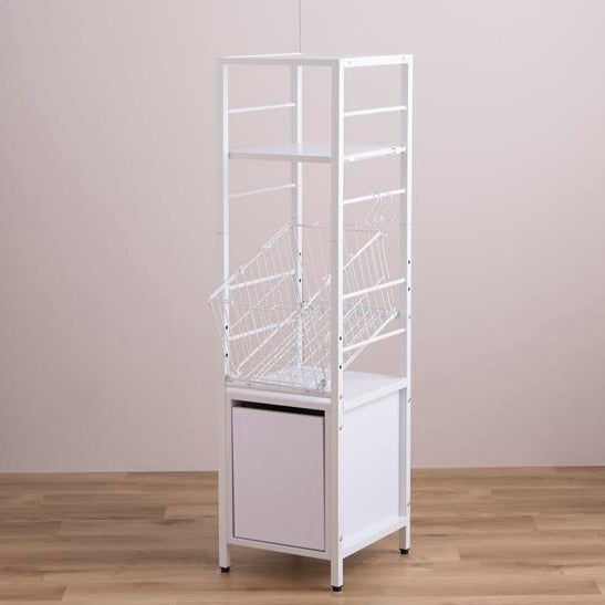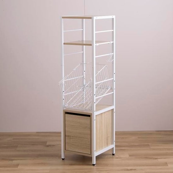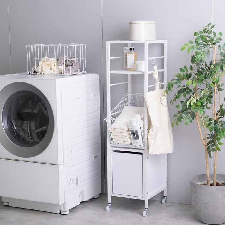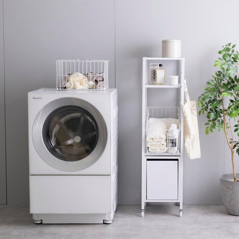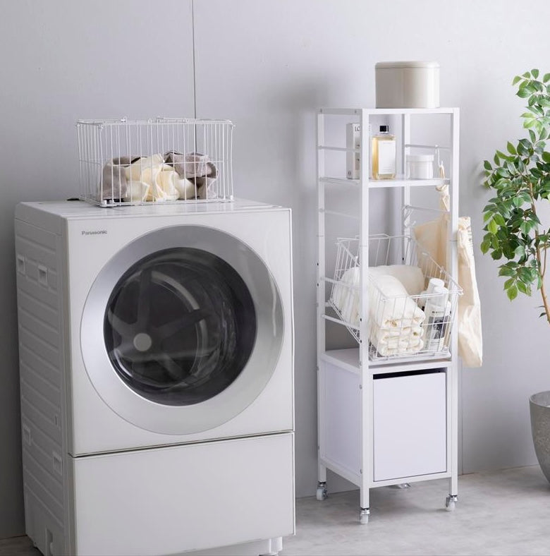 洗面所や脱衣所に置きやすい幅32cmのスリム設計です。スチールフレームを使ったシンプルな構造で、洗濯機の横や空いたスペースに無理なく収まります。室内での移動や配置替えもしやすいサイズ感です。